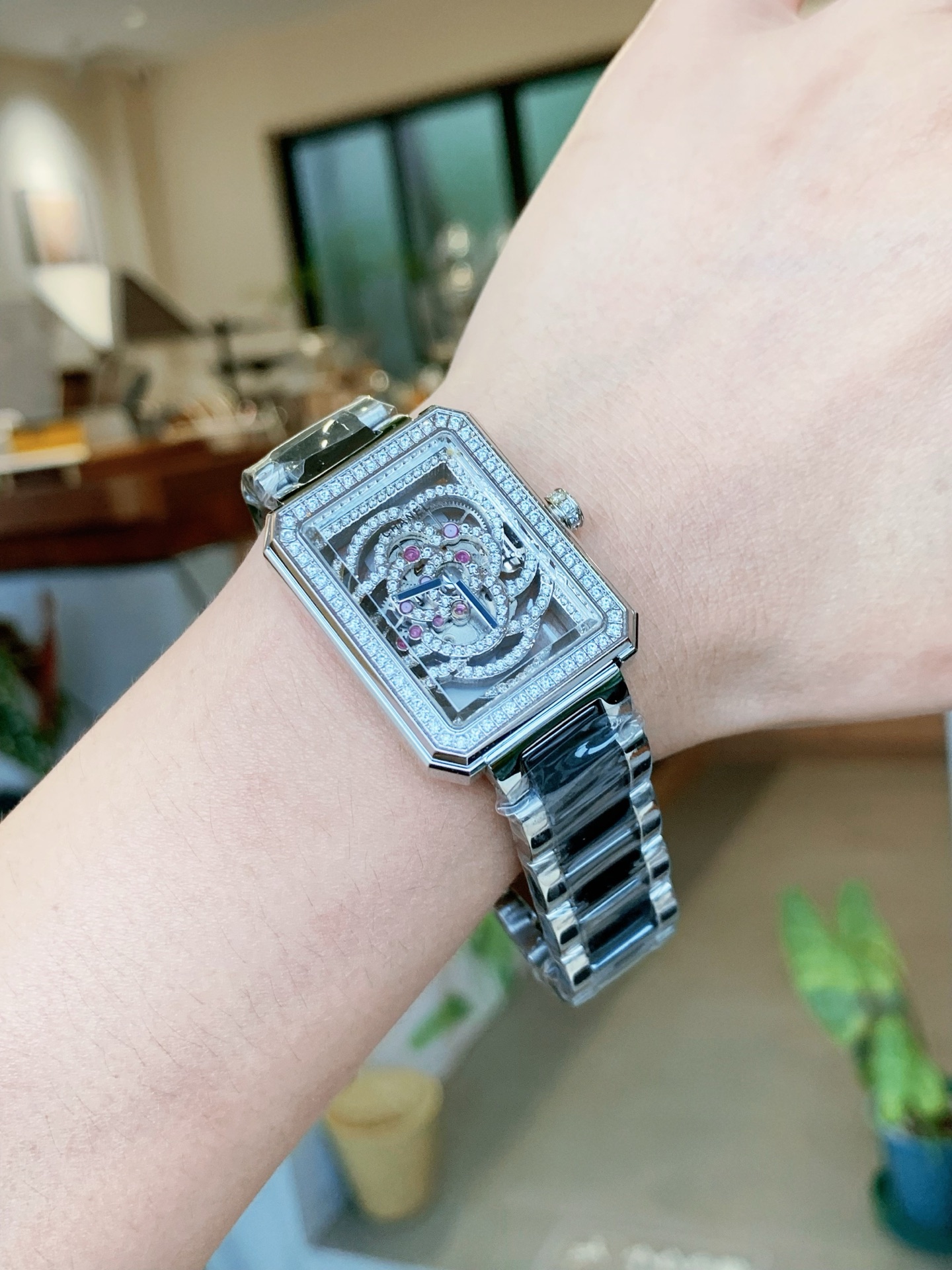 中空で透明なカメリアムーブメントを採用しており、カメリアにはマイクロインレイ技術が採用されています 。カメリアの形をしたマイクロ装飾が施されています。このシリーズの時計は、明確なエッジとコーナー、シンプルなデザイン、無駄な修正を加えずに雰囲気を損なうことなく、シンプルで力強いラインなど、デザイン要素を十分に取り入れています 。