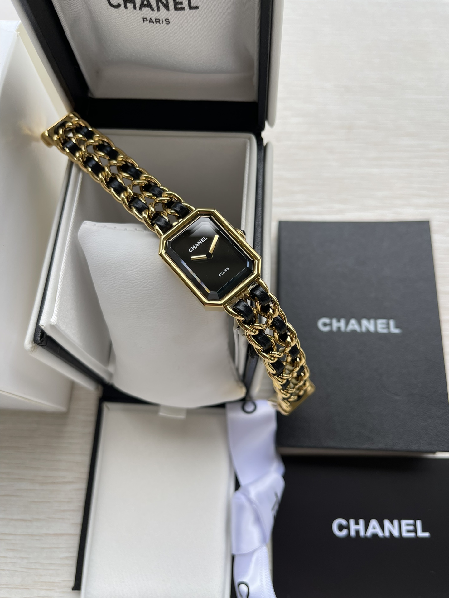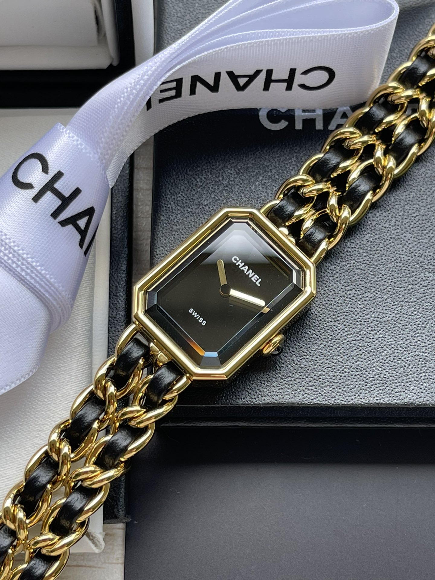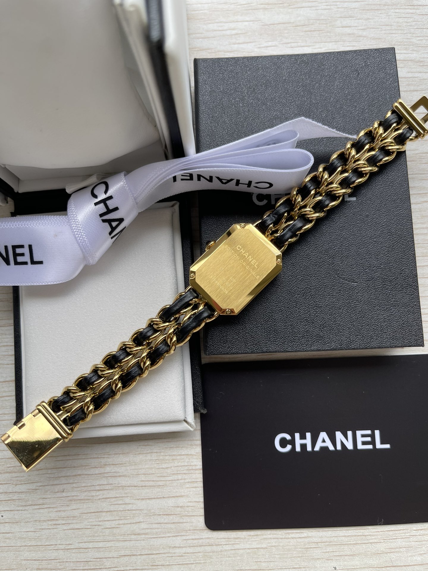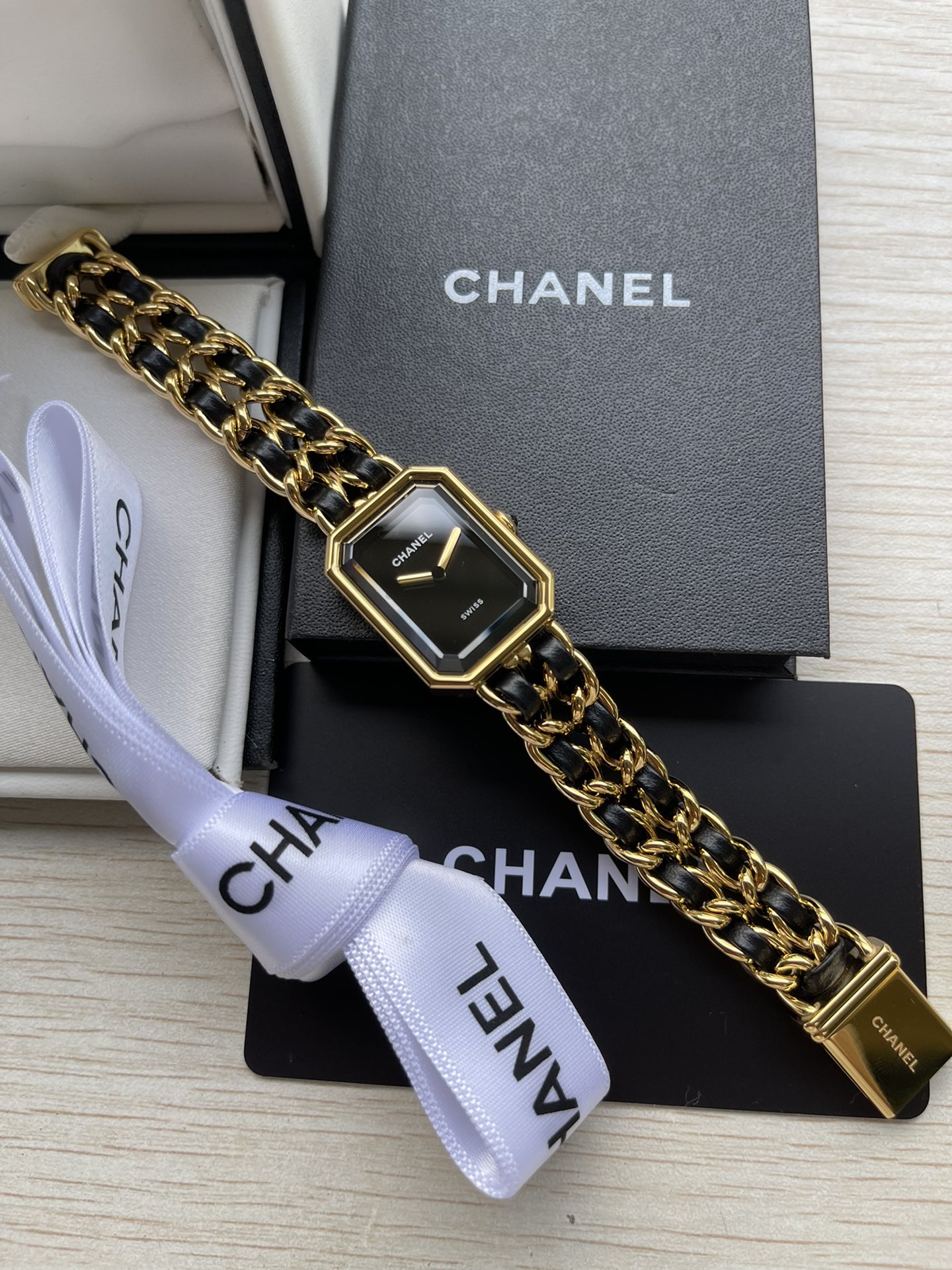 正規品シンクロカウンター輸入高精度スイス製クオーツムーブメント(分解・点検対応) シャネル シャネル プルミエールシリーズ、ステンレスケース、表面イエローKゴールドメッキ(0.2ミクロン)、ステンレススチールリューズ、天然カボッションオニキス象嵌イエローKゴールド(0.2ミクロン)、ブラックレザーを織り込んだイエローKゴールドメッキ(0.2ミクロン)の上品なストラップ、オリジナルサイズ 寸法 26.1X20X7.65mm ストラップサイズ SMLXL 4 つの長さ。