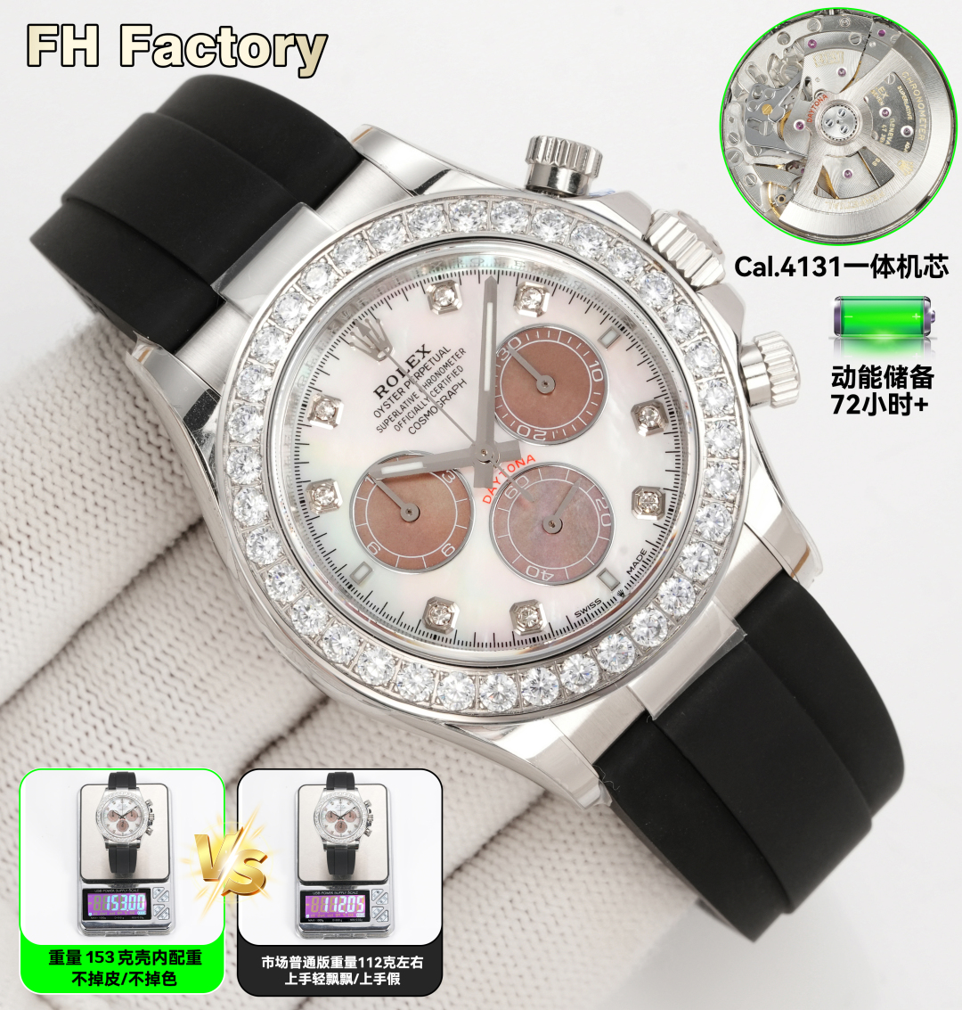 4131 V1 143g 0 V2 153g 3600 7750 145g 2400 FHファクトリーROLEXデイトナシリーズLX1デイトナのコストパフォーマンスの高い重みバージョンケース内のウェイトは剥がれたり色褪せたりせず、時計全体は153g、金メッキです ! 上海 4130 および 4131 の動き選択してください 。 厚さはわずか12 .2MMで、底部カバーの厚いバージョンではありません。ベゼル、文字盤、針、ケースカバー、テープ、バックルはすべて一流の代替アクセサリーです。ディテールも充実していて、色もマッチしています!