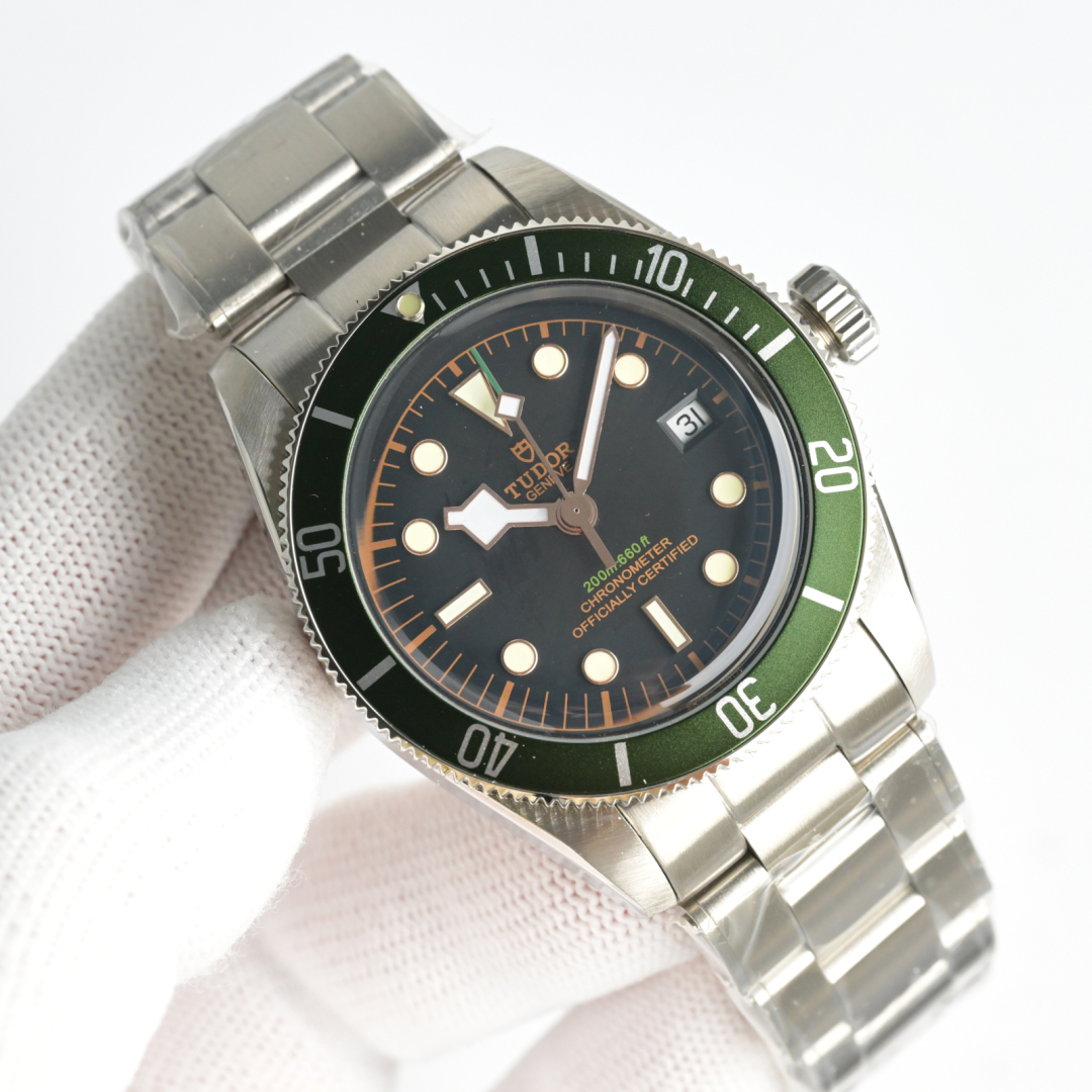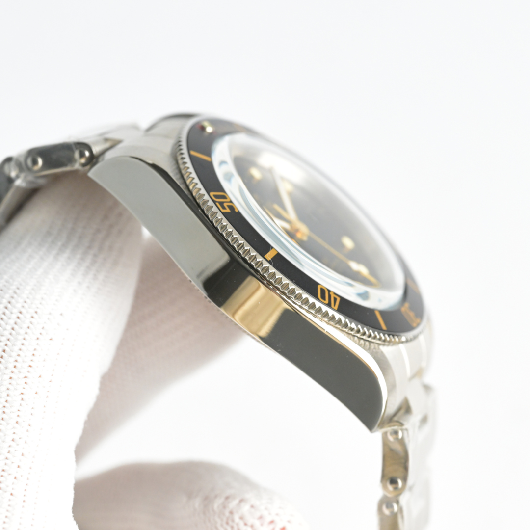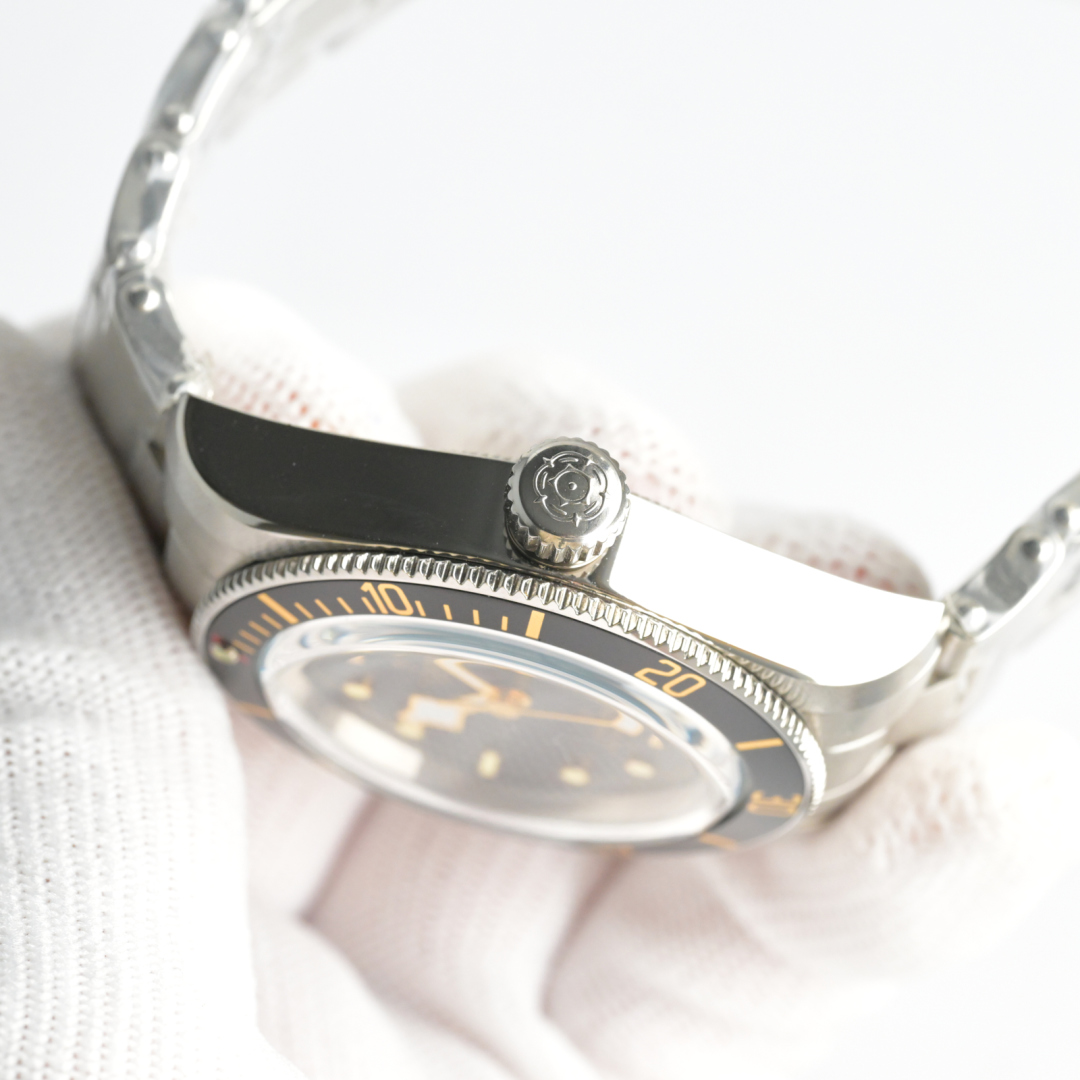 時計のケースはステンレススチール製で、細かく研磨され、つや消し加工が施されており、独特の質感と光沢を与えています 。ロレックス サブマリーナーと同様、ケースのサイズは 41 mm で、これも「オリジナル」ブラックベイの直径に準拠しています。