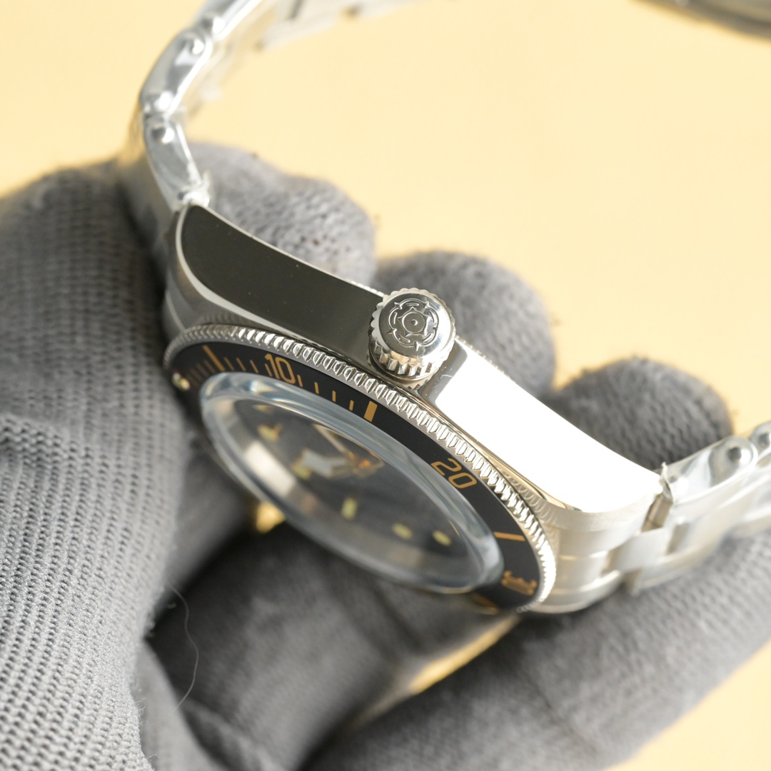 時計はステンレススチール製で、ケースは細かく研磨され、つや消し加工が施され、独特の質感と光沢を与えています。ロレックス サブマリーナーと同様、ケースのサイズは 41 mm で、これも「オリジナル」ブラックベイの直径に準拠しています。