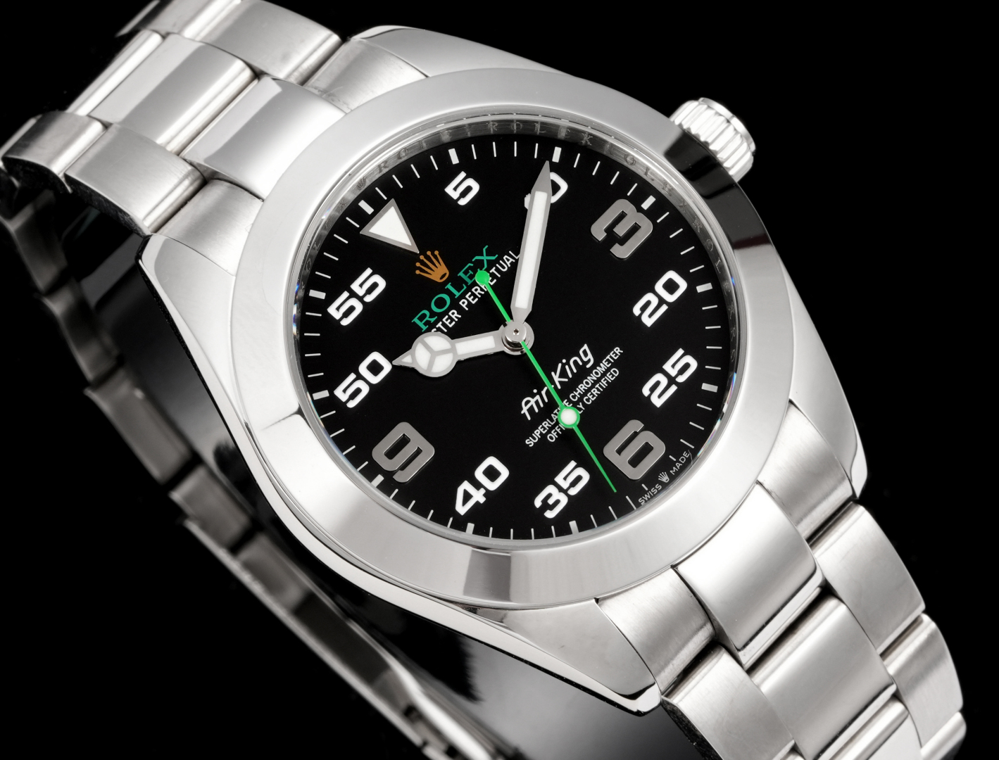 将来はすべての長距離フライトでこの時計を着用するつもりです。」 2824 機械式ムーブメントを搭載 エア キング ウォッチは、1930 年代のファクトリー R と航空業界とのユニークなつながりを反映しています。この時代は航空業界にとって黄金時代であり、航空機の性能が急速に向上し、路線が拡大し、長距離便が導入されました。エア キング ウォッチには、3、6、9 時位置に特大のアラビア数字が記された特徴的なブラックの文字盤が装備されており、航行中に時間をはっきりと読み取ることができるように分目盛が目立ちます。