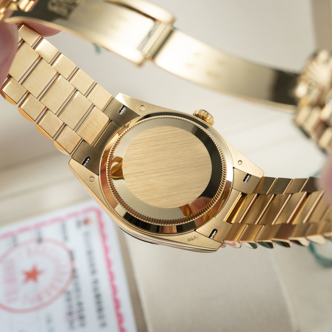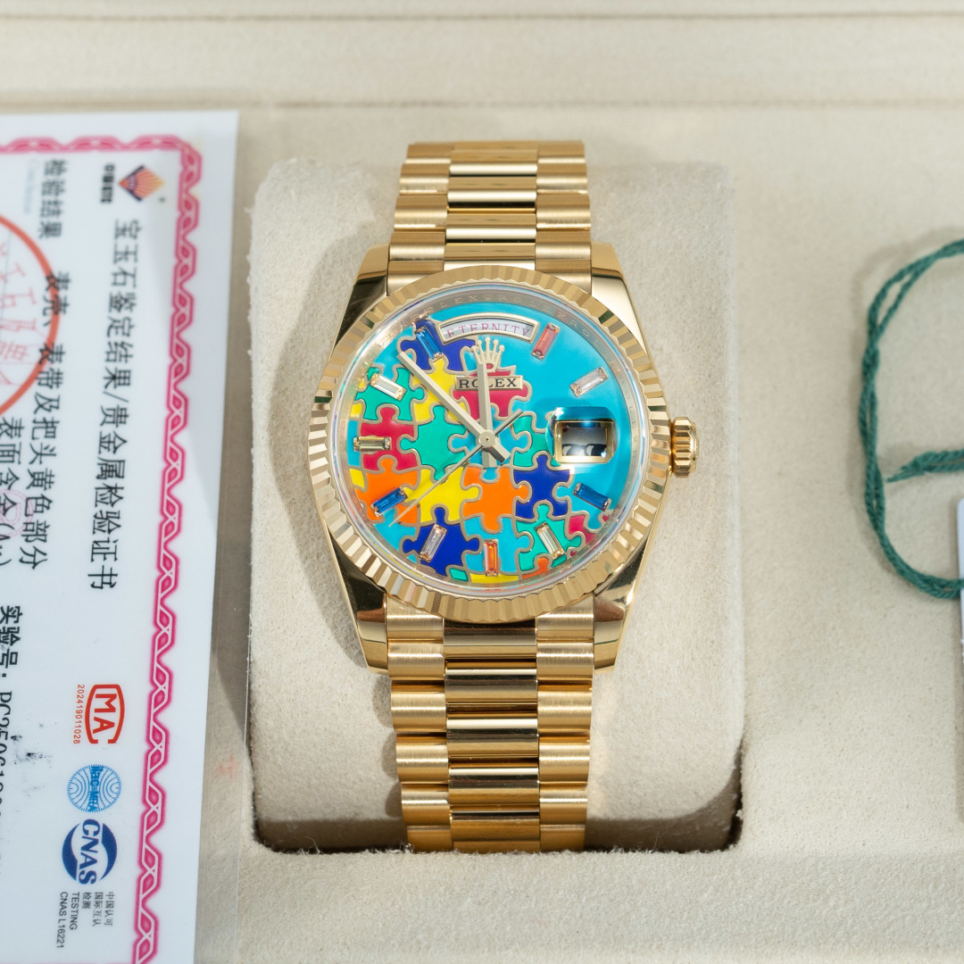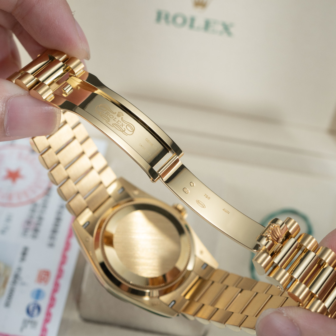 ロレックスの新型オイスターパーペチュアル デイデイト 36mm 18K純正金メッキモデルは国家検査証明書付きであらゆる再検査に対応 !