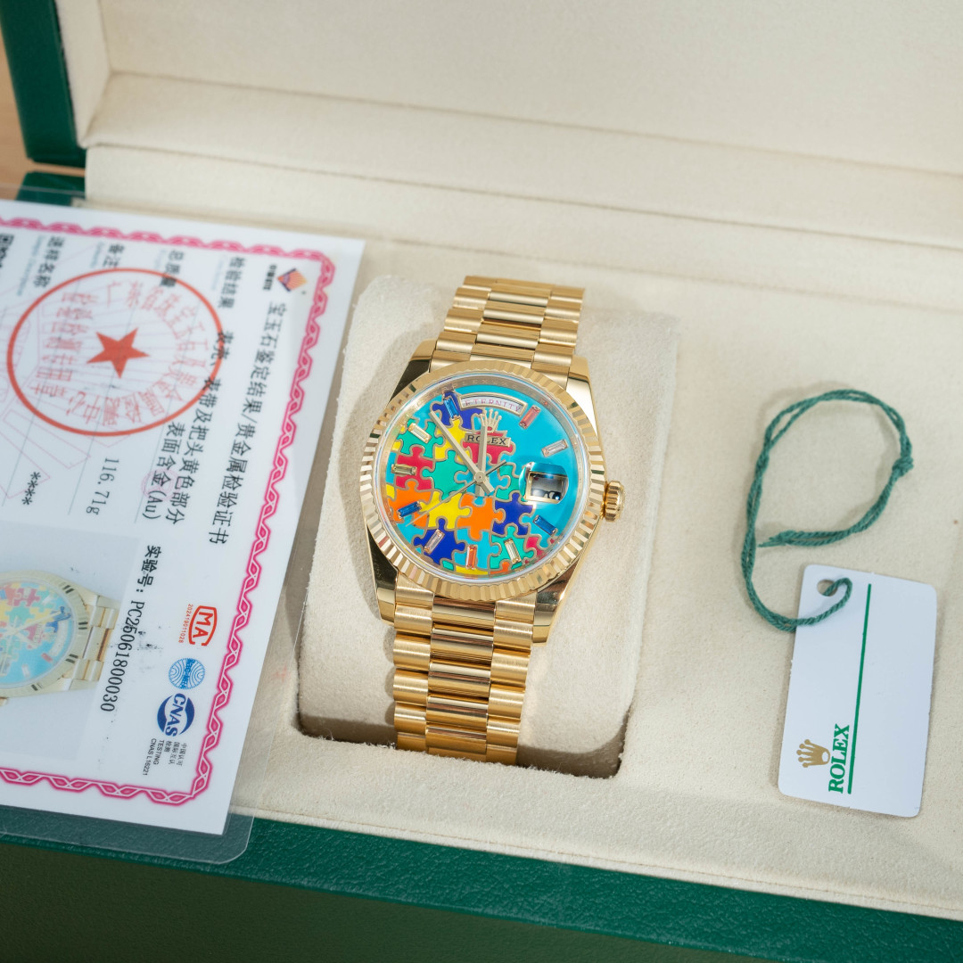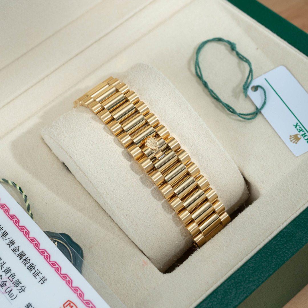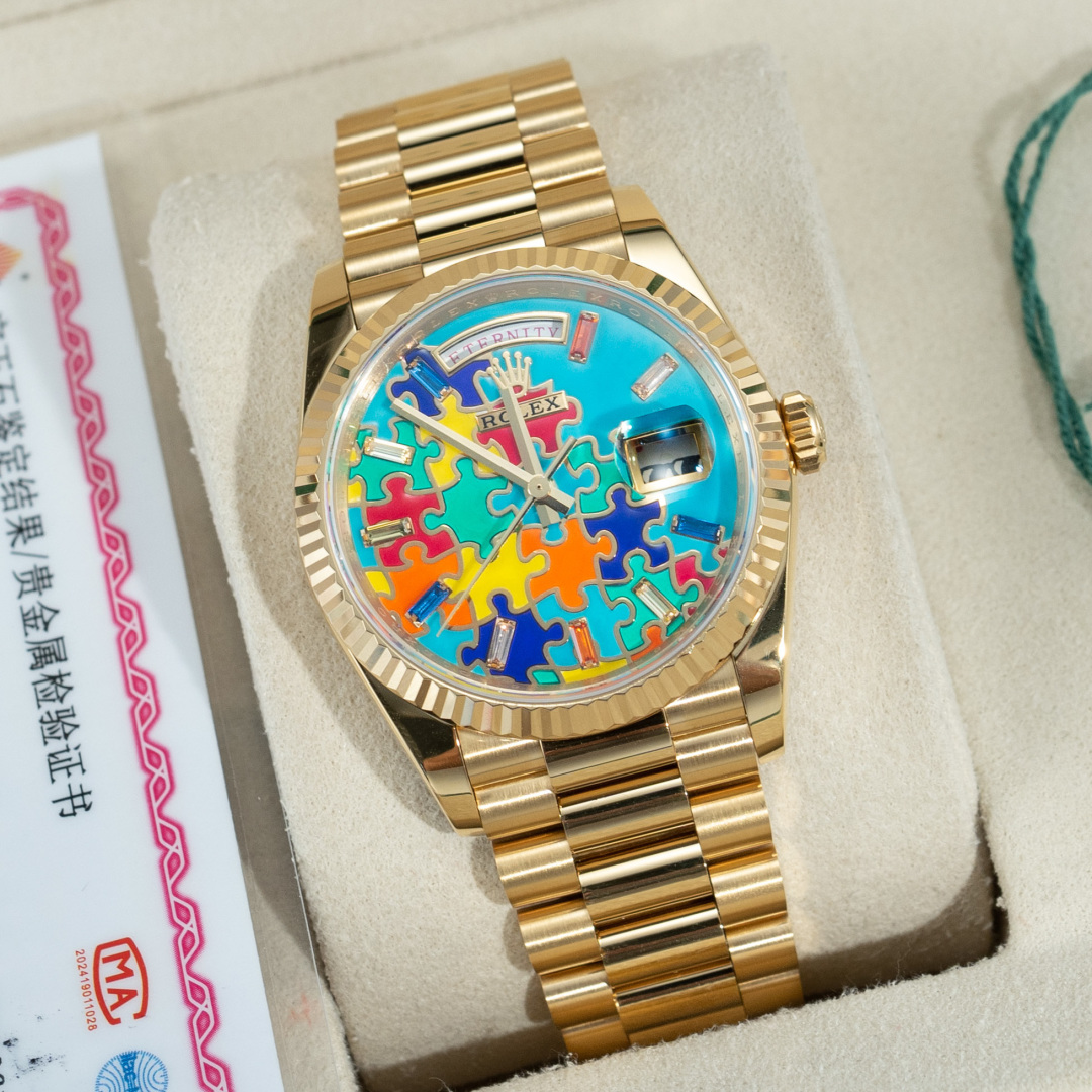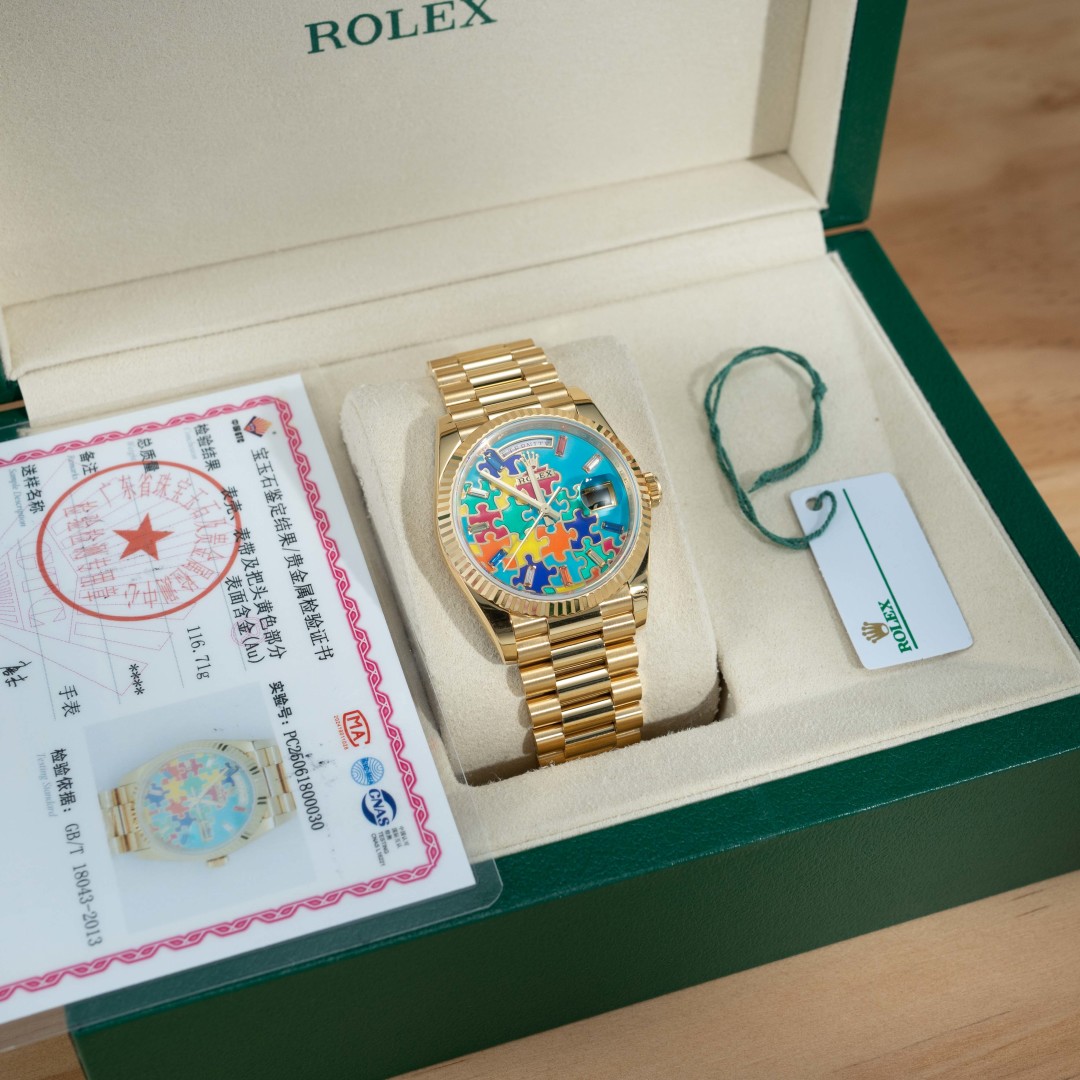 ロレックスの新型オイスターパーペチュアル デイデイト 36mm 18K純正金メッキモデルは国家検査証明書付きであらゆる再検査に対応 !