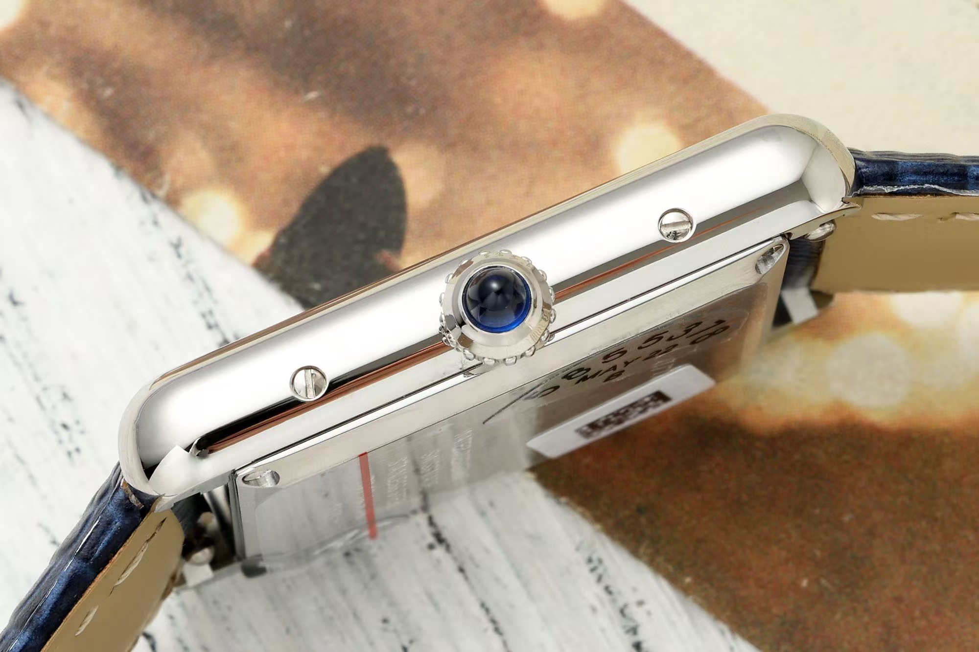 滑らかな弧と鋭い角は、モダンさとファッションの感覚を示しています。タンク トラック スタイルのラグと八角形のリューズには、カルティエの象徴的なブルー スピネルがあしらわれており、非常に目立ちます。 【文字盤】文字盤はクラシックなローマンスケールで表示されます。ホワイトの文字盤にブルースチールの針がマッチしています。
