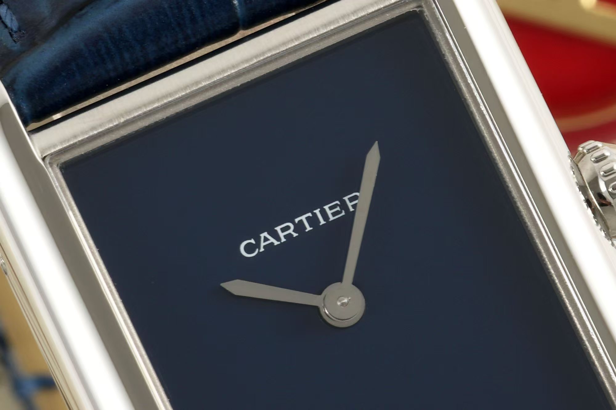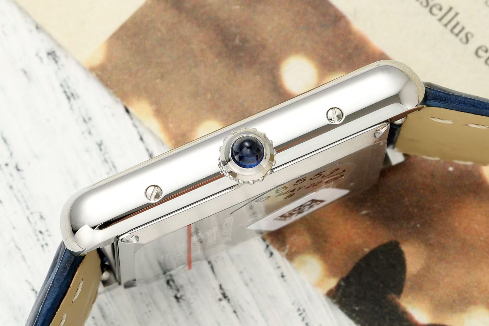 滑らかな弧と鋭い角は、モダンさとファッションの感覚を示しています。タンク トラック スタイルのラグと八角形のリューズには、カルティエの象徴的なブルー スピネルがあしらわれており、非常に目立ちます。 【文字盤】文字盤はクラシックなローマンスケールで表示されます。ホワイトの文字盤にブルースチールの針がマッチしています。