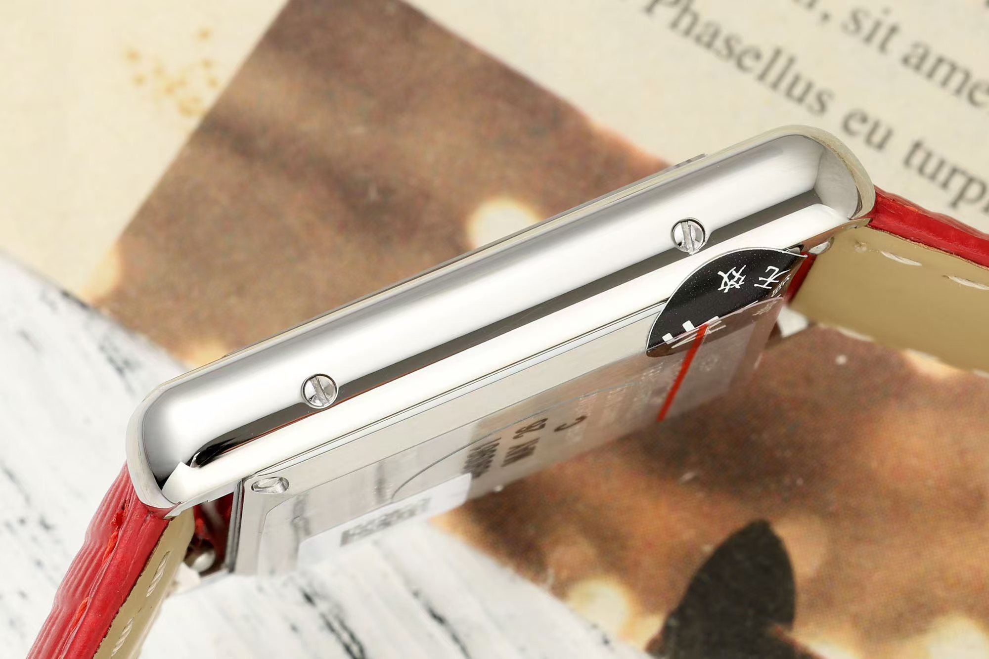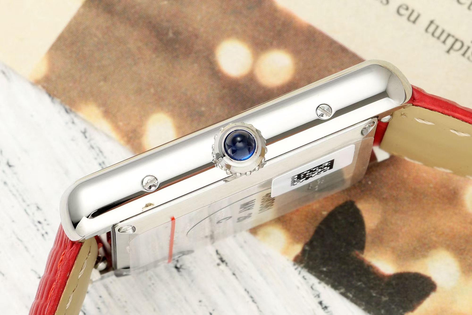 滑らかな弧と鋭い角は、モダンさとファッションの感覚を示しています。タンク トラック スタイルのラグと八角形のリューズには、カルティエの象徴的なブルー スピネルがあしらわれており、非常に目立ちます。 【文字盤】文字盤はクラシックなローマンスケールで表示されます。ホワイトの文字盤にブルースチールの針がマッチしています。