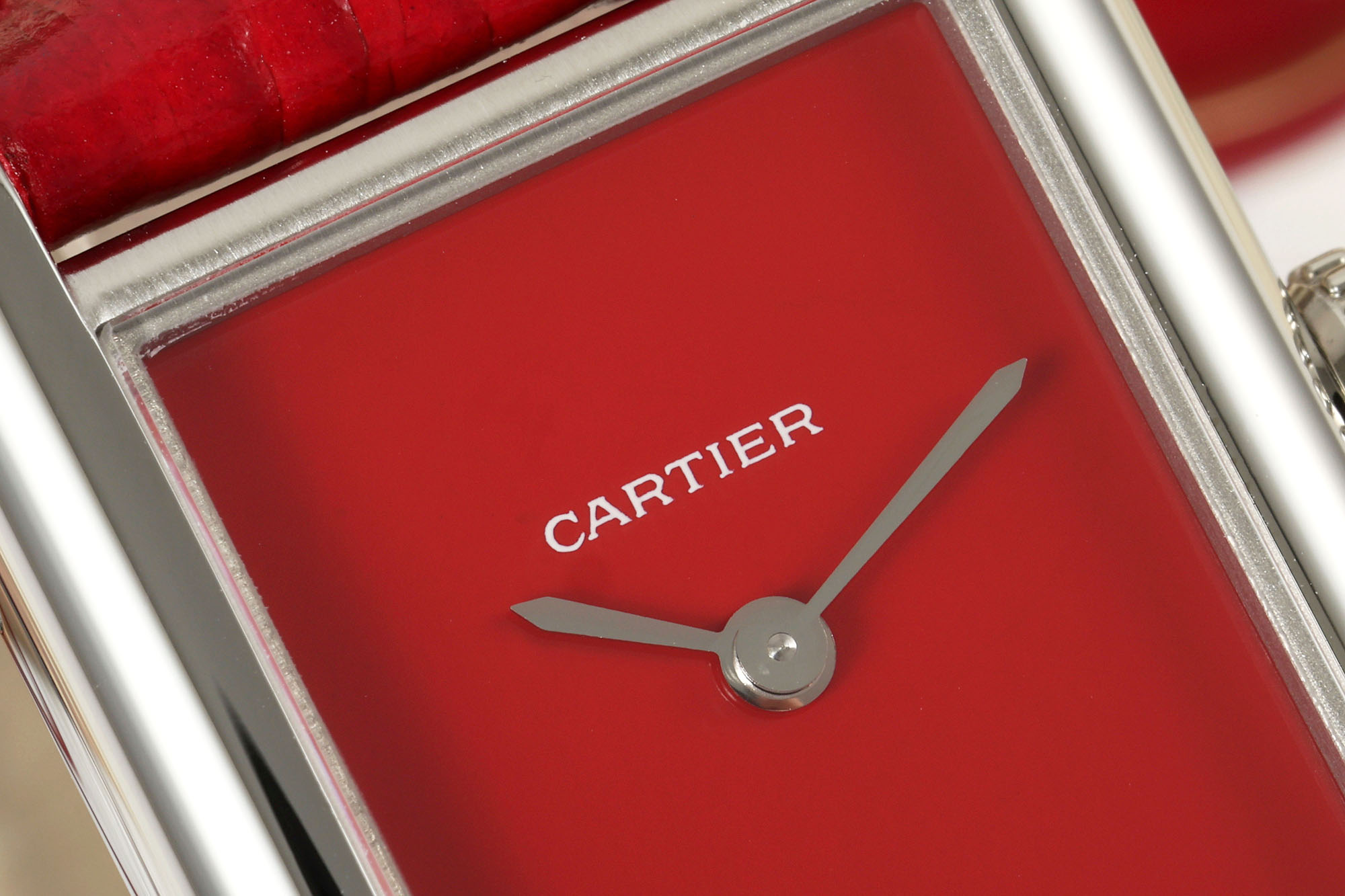 滑らかな弧と鋭い角は、モダンさとファッションの感覚を示しています。タンク トラック スタイルのラグと八角形のリューズには、カルティエの象徴的なブルー スピネルがあしらわれており、非常に目立ちます 。 【文字盤】文字盤はクラシックなローマンスケールで表示されます。ホワイトの文字盤にブルースチールの針がマッチしています。