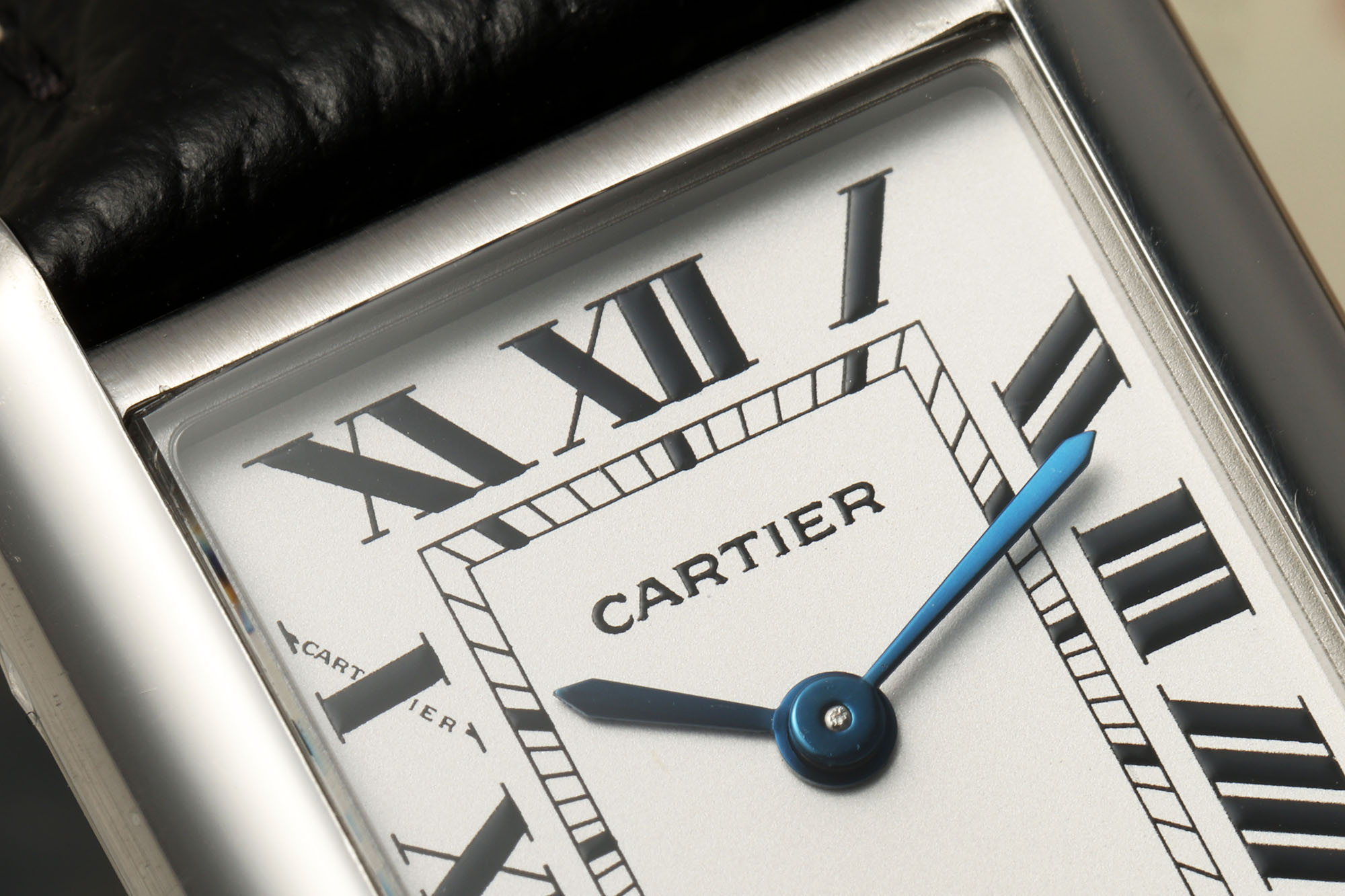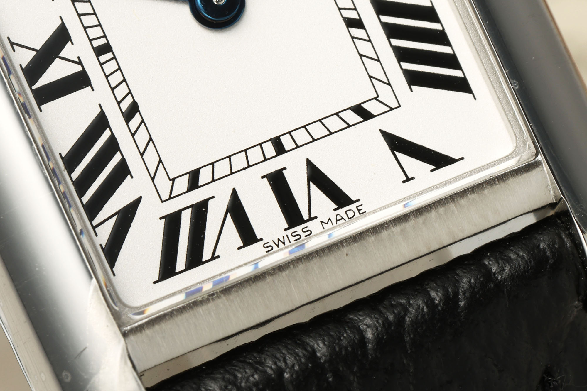 滑らかな弧と鋭い角は、モダンさとファッションの感覚を示しています。タンク トラック スタイルのラグと八角形のリューズには、カルティエの象徴的なブルー スピネルがあしらわれており、非常に目立ちます。 【文字盤】文字盤はクラシックなローマンスケールで表示されます。ホワイトの文字盤にブルースチールの針がマッチしています。