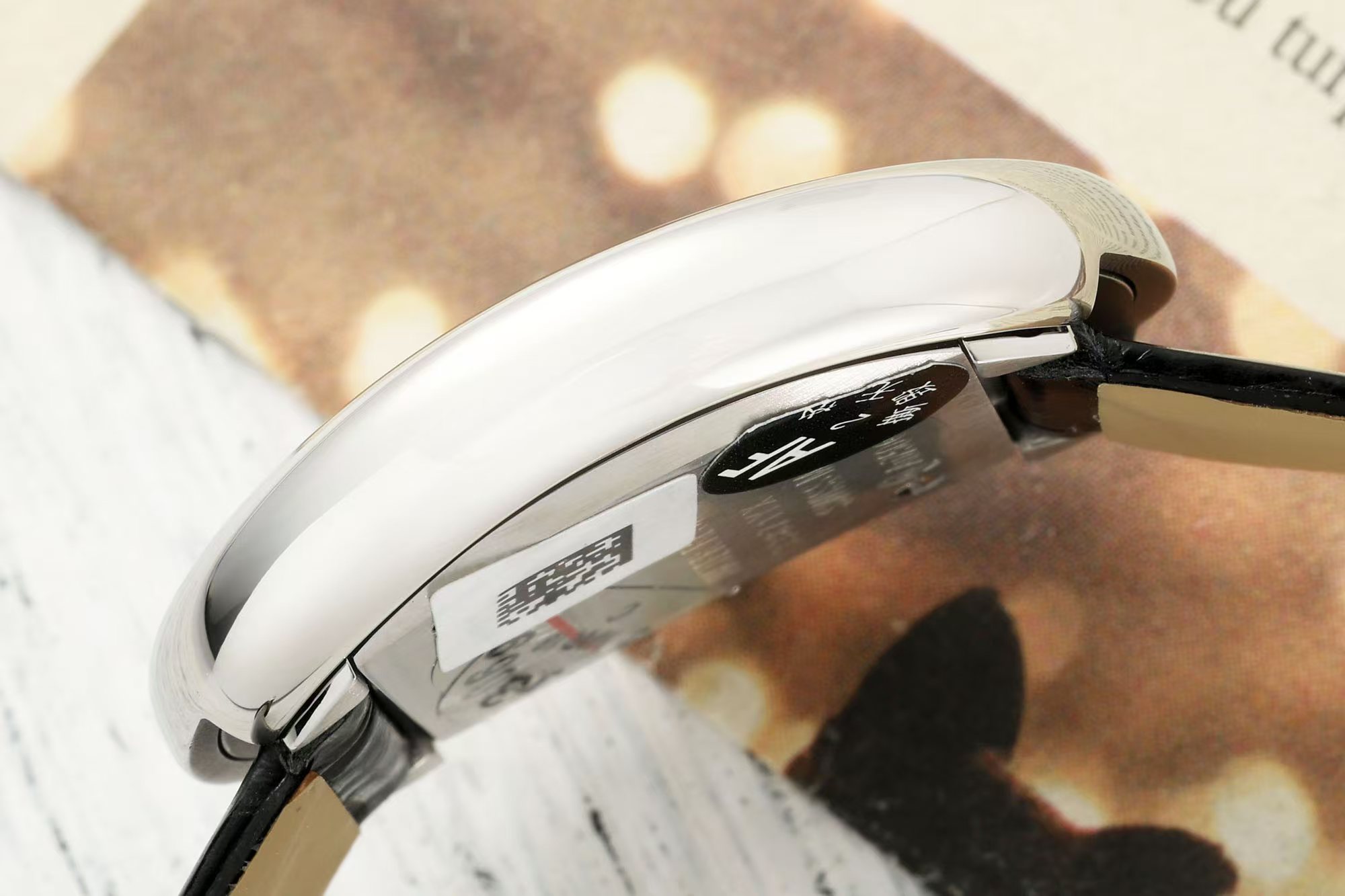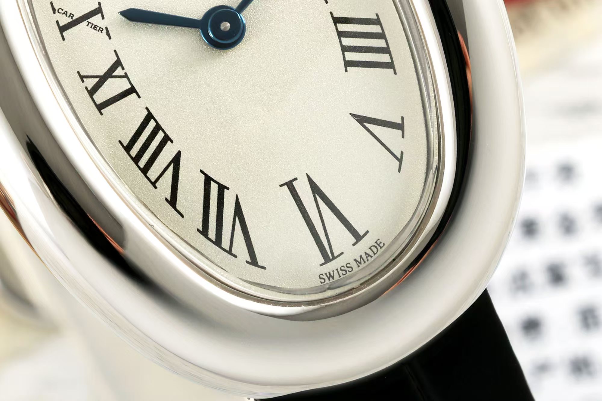 針はクラシックなブルースチール針で、アリゲーターレザーストラップと組み合わせており、シンプルでありながらエレガントな印象を与えます。