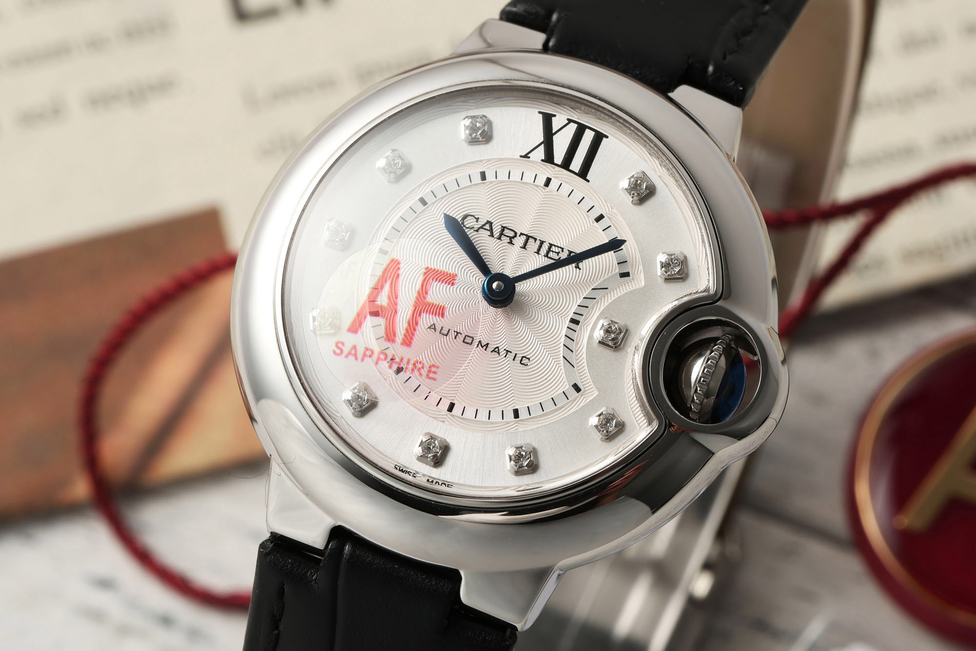 AFカルティエ 33mm ブルーバルーン シリーズ ウォッチ 【ケース】直径 33mm、厚さ 10mm、オリジナルと一致 !ステンレススチールケース、最高級サファイアクリスタルミラー、三日月型開口部は全く同じです。