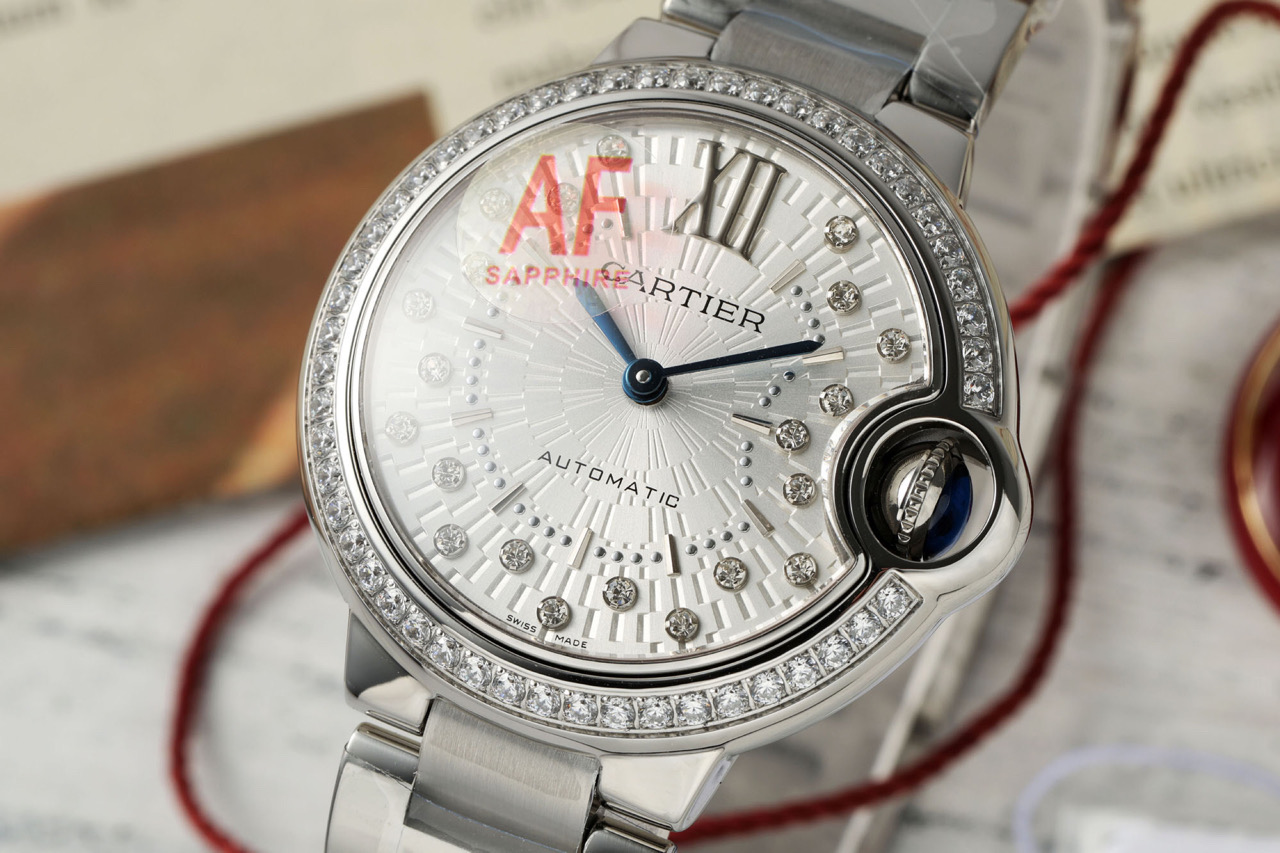 AFカルティエ 33mm ブルーバルーン シリーズ ウォッチ 【ケース】直径 33mm、厚さ 10mm、オリジナルと一致 !ステンレススチールケース、最高級サファイアクリスタルミラー、三日月型開口部は全く同じです 。