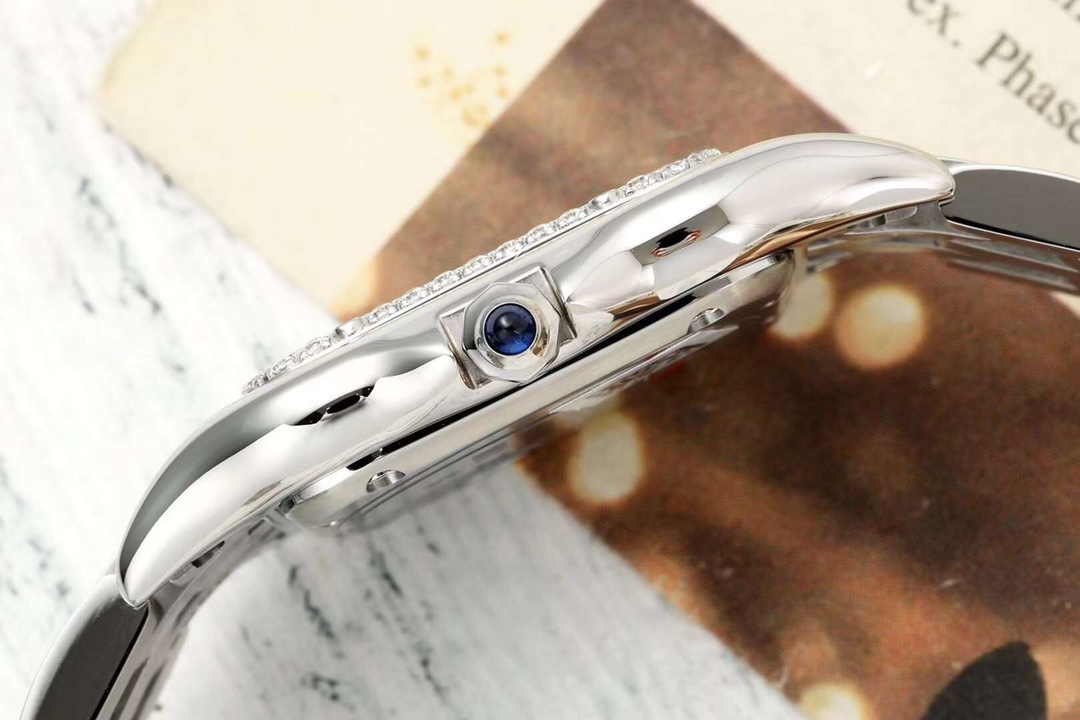 文字盤にはシルバーのローマ数字が配されています 。カルティエの象徴的な剣の形をしたブルースティール針が文字盤上で飛び跳ねます。リューズにはゴージャスかつ無骨な合成ブルースピネルがセットされています。 【ストラップ】 ステンレススチールのストラップは丁寧に磨き上げられ、ケースの柔らかなデザイン言語を反映しています。