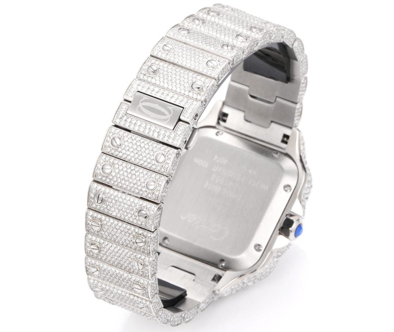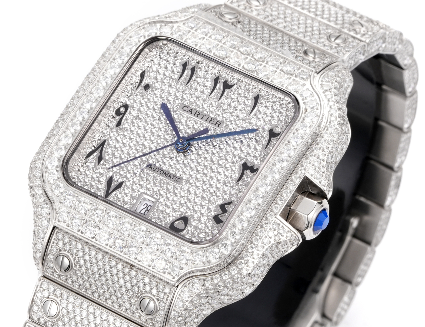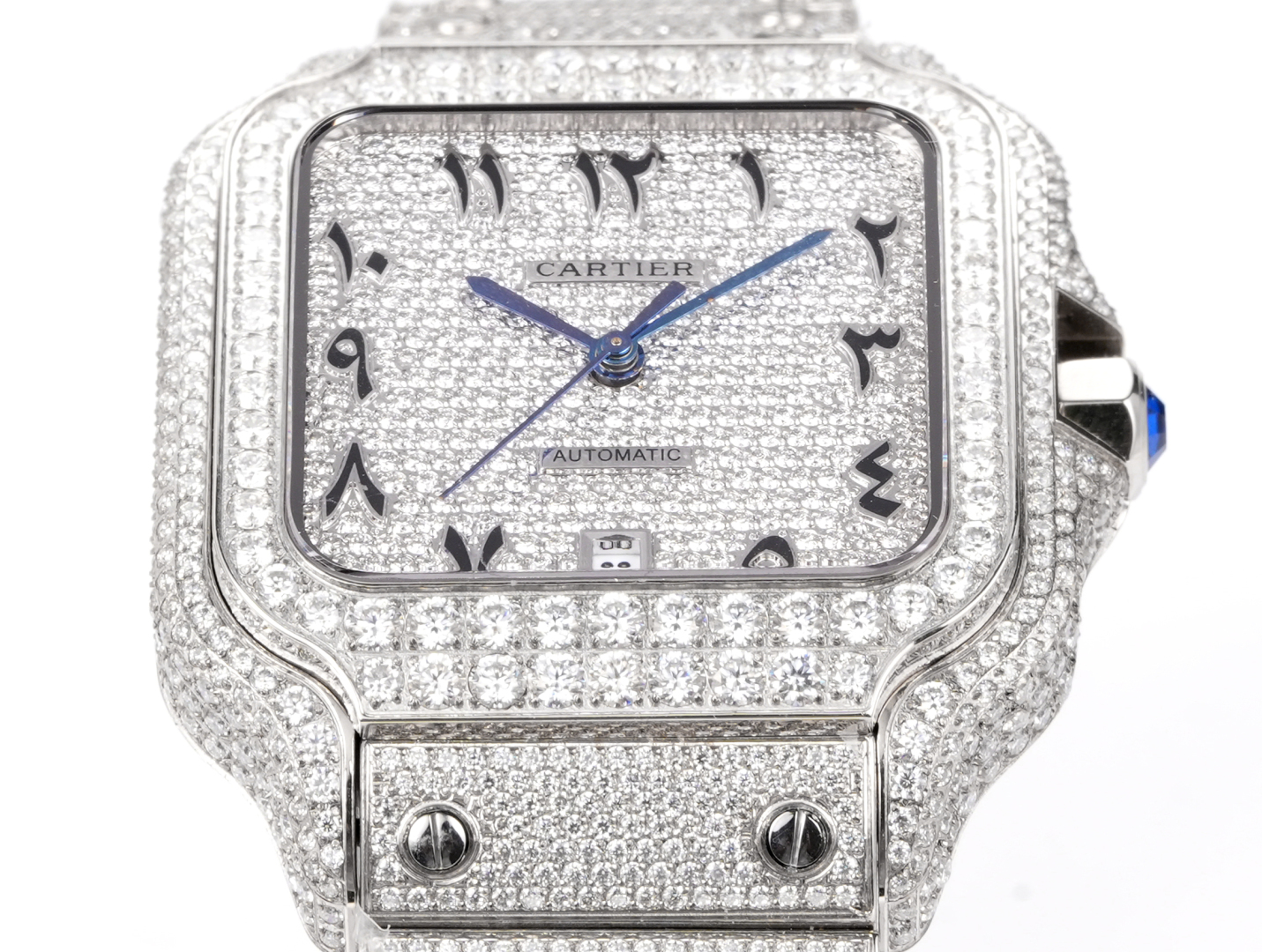 Gypsophila Santos Gypsophila モアサナイト バージョンでは、時計全体に D カラー VVS グレードのモアサナイト ダイヤモンドが手作業で埋め込まれています。すべての石はプロのペンテストに合格できます。モアサナイト ダイヤモンドの屈折率は 2.65 2 .69 (ダイヤモンド 2.42) です。ダイヤモンドと同等の光沢を持ち、「ファイアーシャイン」がより強く、ダイヤモンドに次ぐ硬度を持ち、インレイ加工には派手な形状の不規則なインレイ(フラワー)を採用 。セッティング)は、市場のモアサナイト加工技術とは異なり、石は非常に緻密で隙間がないため、石がしっかりしているという多くのお客様の悩みの種を解決します。 316Lステンレス鋼素材、時計ヘッドサイズ40MM、サファイアガラスミラーS1絶妙に推奨されるメンズ機械式時計