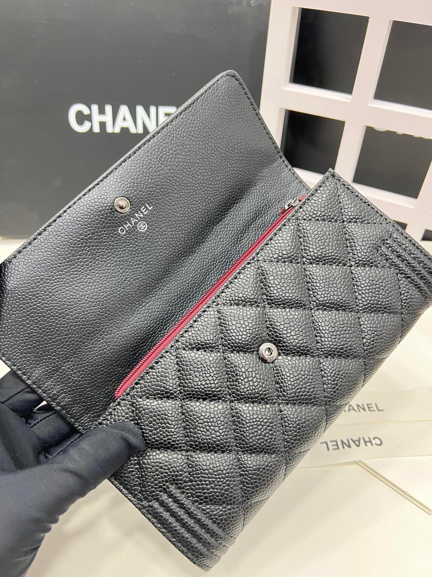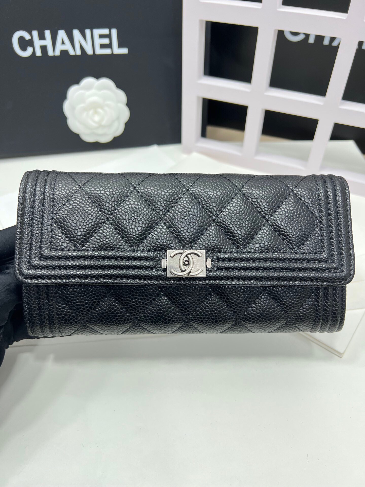 上質なキャビアスキンに輝くココマーク金具が印象的な、シャネルのトリプリーツウォレットです。しなやかで耐久性に優れた素材と、たっぷり収納できる三つ折り仕様が魅力。ブラックカラーの落ち着いた輝きが、エレガントな装いを引き立てます。ビジネスシーンから特別な日の外出まで、洗練された大人の女性に寄り添う一品です。