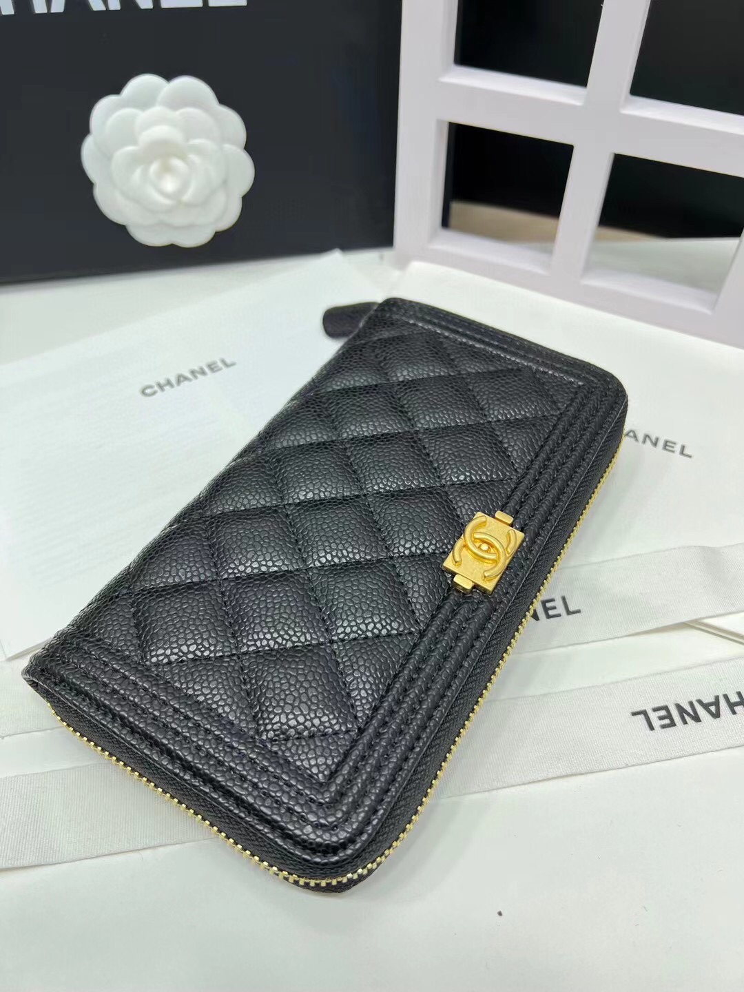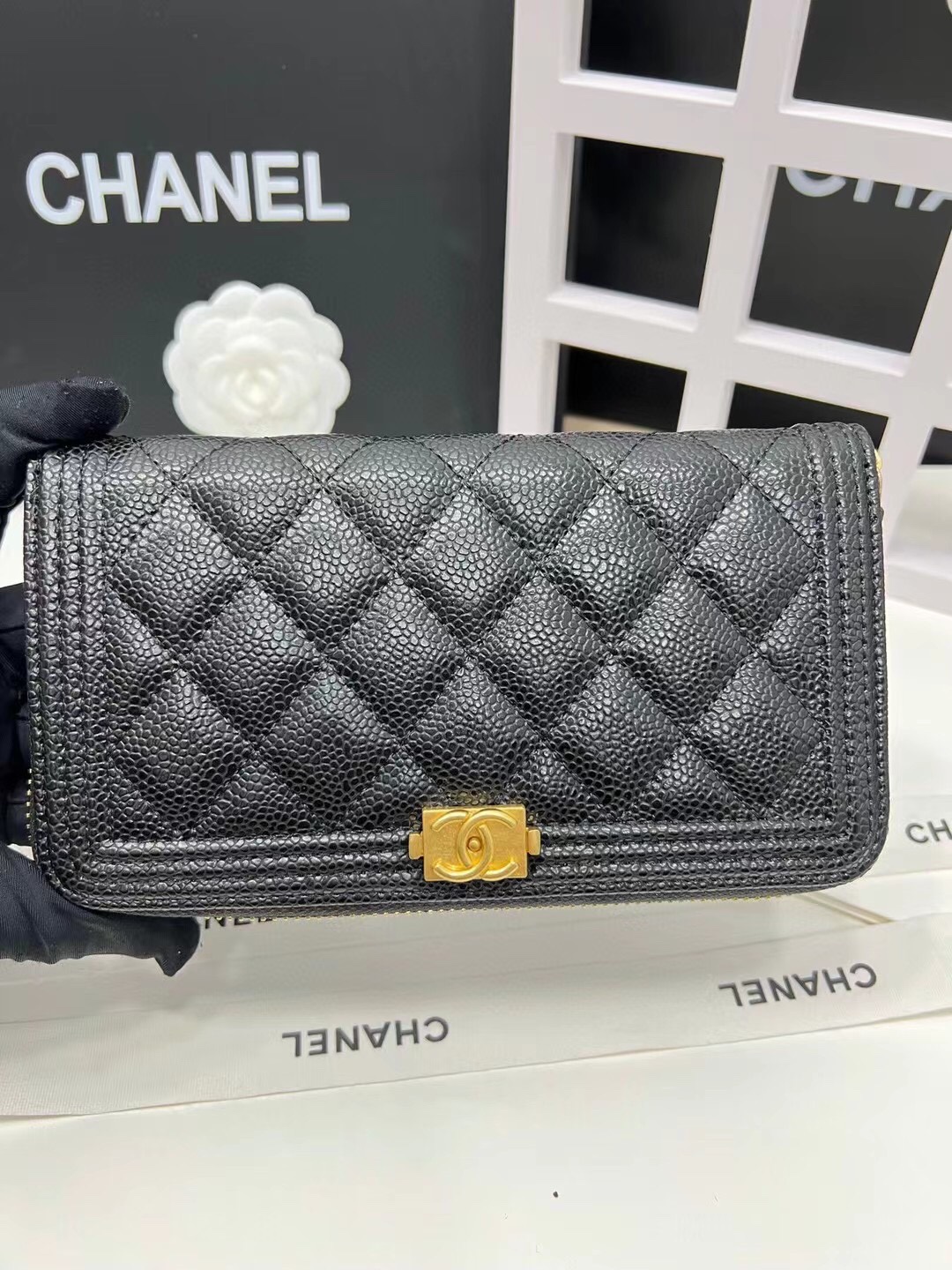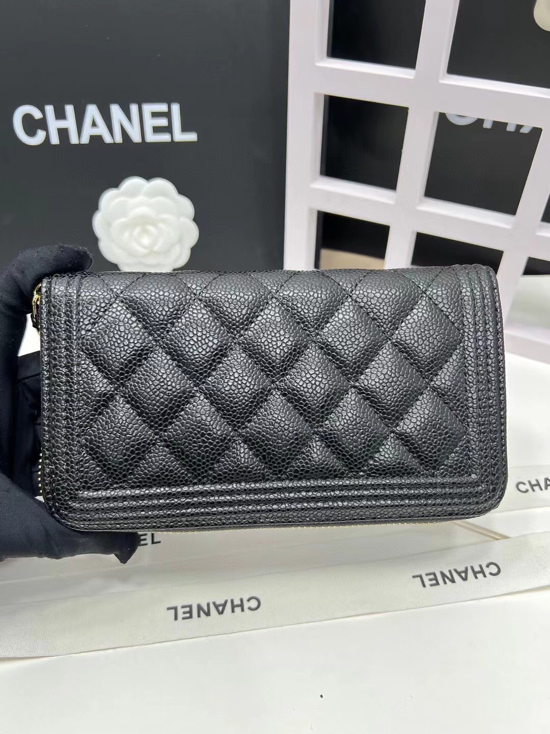 【シャネル】キャビアスキン ラウンドファスナー長財布 ココマーク金具 上品なブラックのレディースウォレット