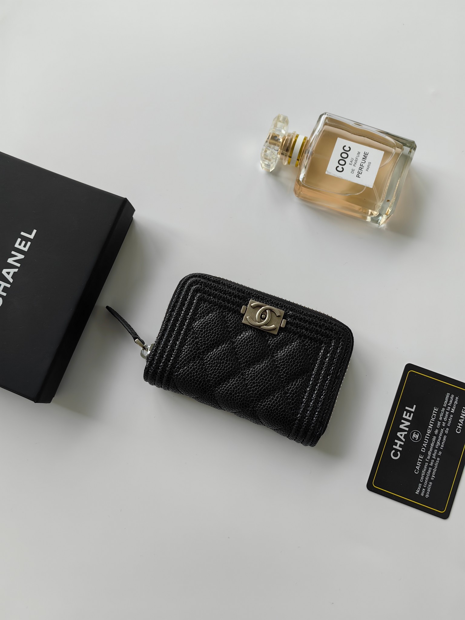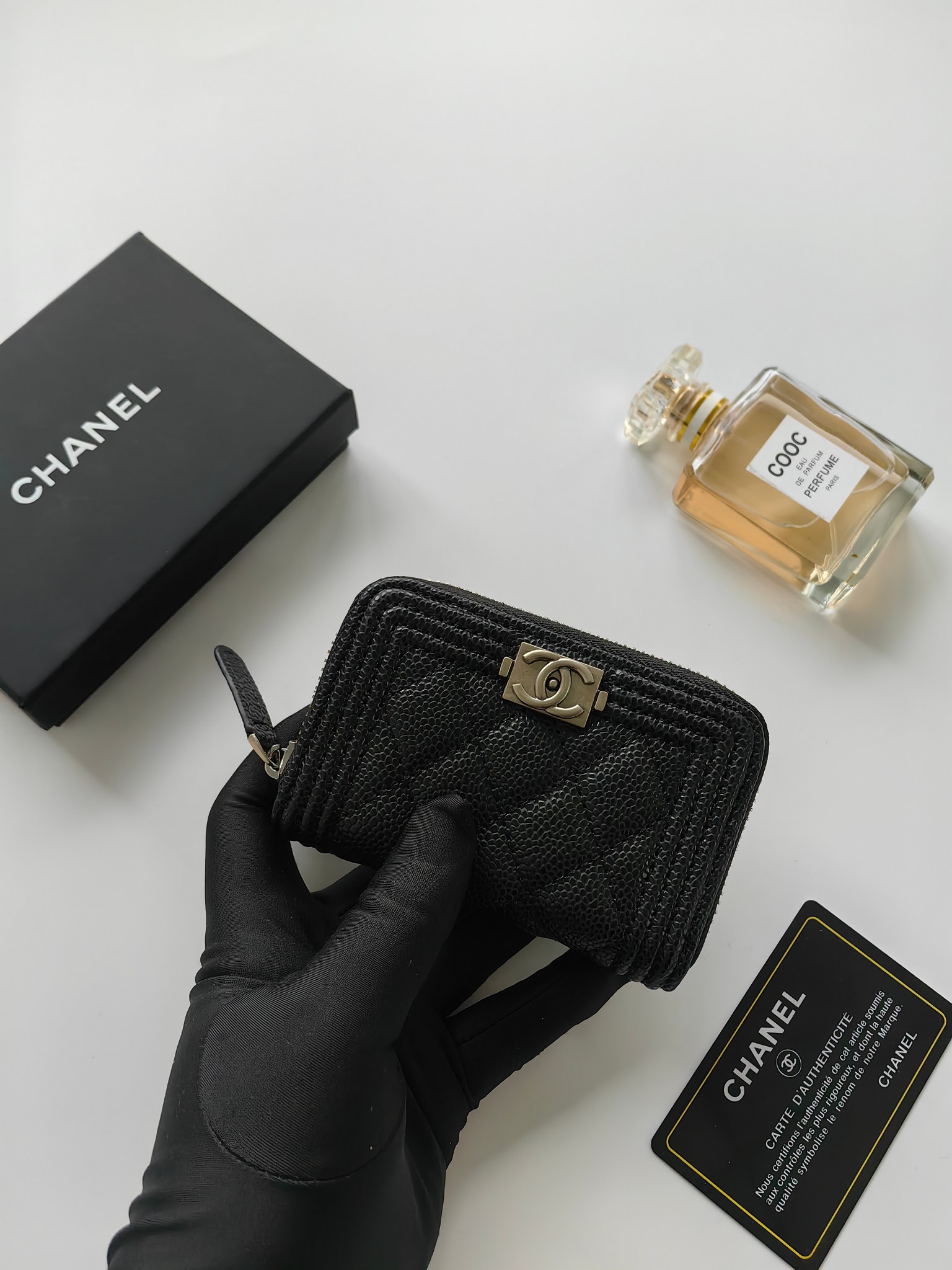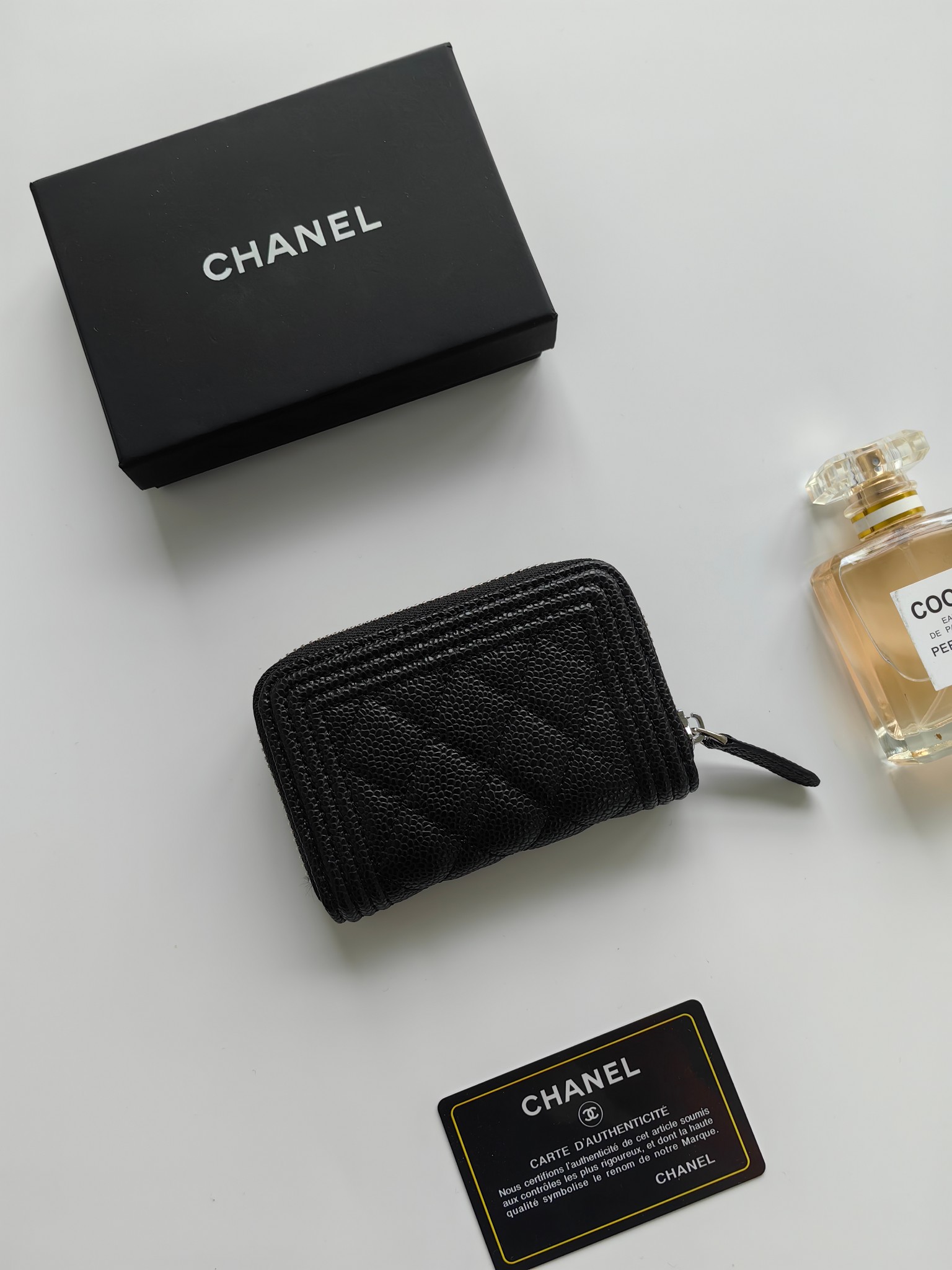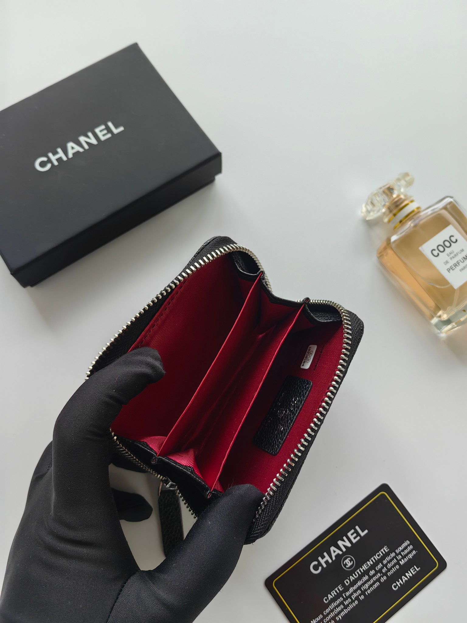 上質なキャビアスキンに輝くココマーク金具が印象的な、シャネルのロングウォレットです