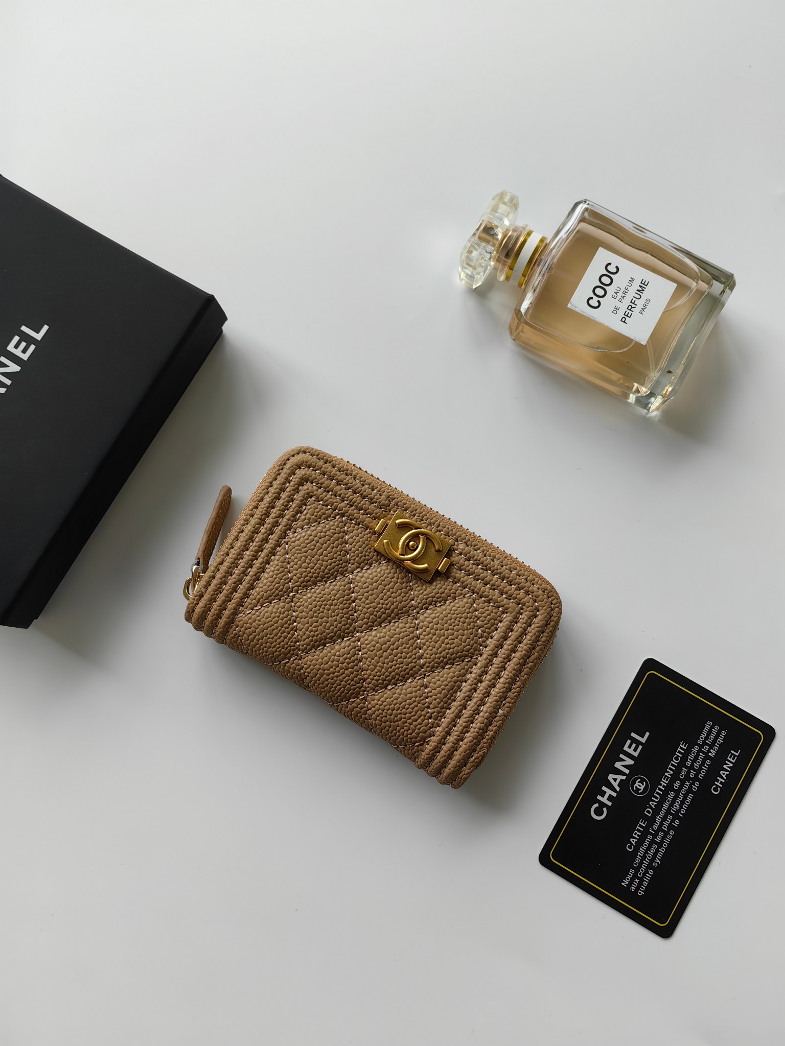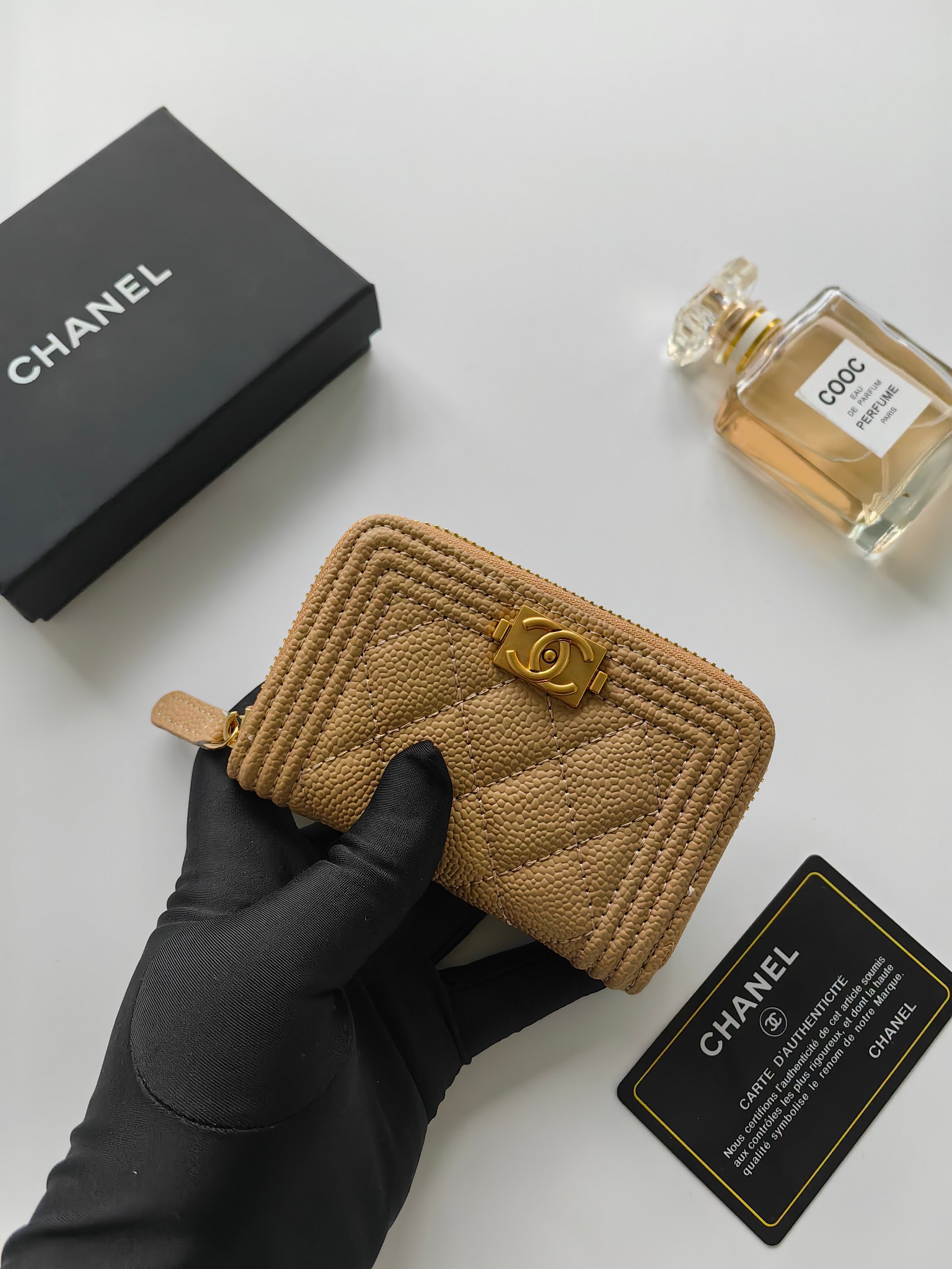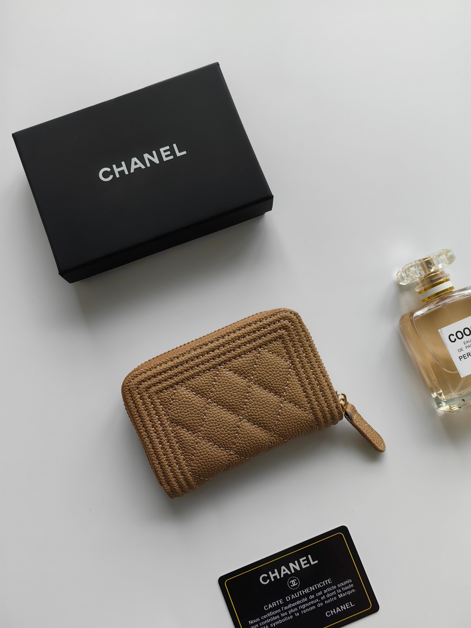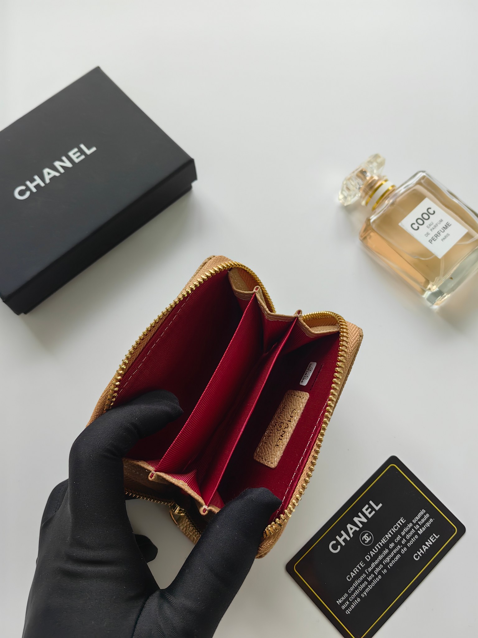上質なキャビアスキンに輝くココマーク金具が美しい、シャネルのラウンドファスナー長財布です