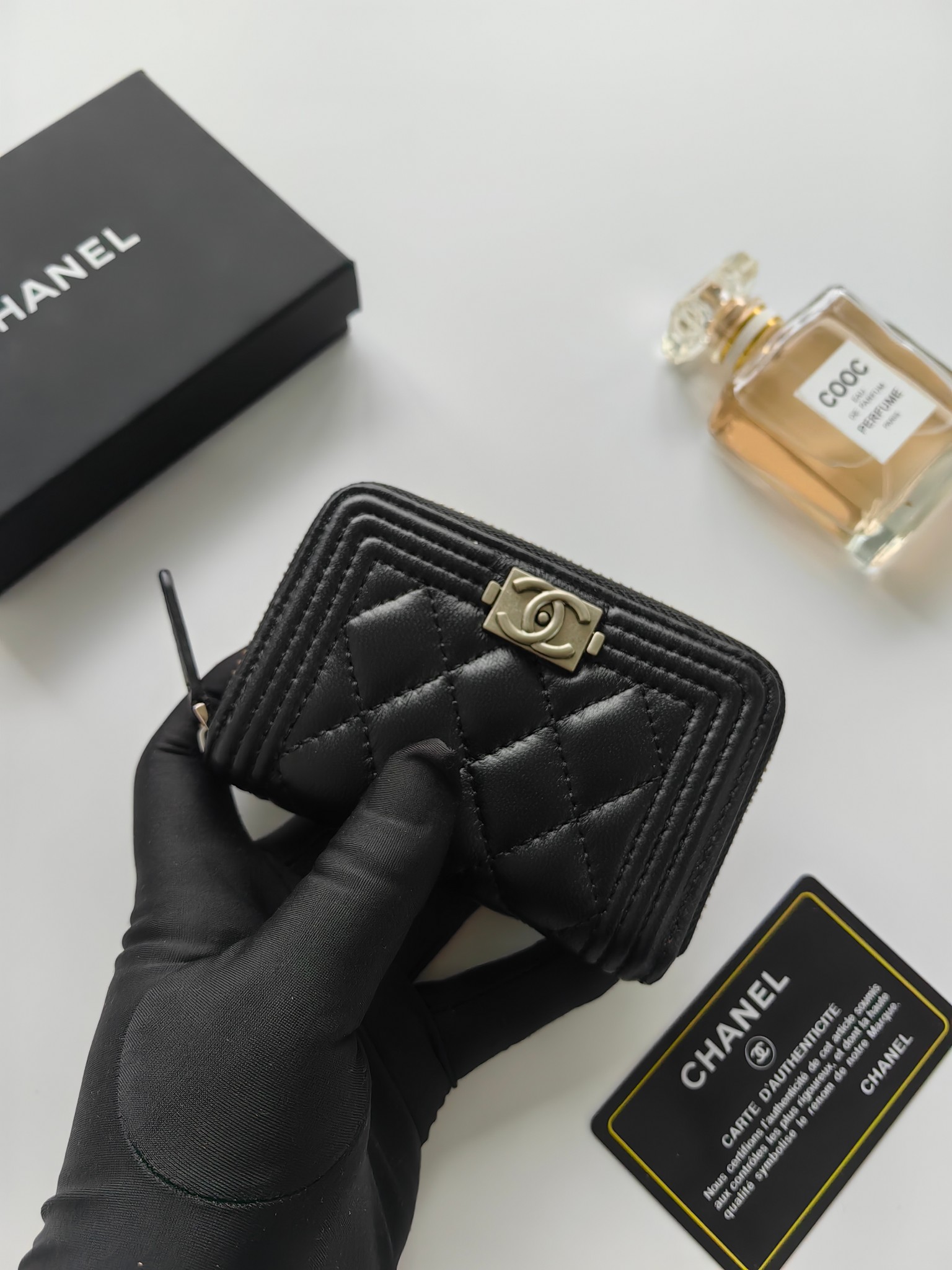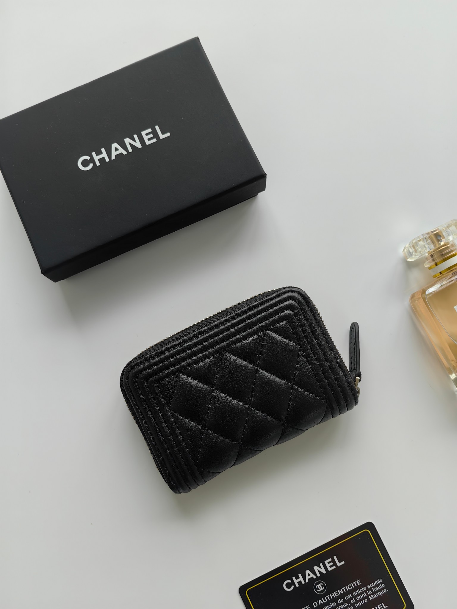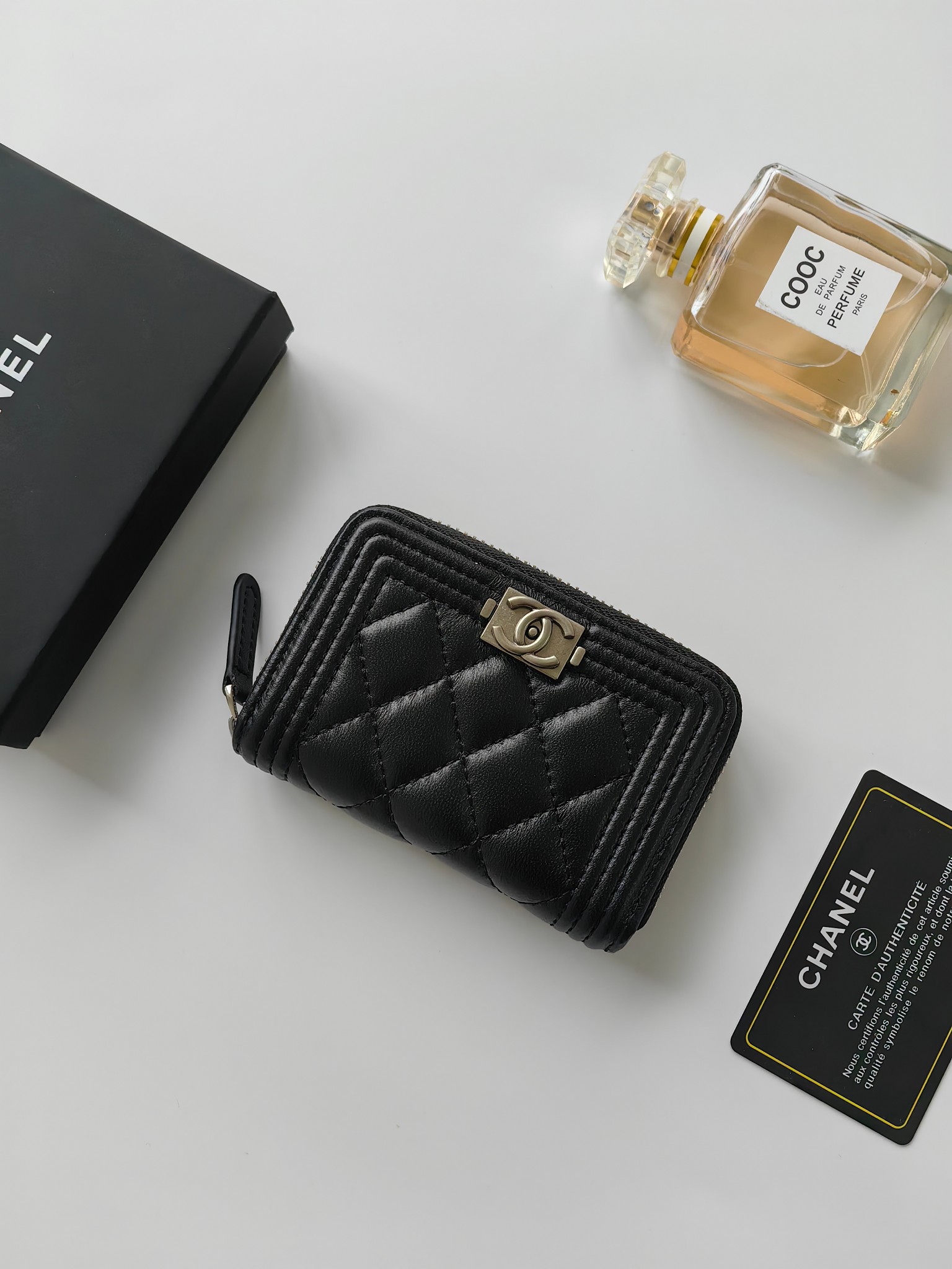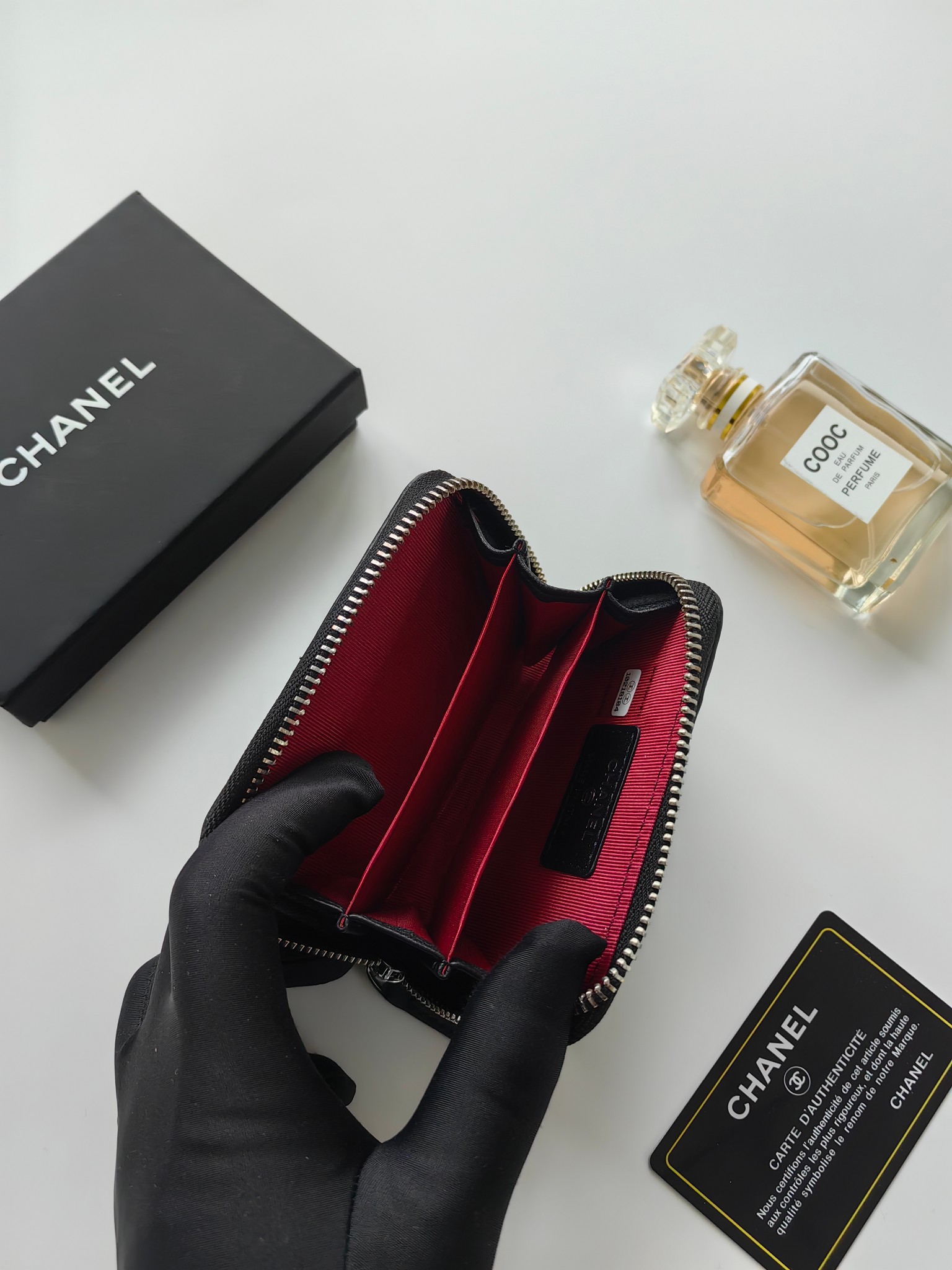 シャネルを象徴するココマーク金具が上品に輝く、キャビアスキンのトリフォールドウォレットです
