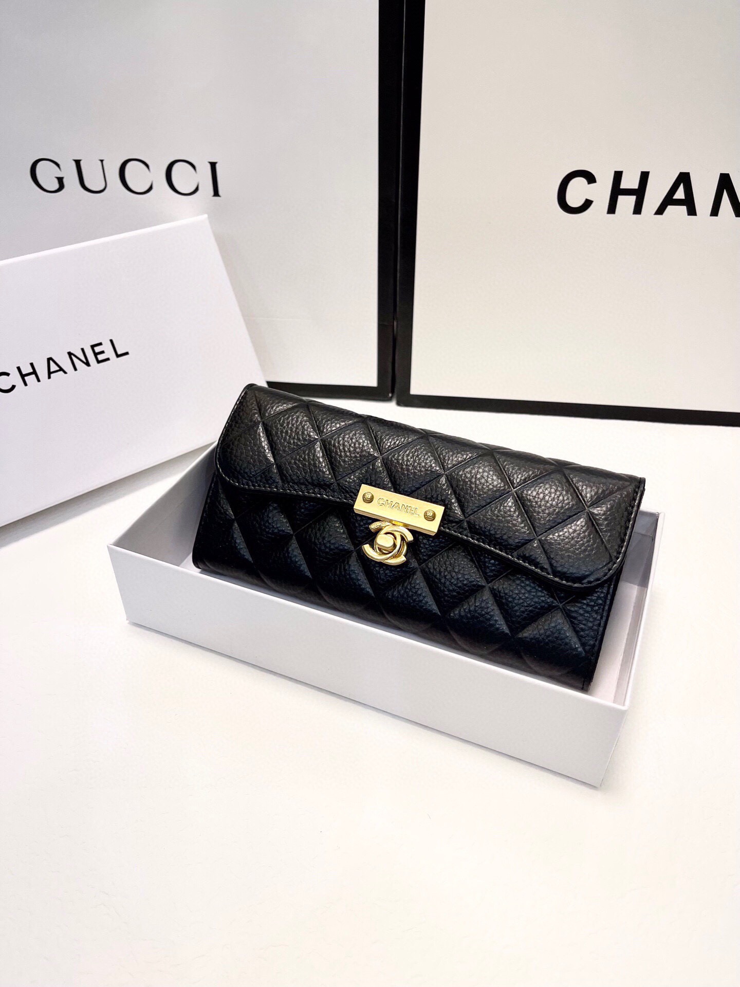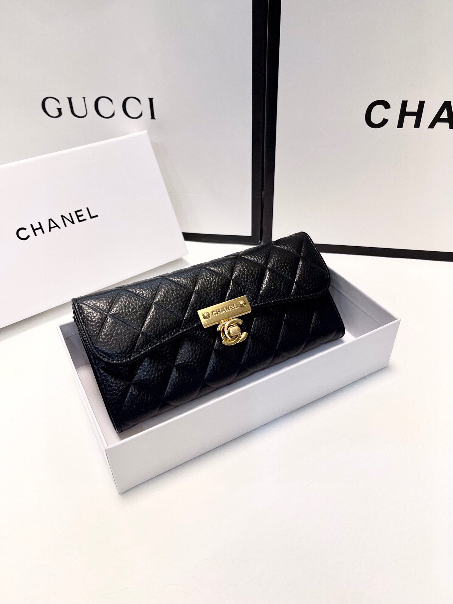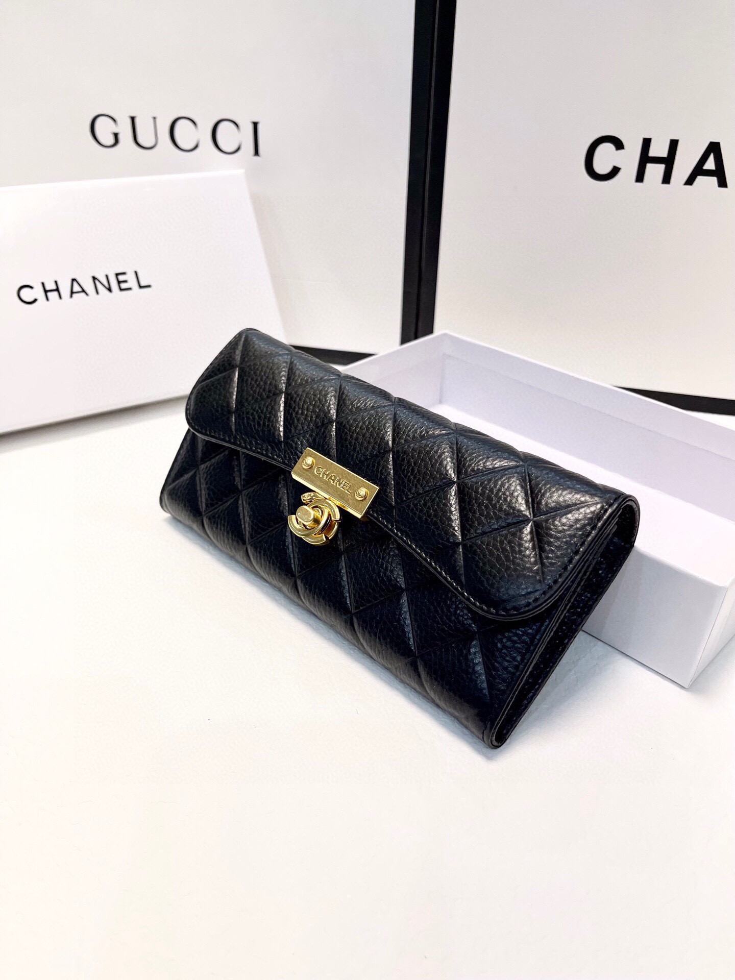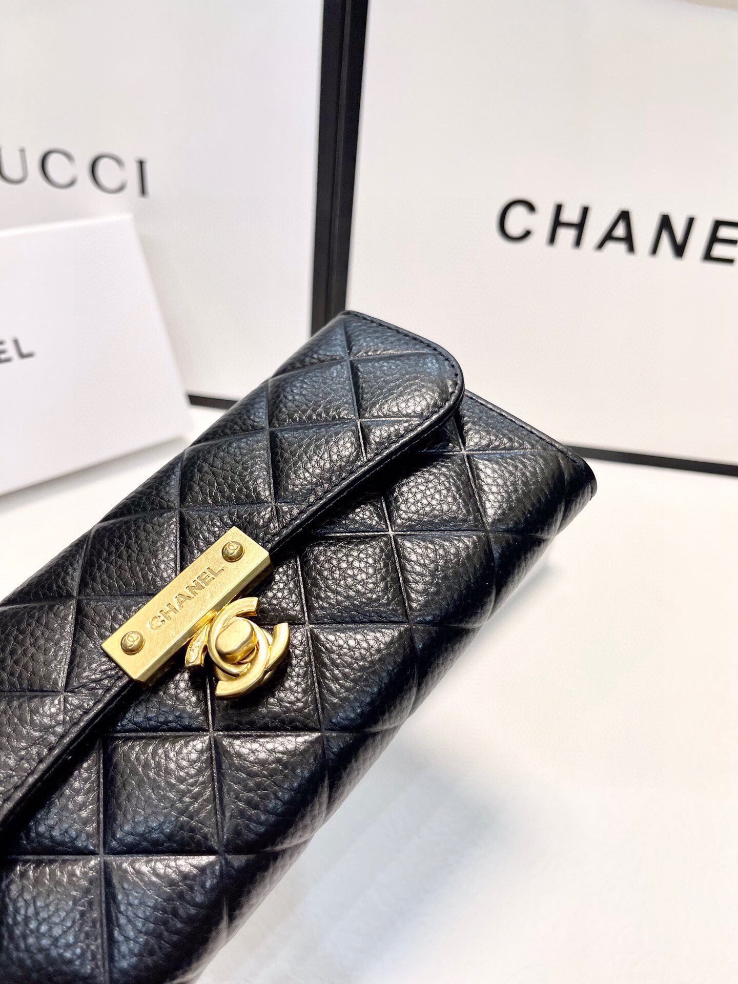 上質なキャビアスキンと輝くココマーク金具が魅力的な、シャネルのラウンドファスナー長財布です