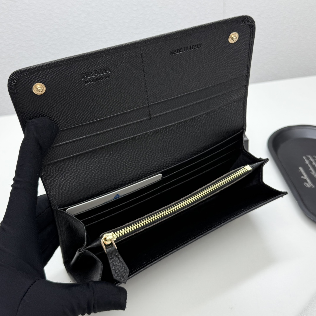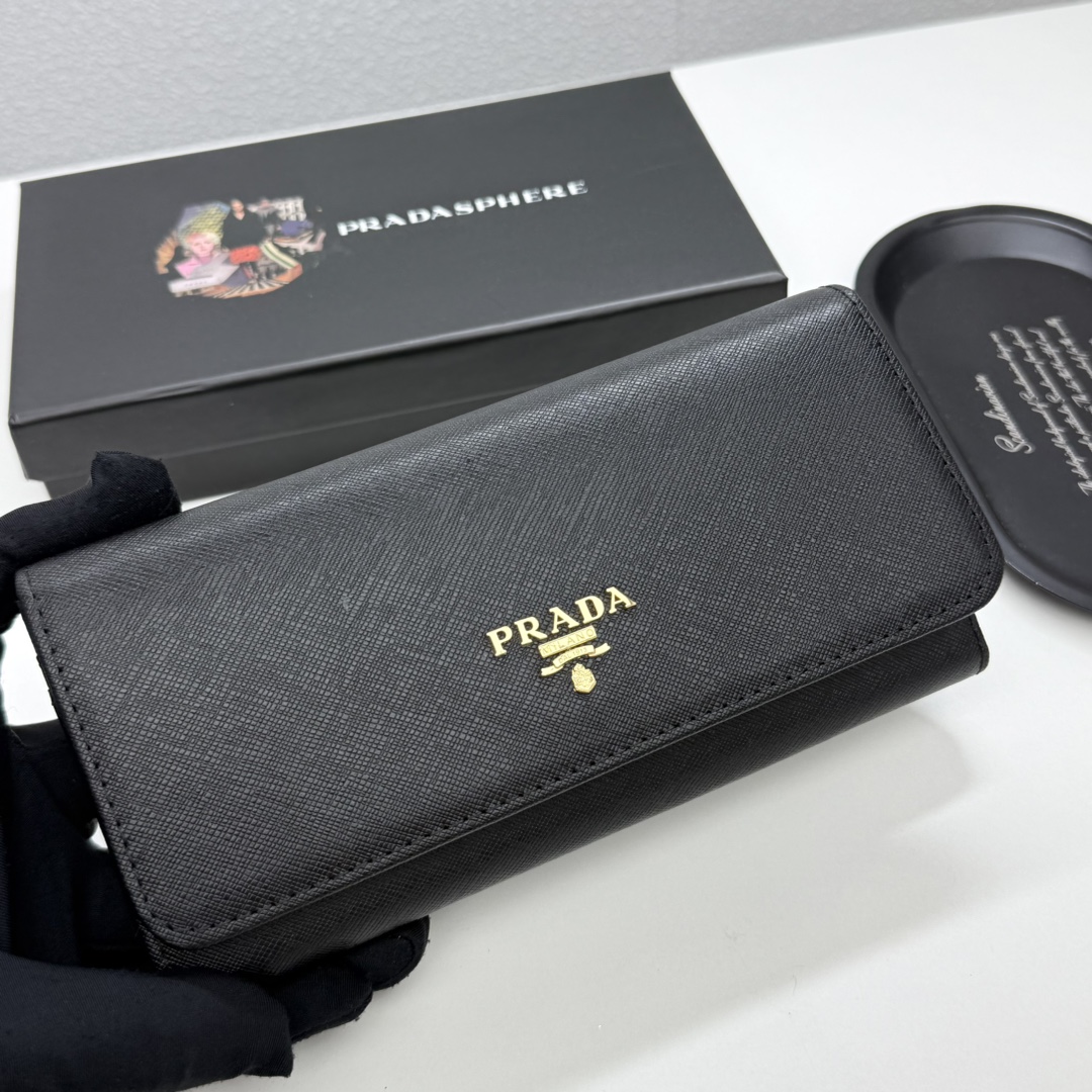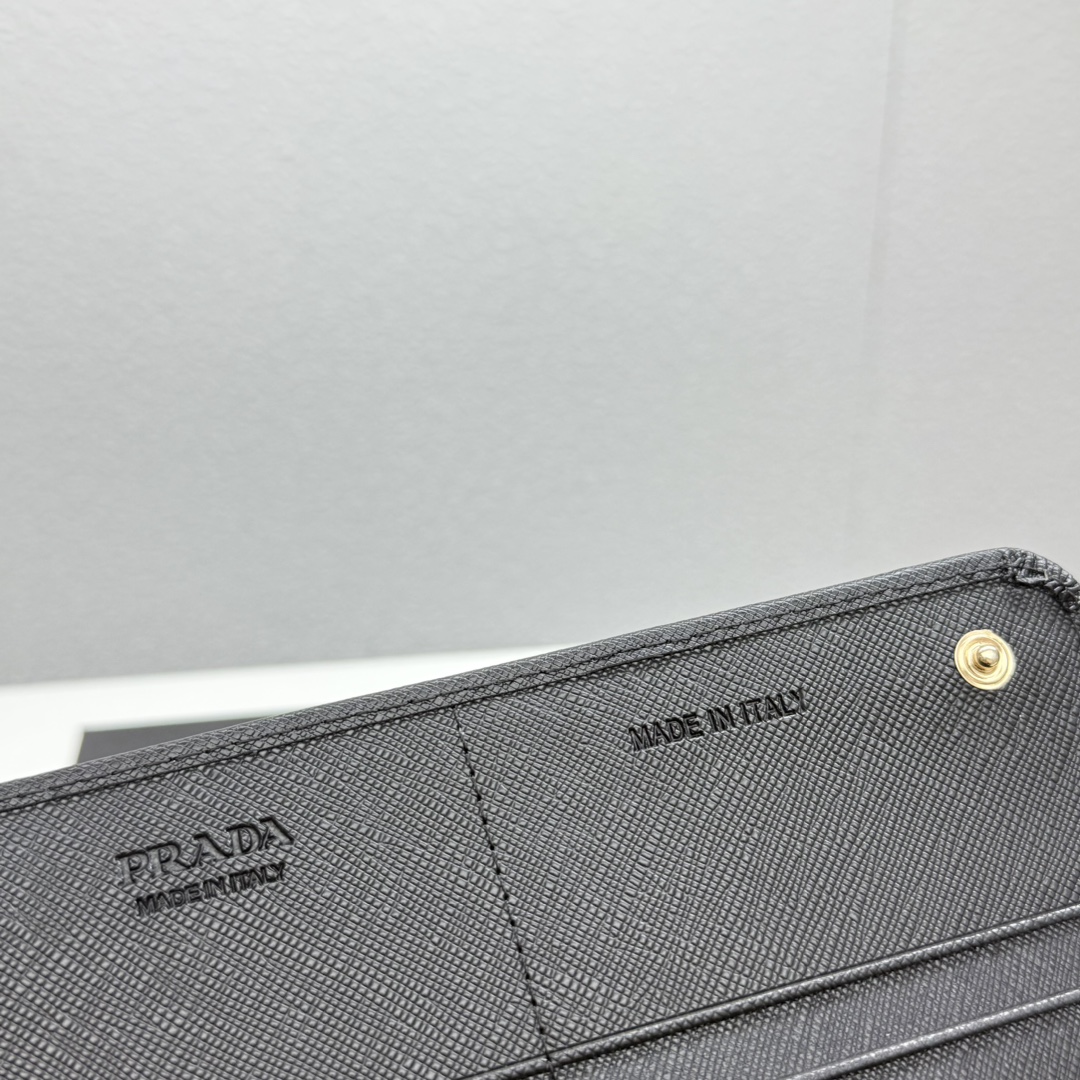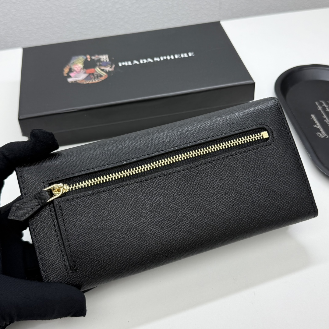 ファスナー開閉式で、紙幣やカード、小銭まで整理しやすく、実用的な収納力を備えています。世界中で愛され続けるプラダのクラフツマンシップが感じられる、耐久性にも優れた一品です。