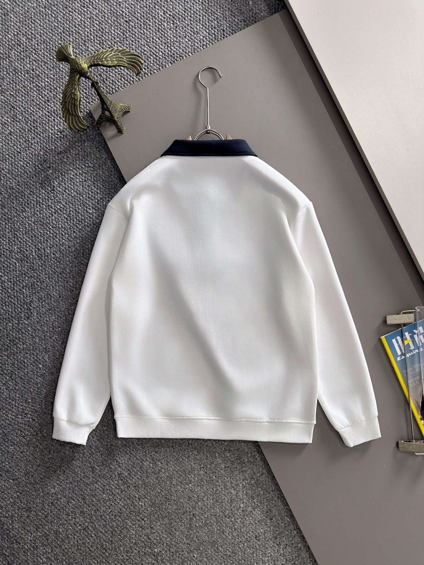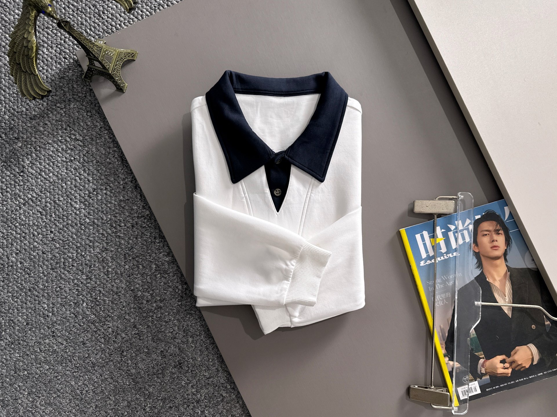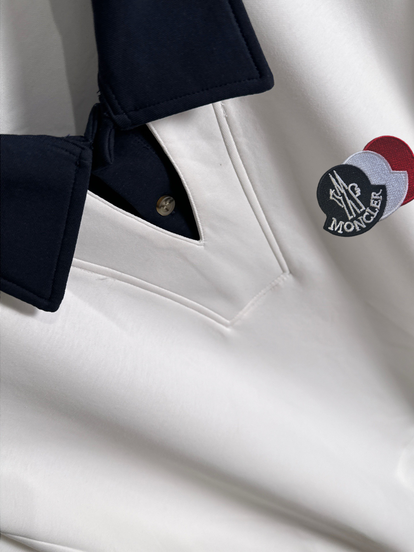 白を基調とし、ネイビーの襟が鮮やかなコントラストを生み、シンプルながらも洗練された印象を与えます。