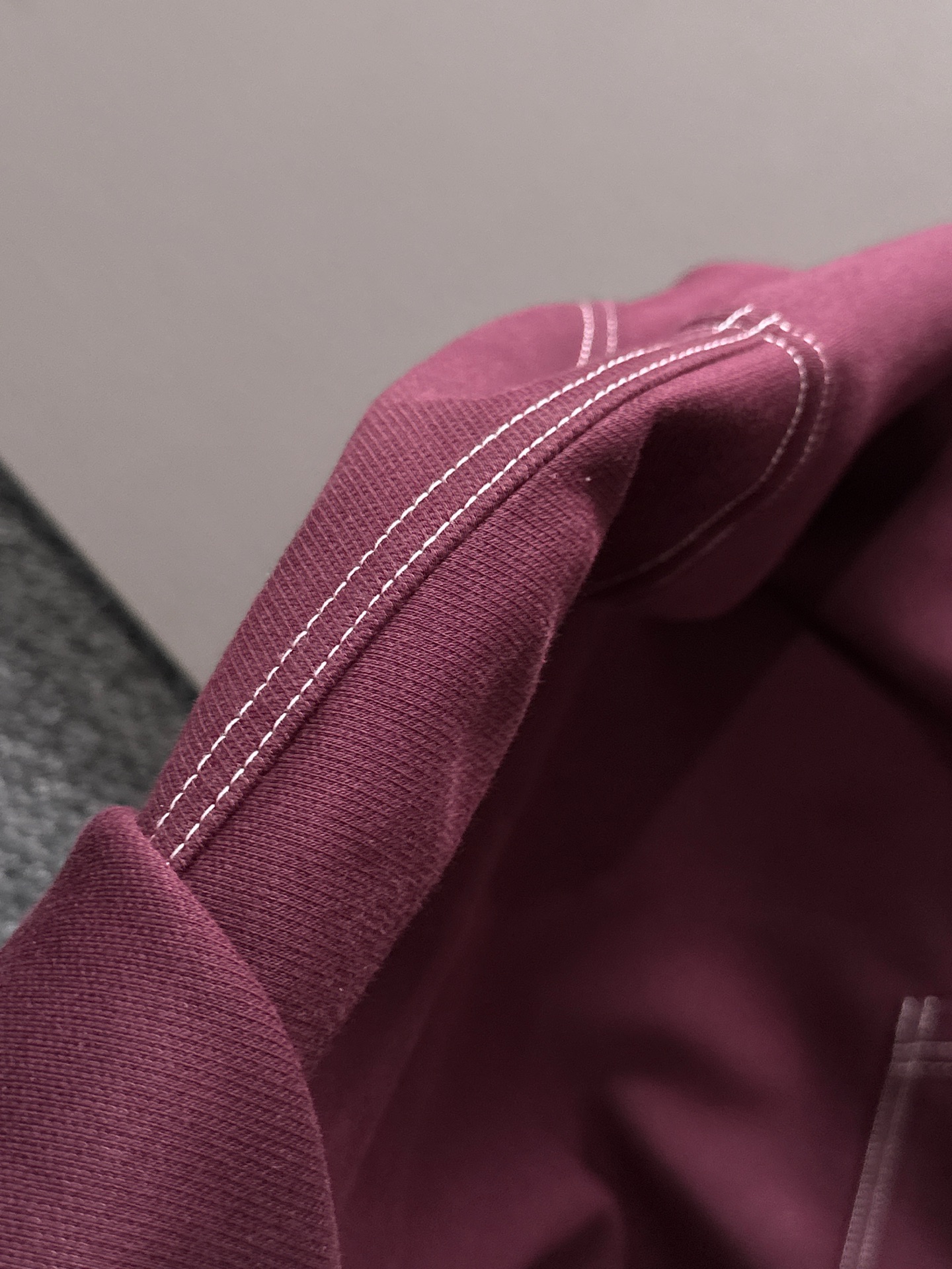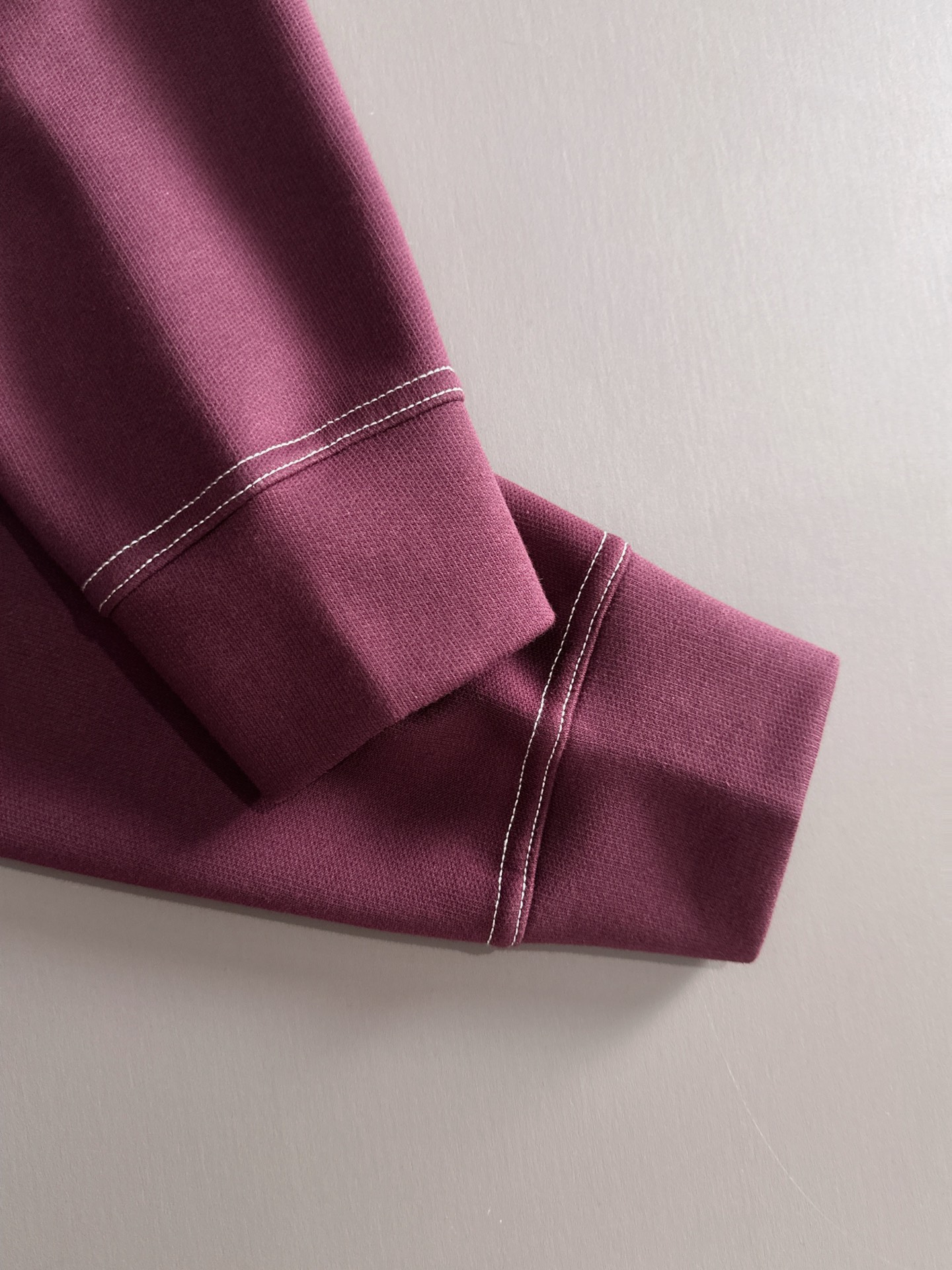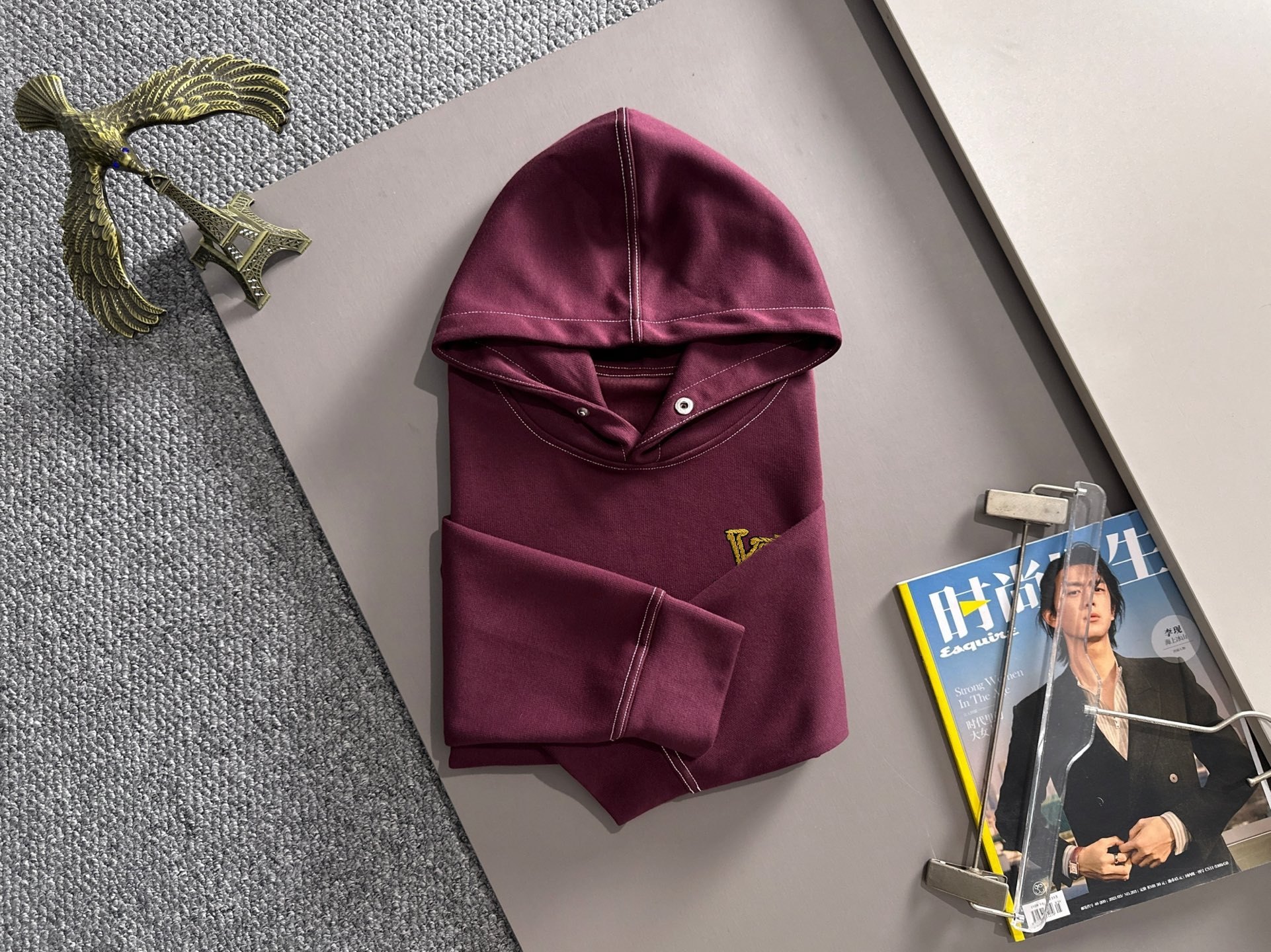 ボルドーの深みのある色合いと、胸元のゴールドの刺繍ロゴが、上質な印象を与えます。