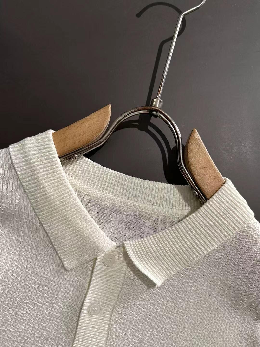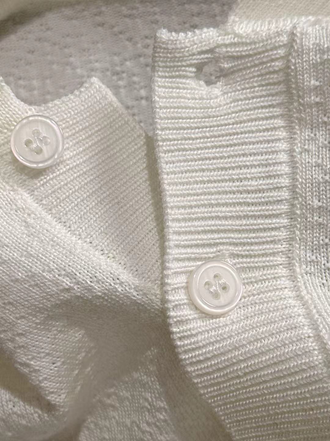 首元のリブ編みと、シンプルなボタンデザインが、