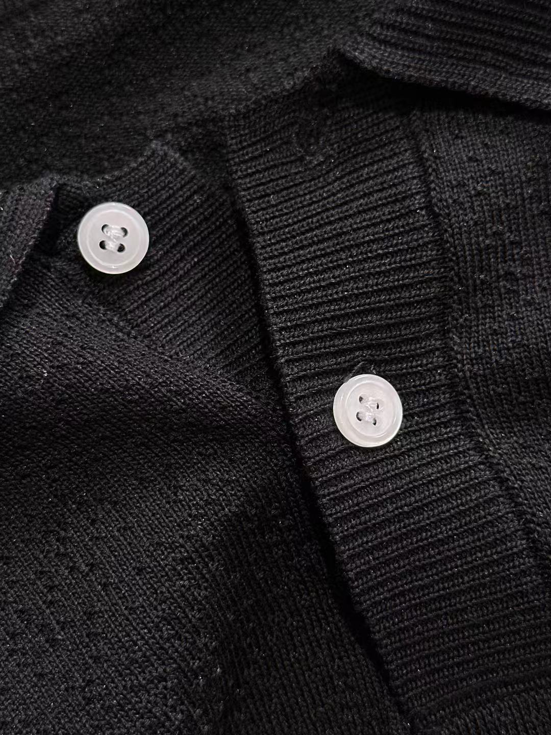 高品質なニット素材を使用しており、肌触りがよく、通気性も抜群。襟元の白いボタンがさりげないアクセントになって、シンプルながらも洗練された印象を与えます。
