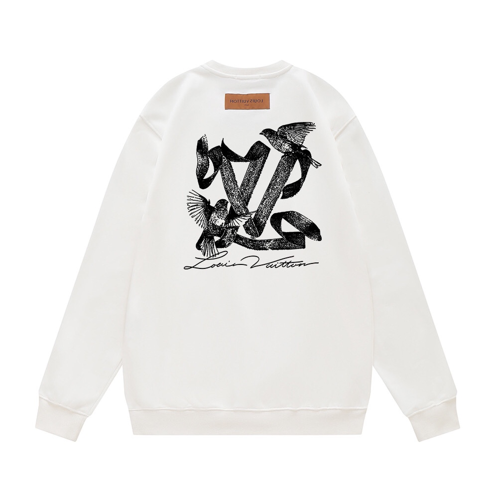 この白いルイヴィトンのレディーススウェットシャツは、シンプルながらも洗練されたデザインが特徴です。 胸元にはブラックのロゴプリント、背面には鳥とリボンが描かれたアートワークが印象的。100コットンの素材は、肌触りが良く、快適な着心地を提供します。