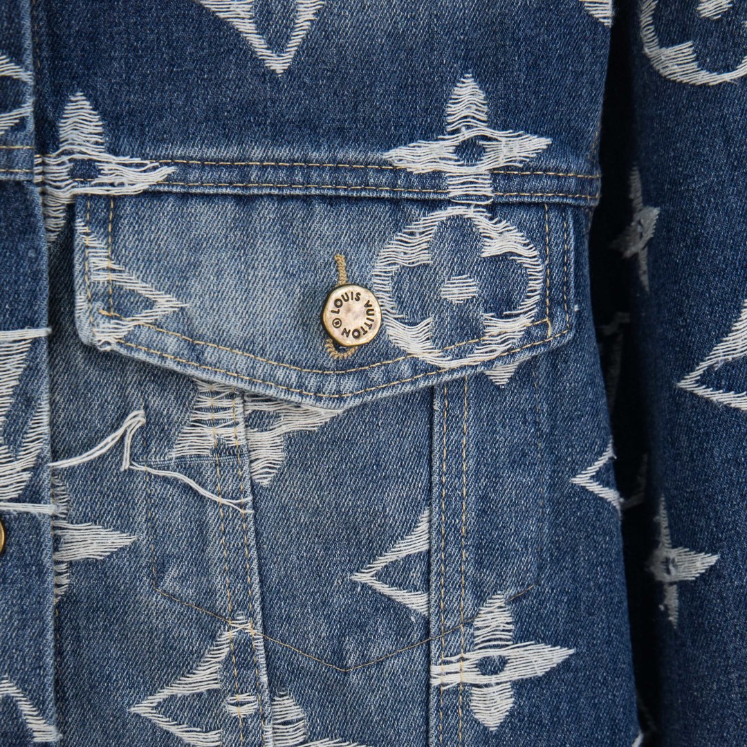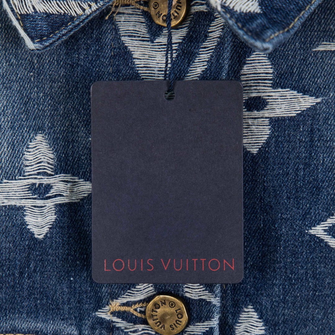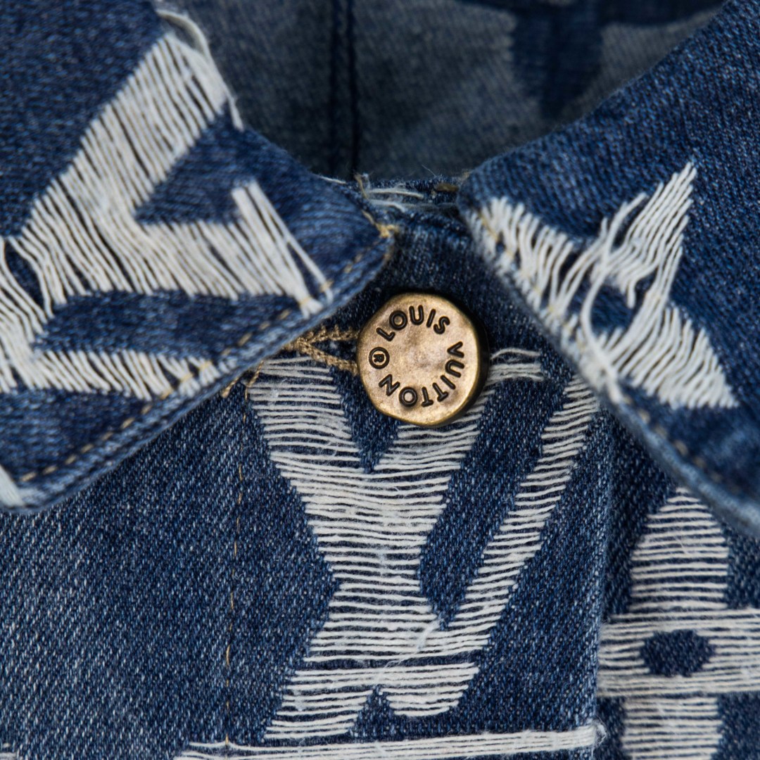 このルイ・ヴィトンのデニムジャケットは、白いモノグラムが全体に散りばめられた、洗練されたブルーのデザインが特徴です。