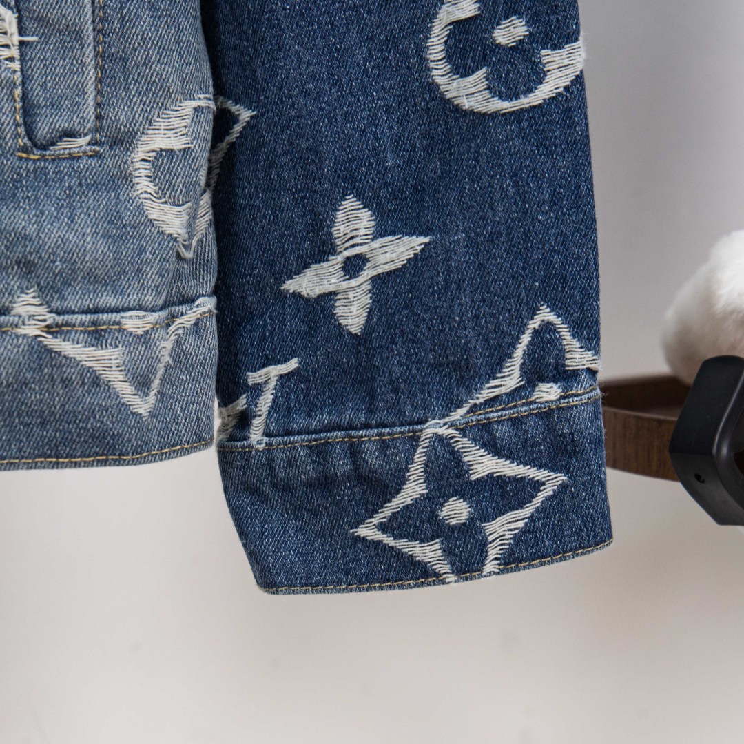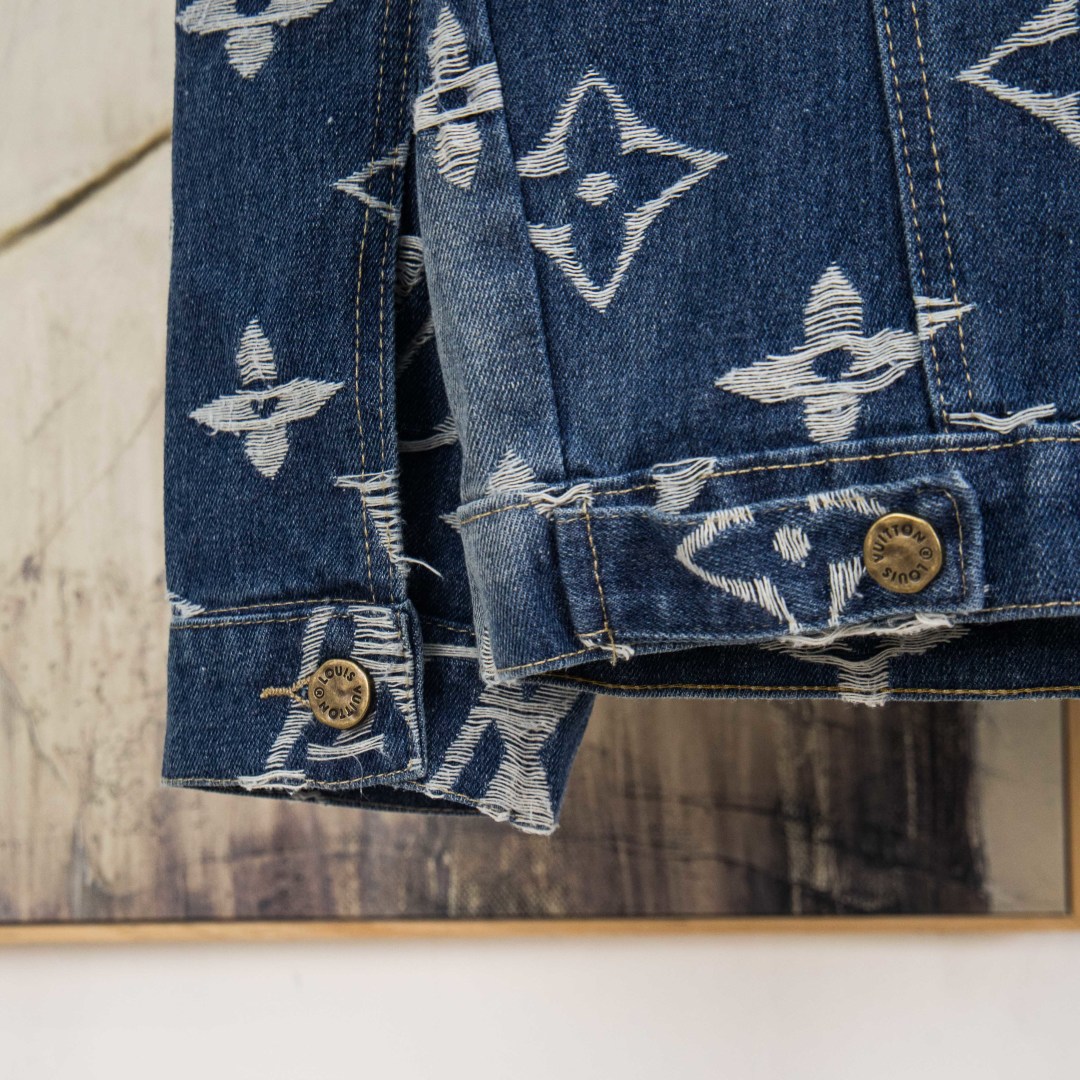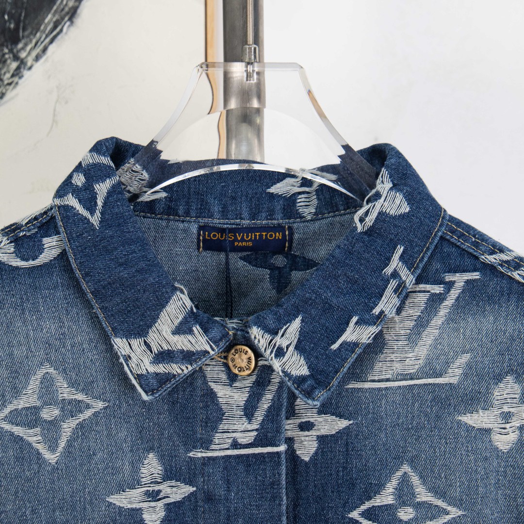 このルイ・ヴィトンのデニムジャケットは、白いモノグラムが全体に散りばめられた、洗練されたブルーのデザインが特徴です。