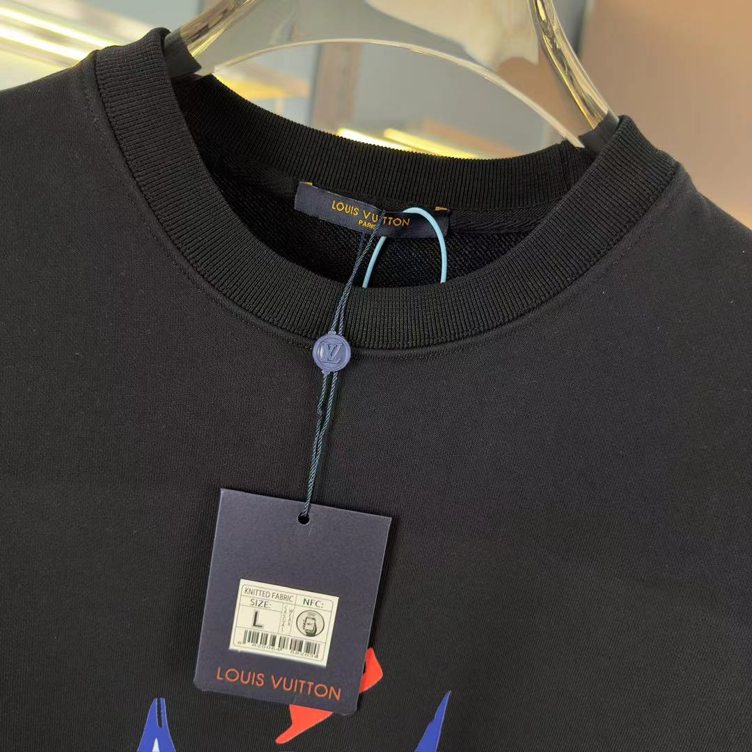 このロングスリーブのルイヴィトンウェアは、アートなプリントが特徴のアイテムです。ブラックの生地に、鮮やかなブルーとレッドのグラフィックが大胆に配置され、他にはない個性を演出します。コットン素材で作られており、着心地も抜群です。普段使いからちょっとしたお出かけまで、様なシーンで活躍します。また、裏側の黄色いブランドタグが、高級感を際立たせています。このルイヴィトンのロングスリーブウェア、ぜひお試しになってみてはいかがでしょうか?