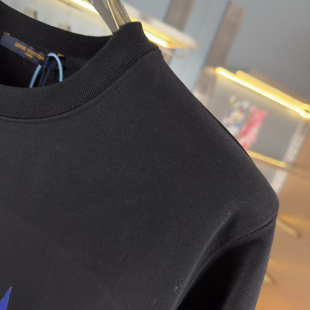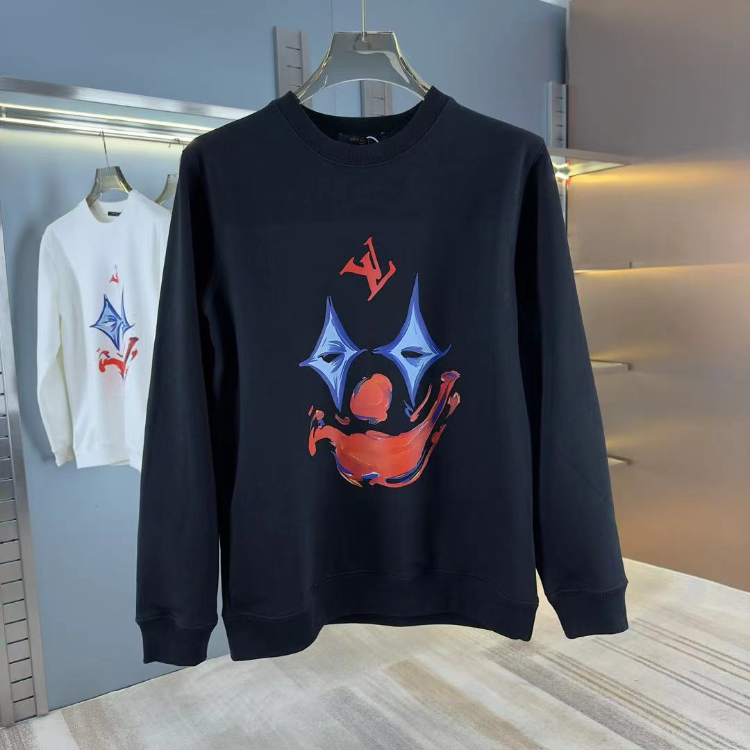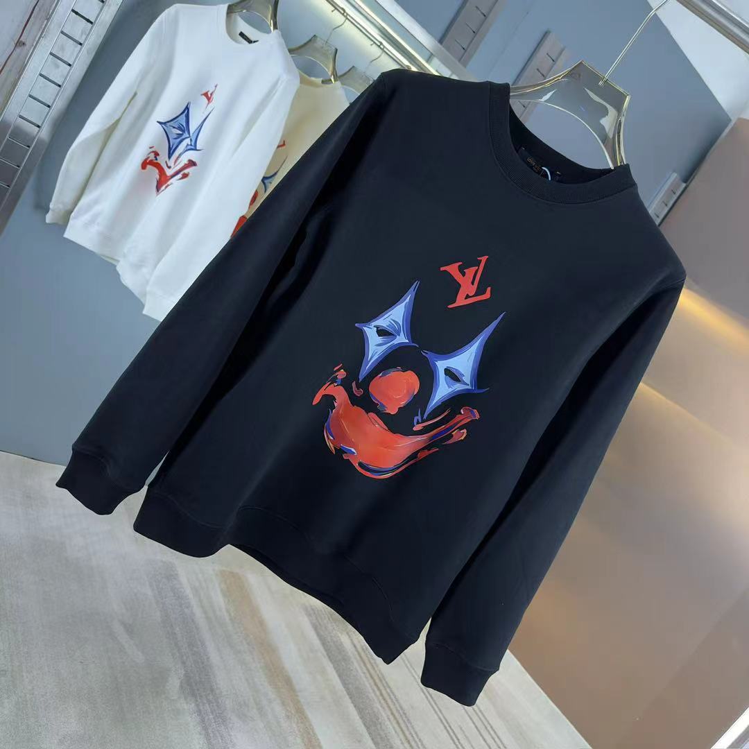 この黒いルイ・ヴィトンのスウェットシャツは、大胆なアートワークが特徴です。キャラクターのデザインが印象的な、今シーズンの注目アイテムです。