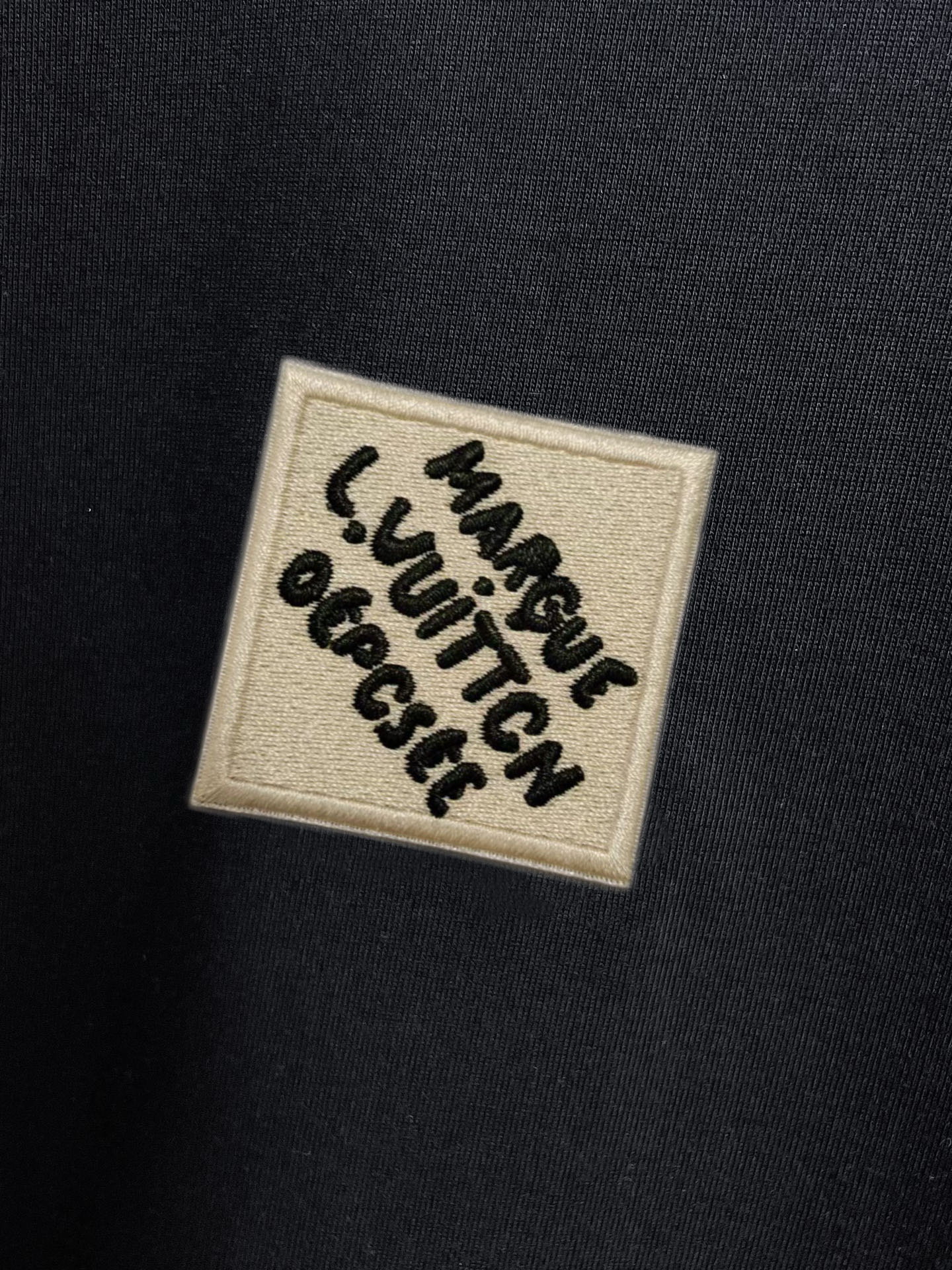 シンプルな黒地に、左胸に「MARQUE L.VUITTON O.P.C.S.T.E.」と刺繍されたパッチが、さりげないアクセントに。