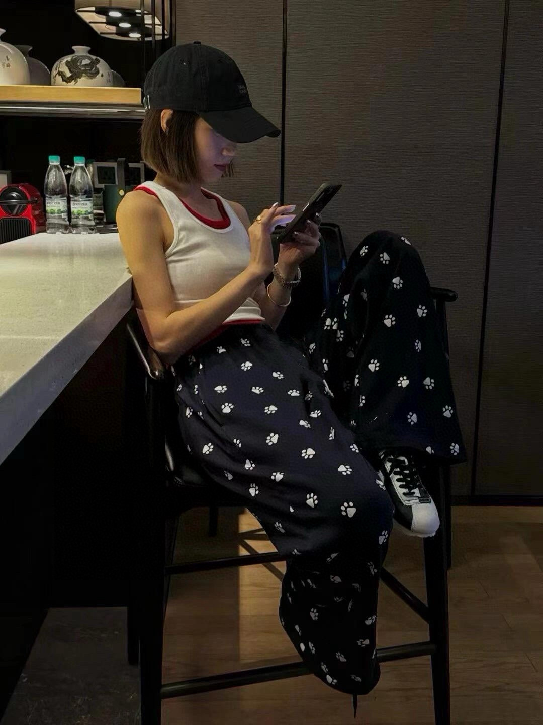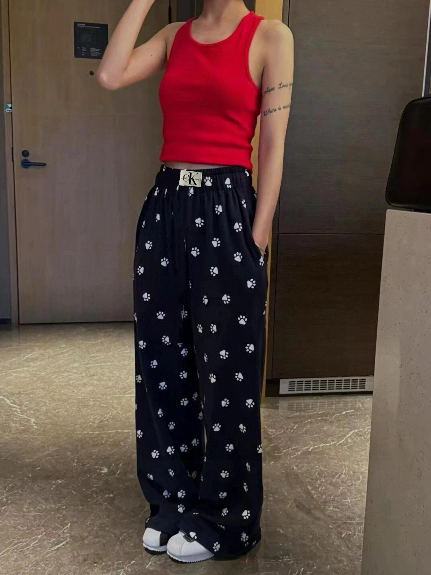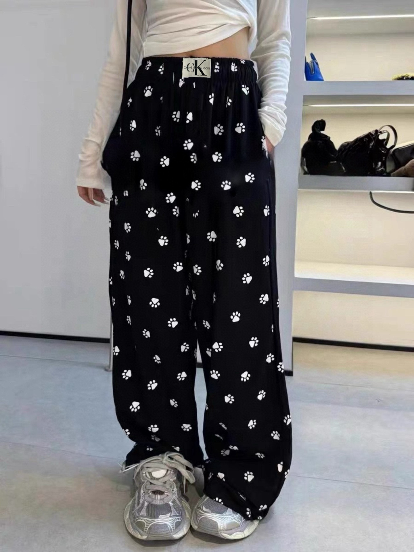 このパンツは、ルイ・ヴィトンのレディースウェアに見られるような、ペットフレンドリーなデザインが特徴です。黒地に白い足跡柄が散りばめられ、普段使いからお出かけまで幅広く活躍します。