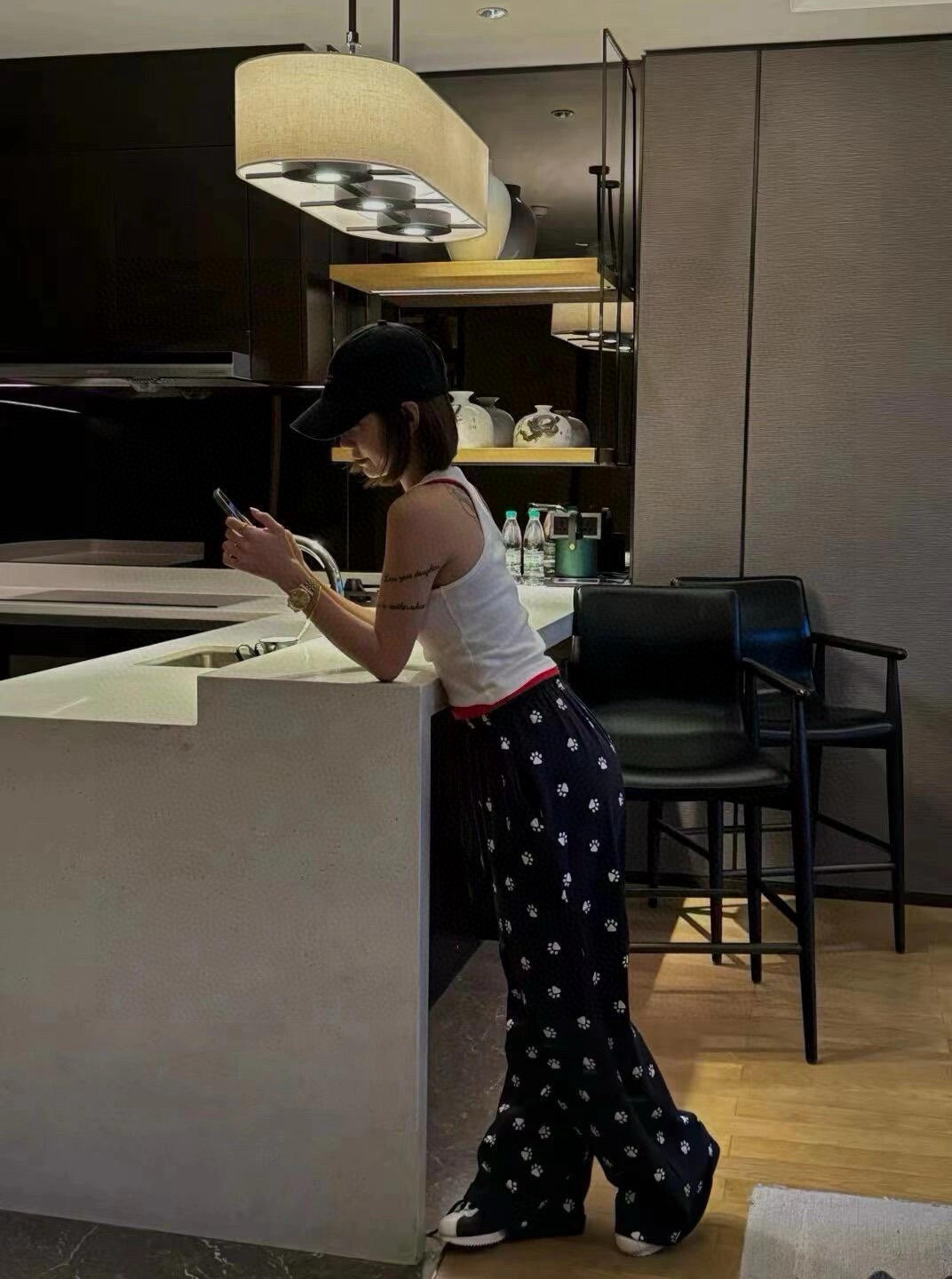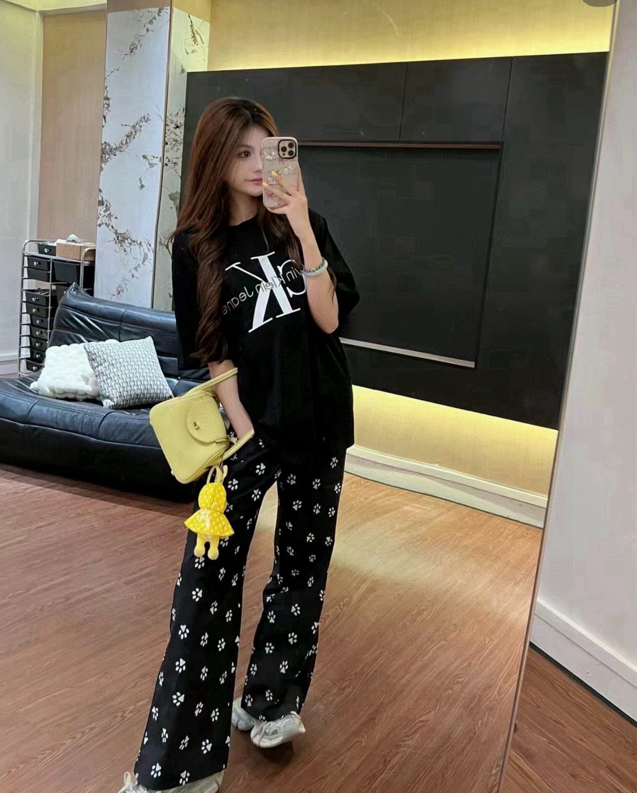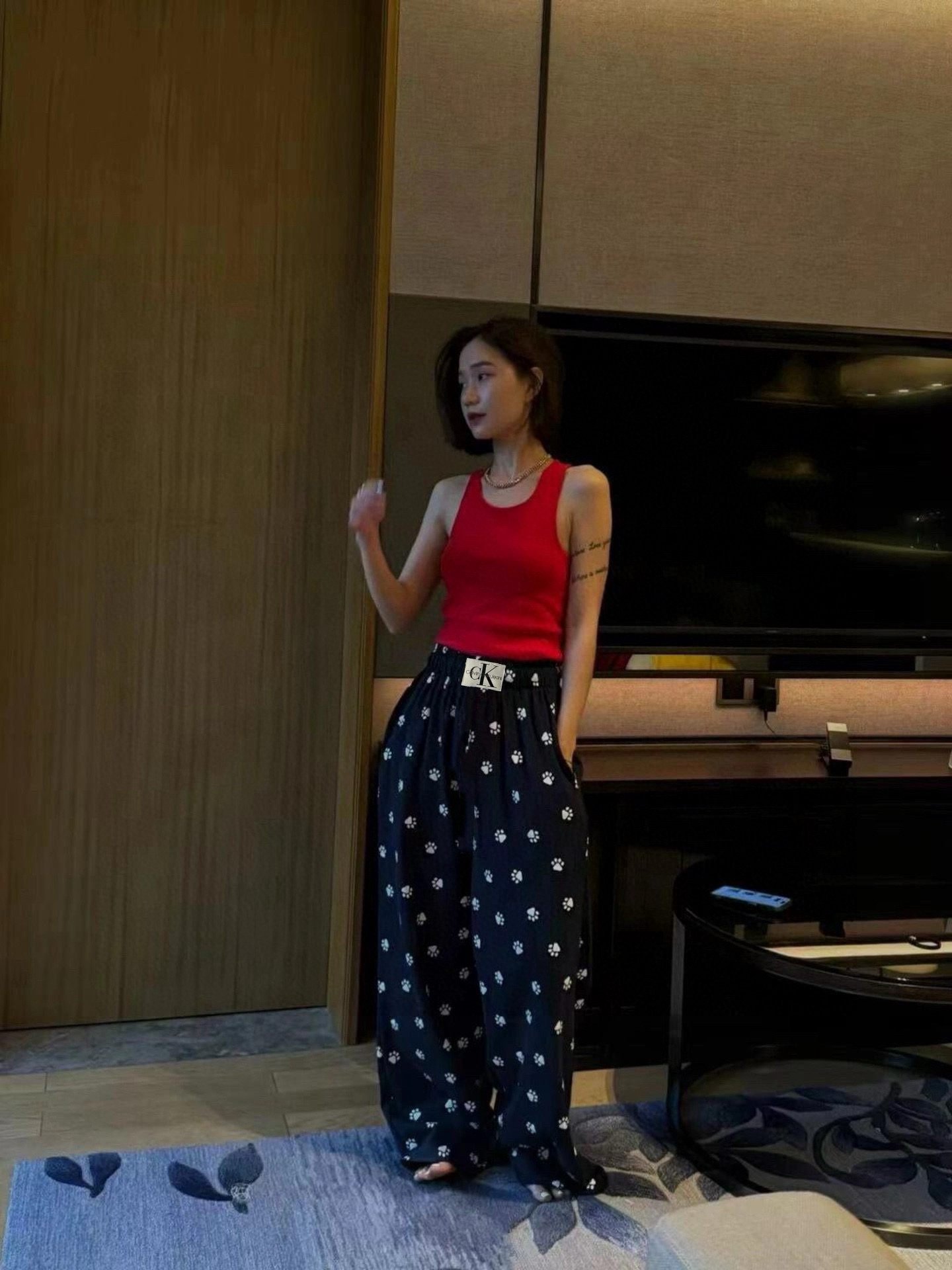 このパンツは、ルイ・ヴィトンのレディースウェアに見られるような、ペットフレンドリーなデザインが特徴です。黒地に白い足跡柄が散りばめられ、普段使いからお出かけまで幅広く活躍します。