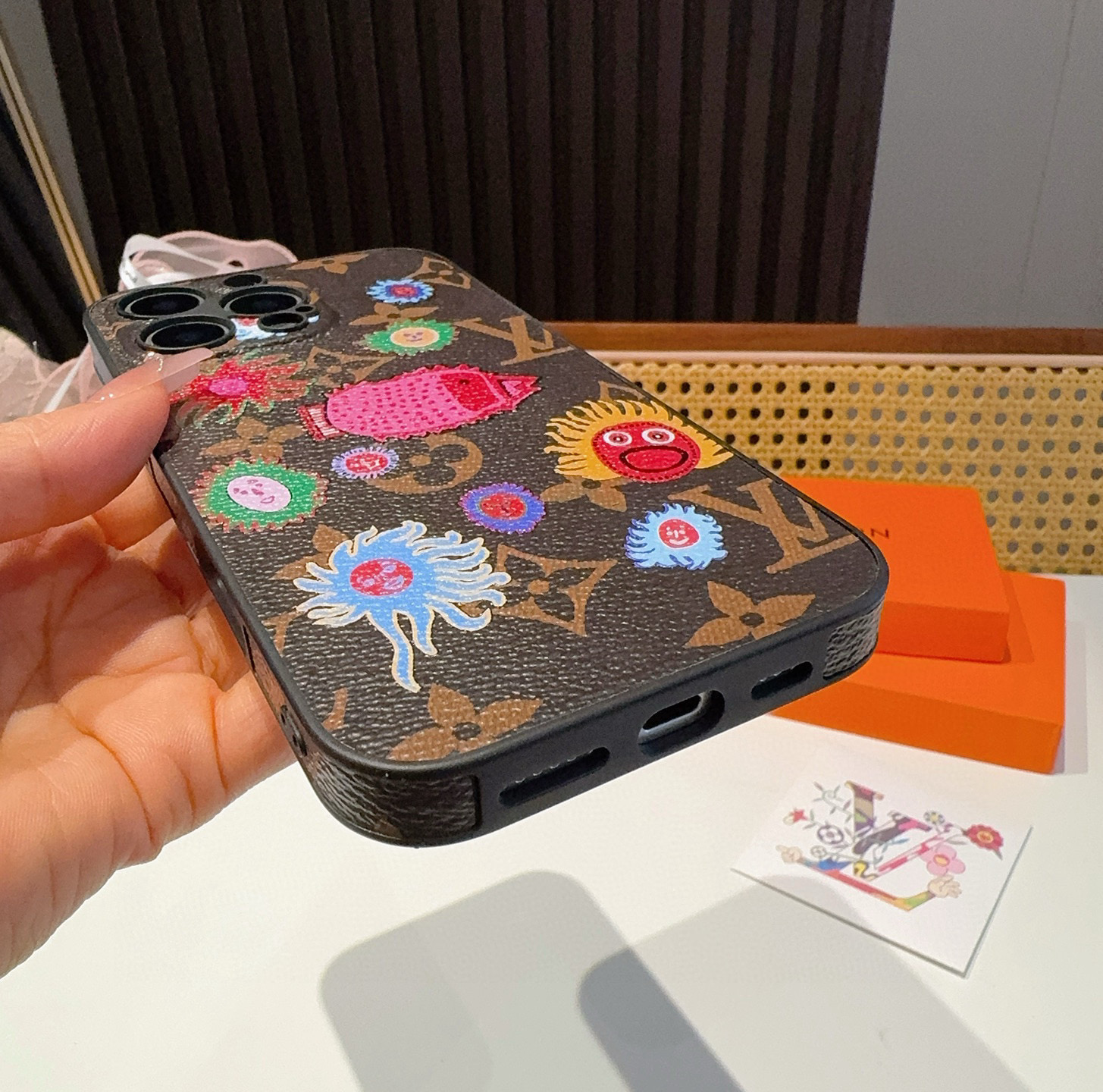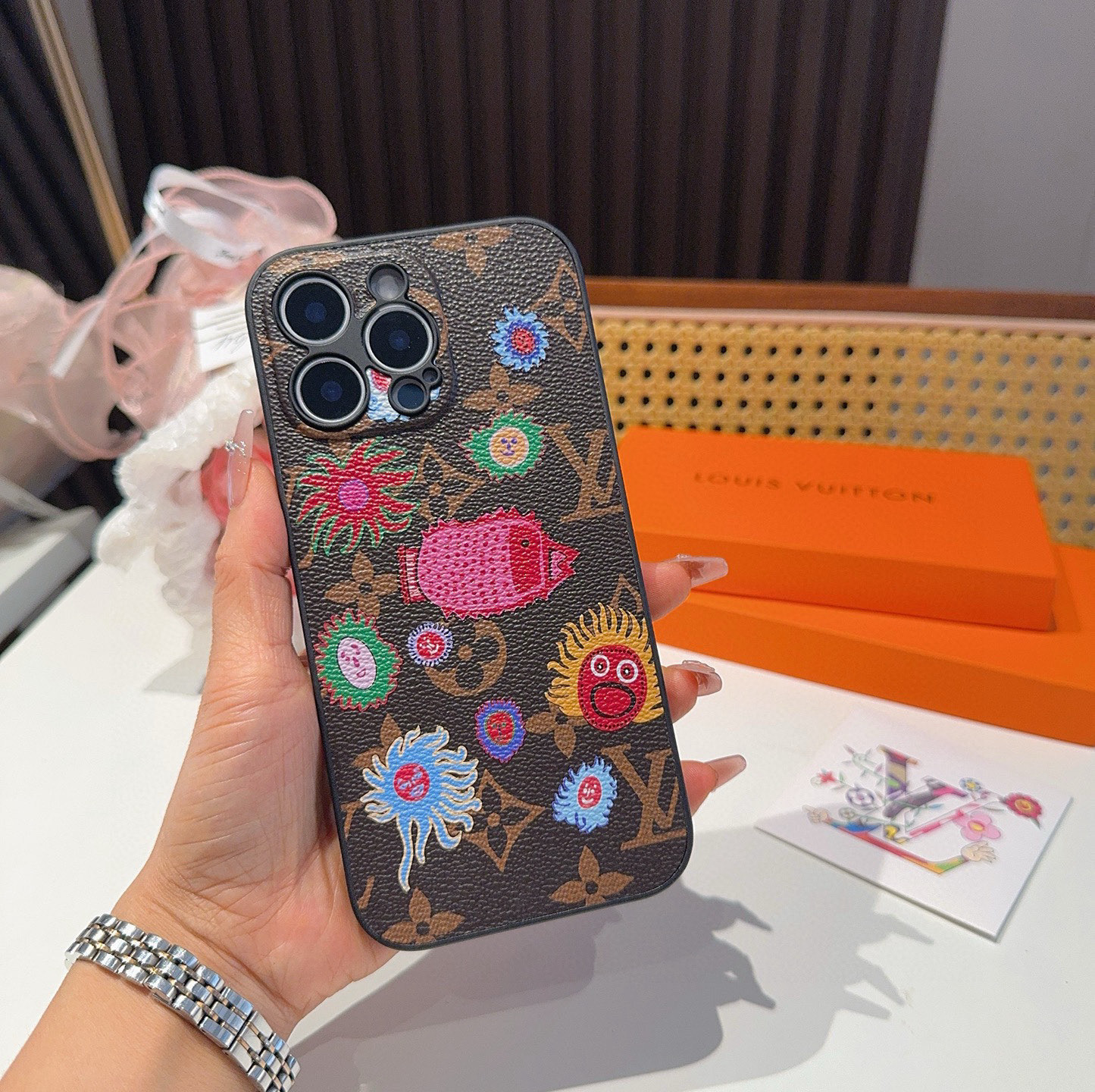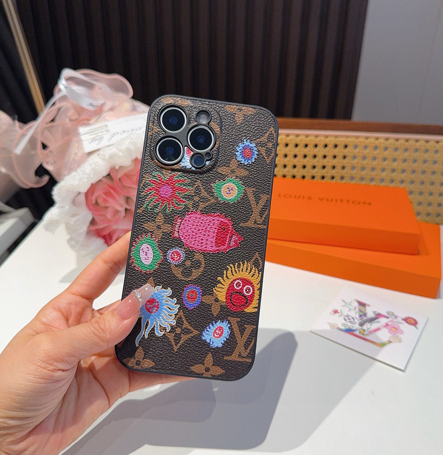 このiPhoneケースは、ルイヴィトンの豪華なモノグラム柄をベースに、世界中で注目を集めるアーティストとのコラボレーションで生まれました。 深みのあるブラウンのキャンバス地に、鮮やかな刺繍で描かれたカラフルな花柄や、ユニークなキャラクターが散りばめられており、個性を際立たせる一品です。高品質な素材を使用しており、耐久性と手触りの良さも抜群です。