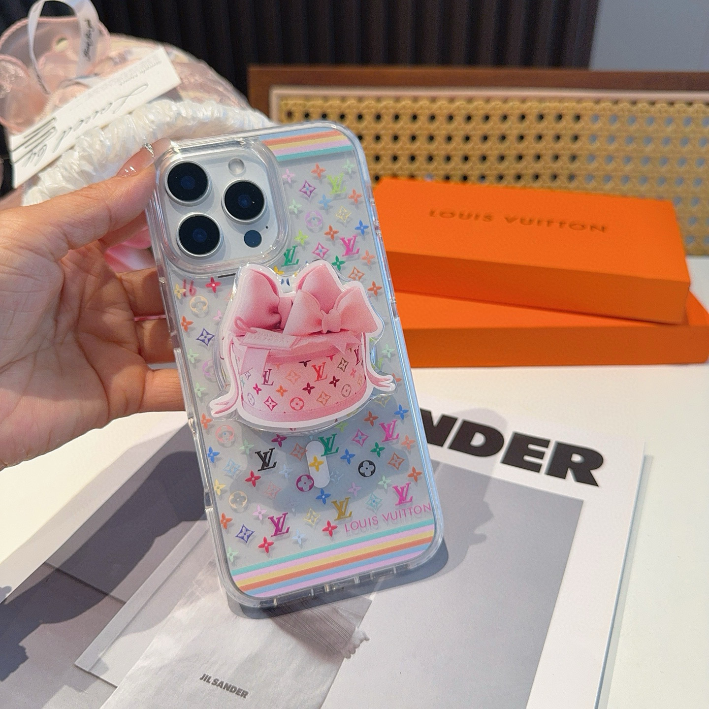 このiPhoneケースは、透明な素材にマルチカラーのモノグラムと、かわいらしいピンクのリボン付きクラッチ型スタンドが特徴です。