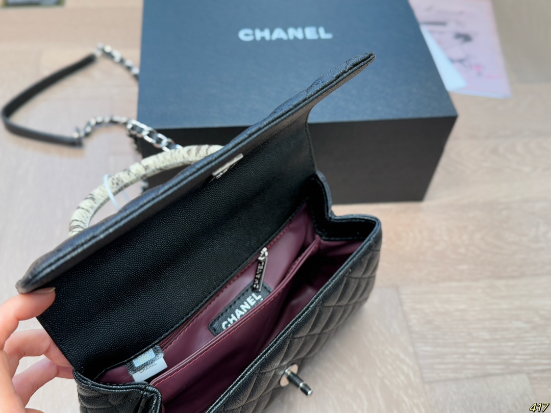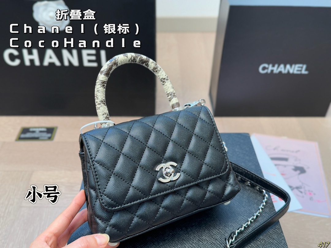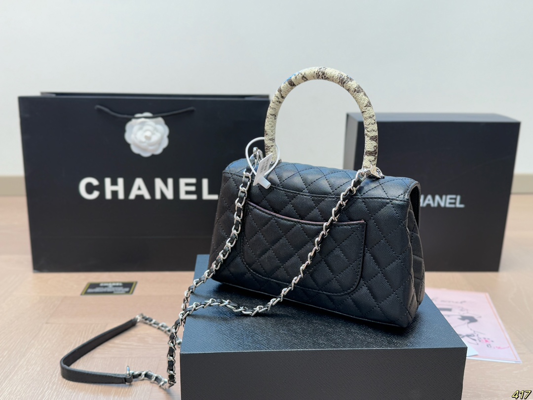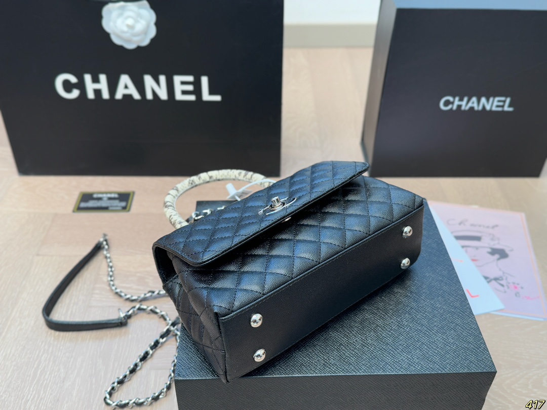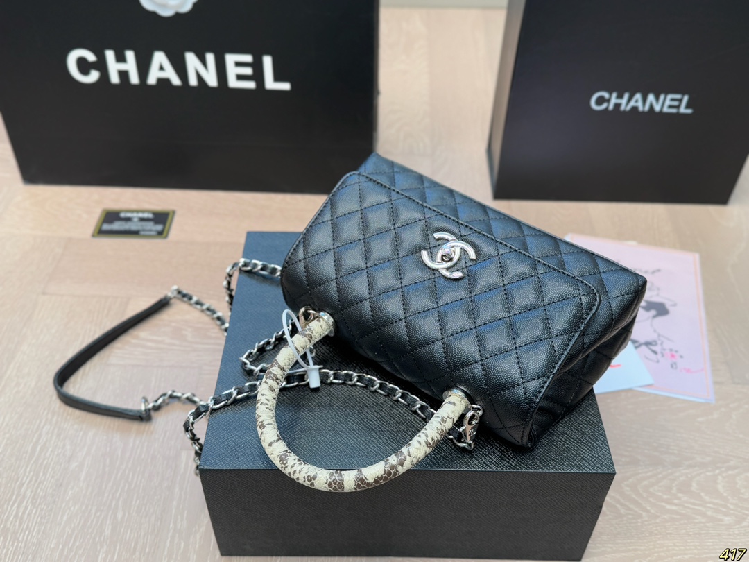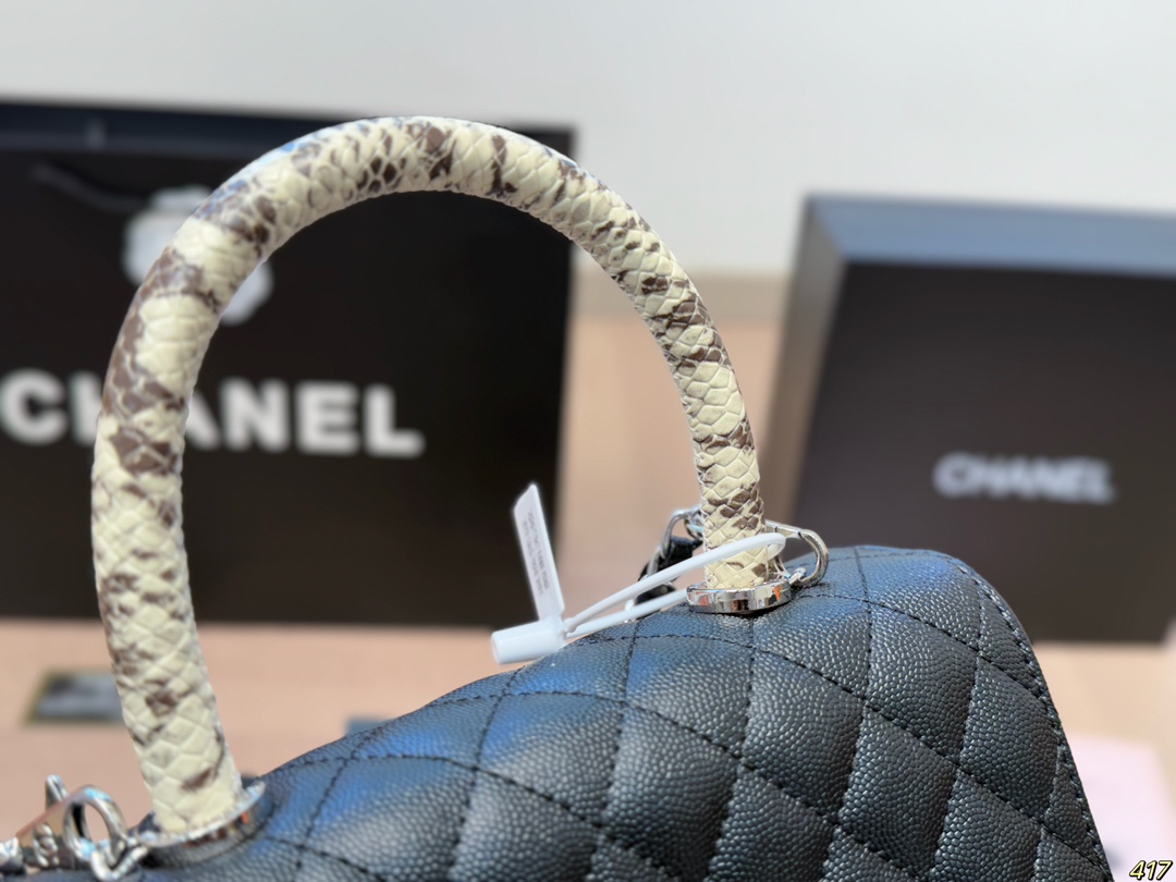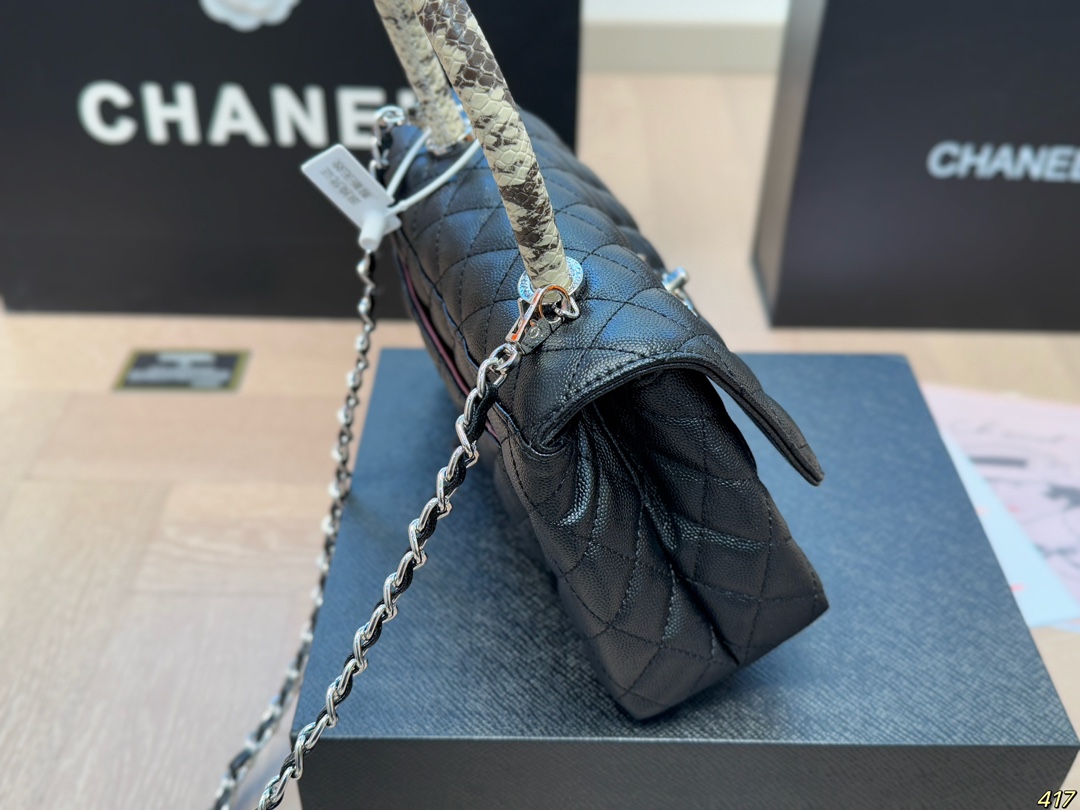シャネルのCocoHandleバッグ、黒色の2サイズ4色展開です。 本体は上質なレザーで、クラシックなキルティング加工が施されていて、光沢感がとても素敵です。ハンドルは蛇柄の素材で、高級感と個性を演出しています。 しかも、チェーンストラップも付いているので、ショルダーバッグとしても使えるんです。これ、とっても便利ですよね?