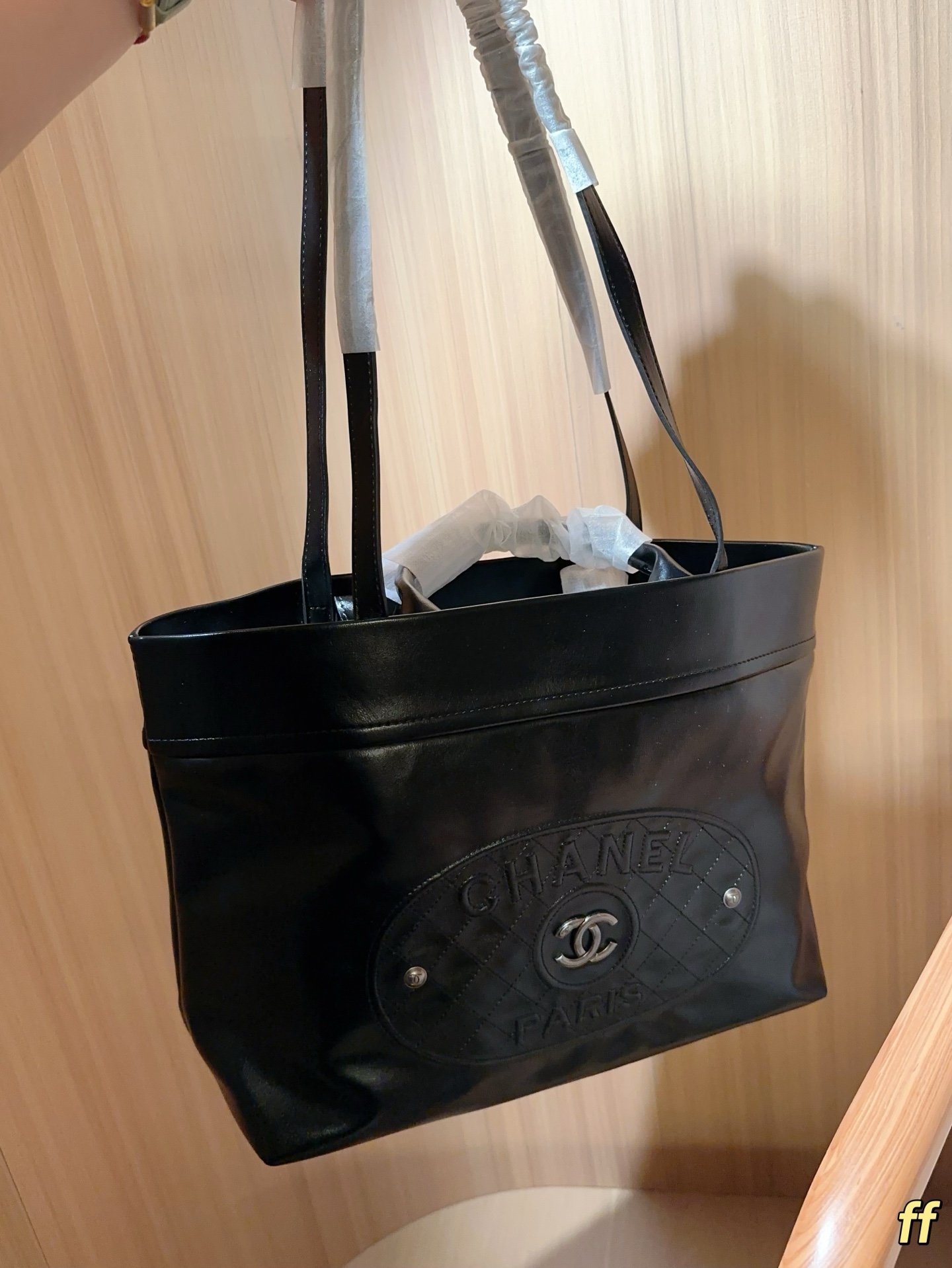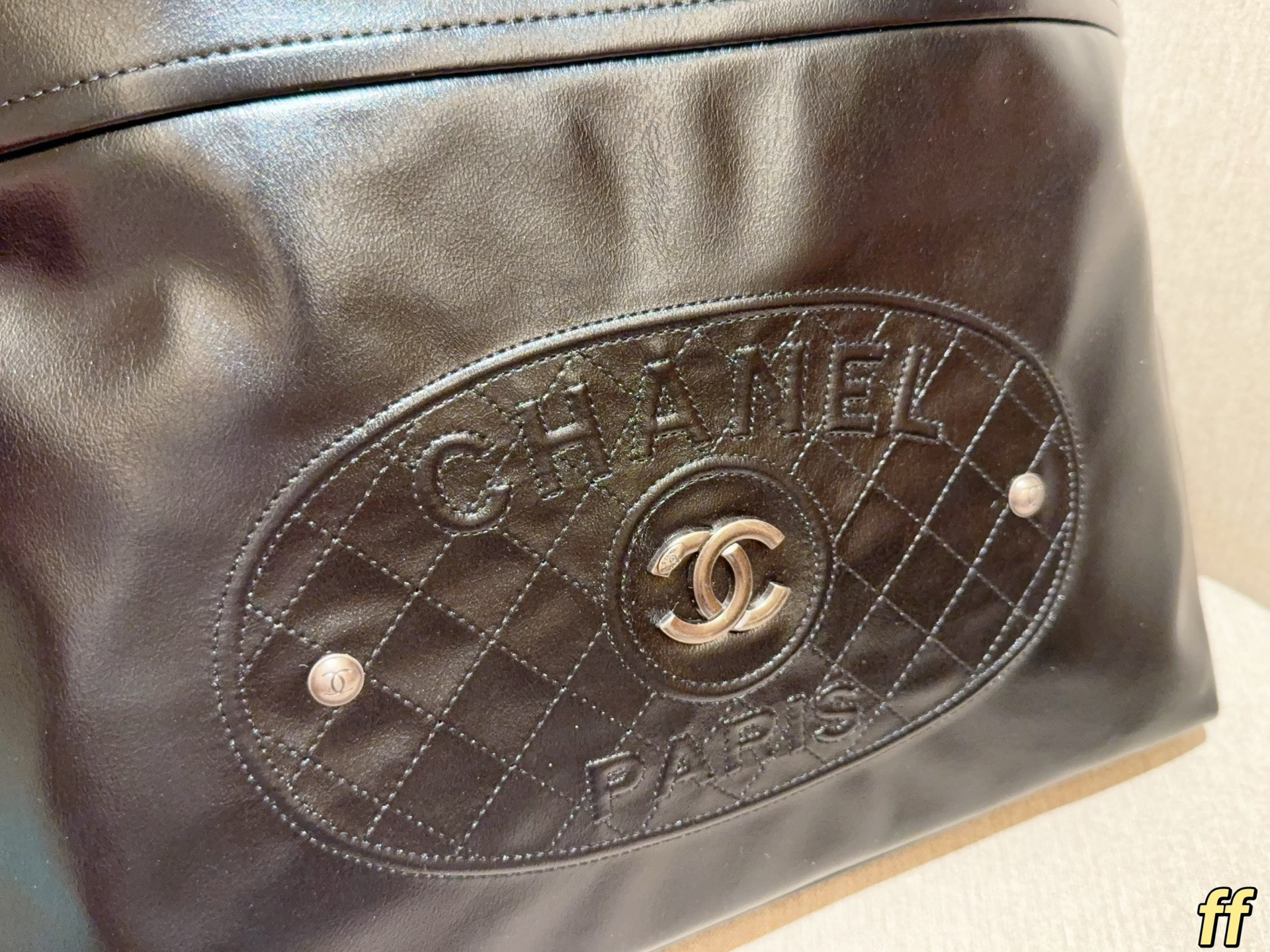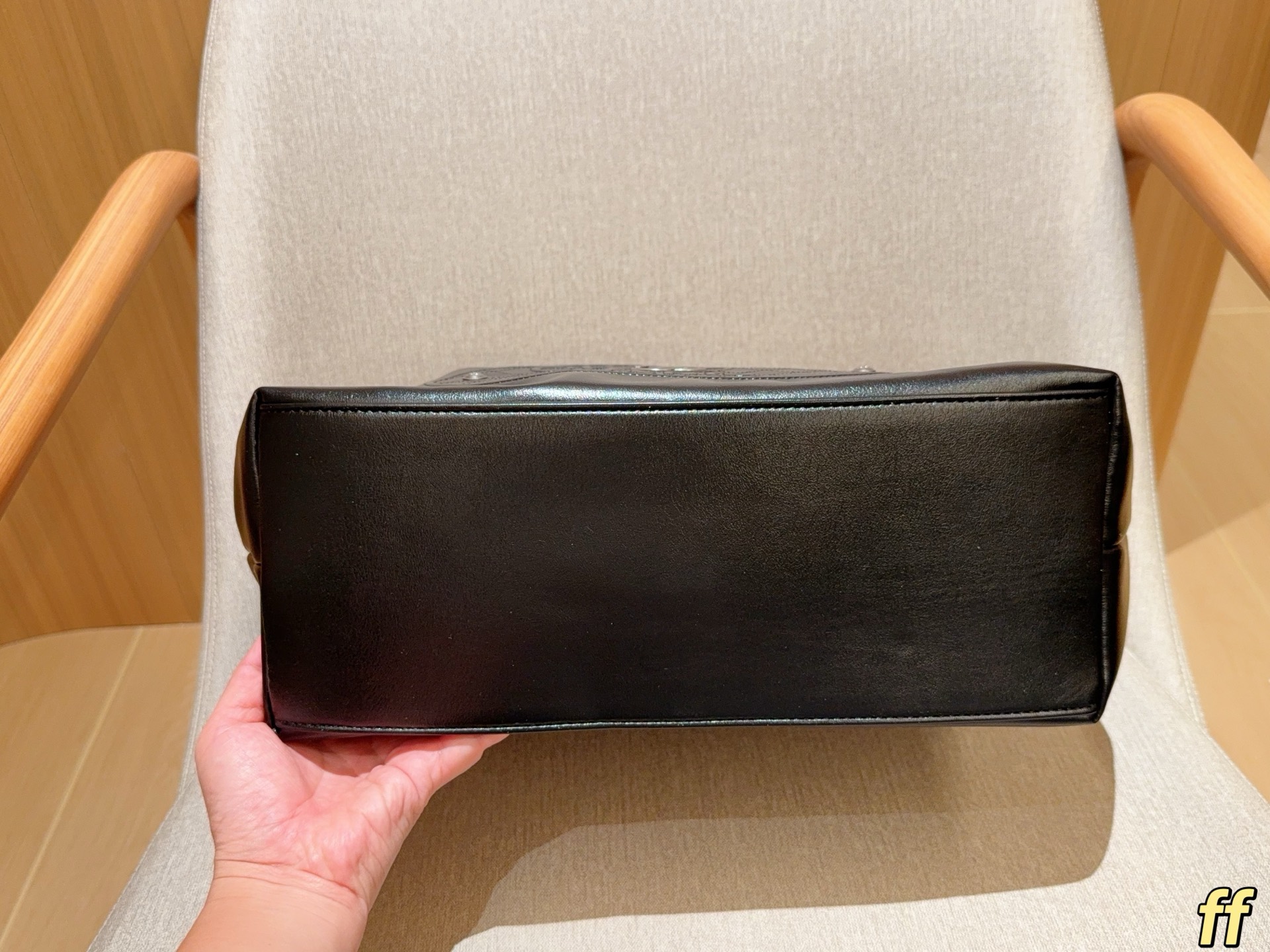 黒のCHANELファミリーバッグは、高級感あふれる光沢のあるレザーで作られています。前面には、象徴的なシルバーロゴとクアトロロゴが入ったワンポイントのパッチが施されており、デザインのポイントになっています。手に取ると、しっかりとした作りと質感が伝わってきます。これは、ショッピングや日常のちょっとしたお出かけに最適なバッグです。マットなブラックカラーは、どんな服装にも合わせやすく、オールラウンドに活躍します。