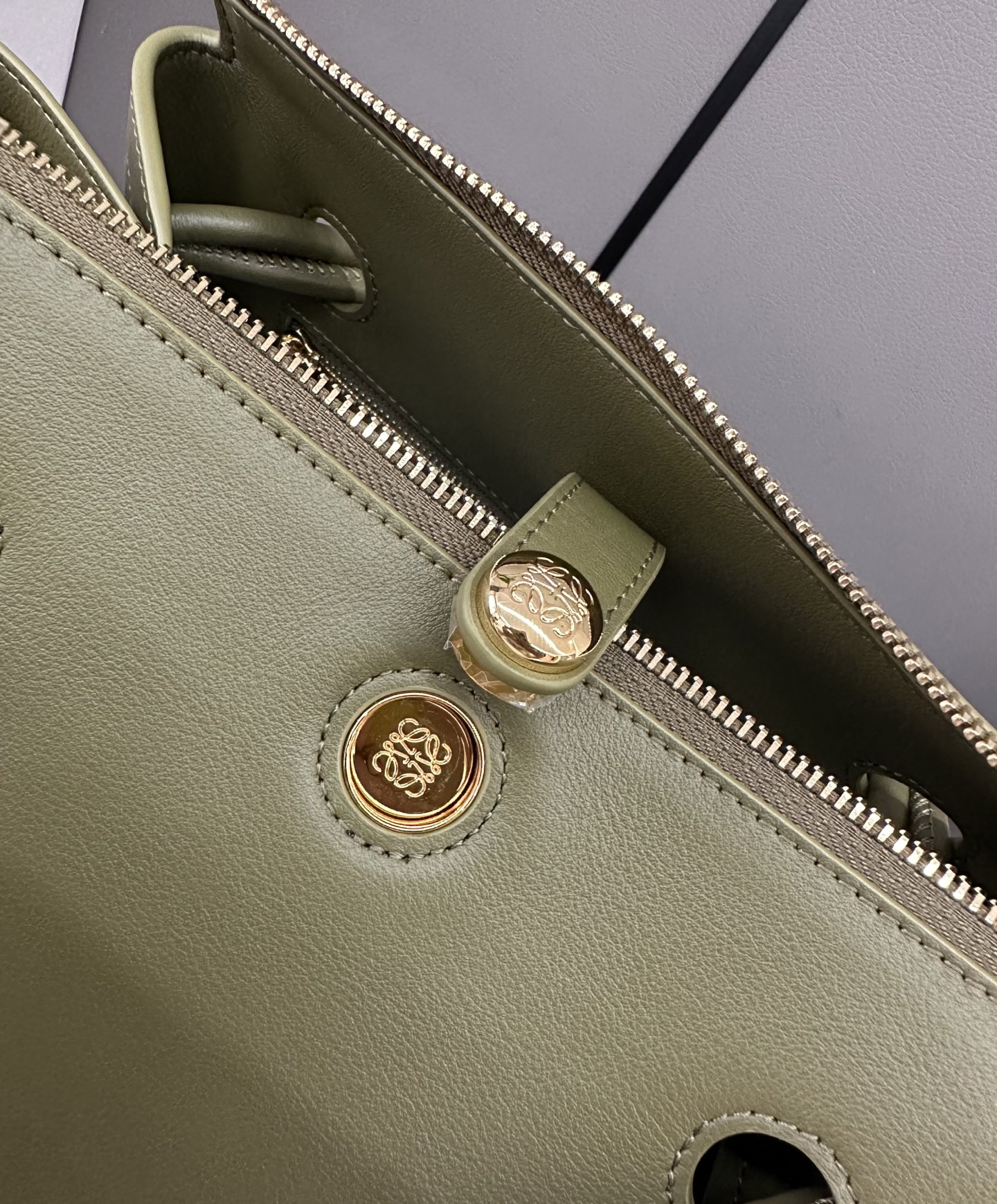このロエベのグリーンミニハンドバッグは、上質なレザーを使用しており、滑らかで美しい光沢が特徴です。 1色の限定カラーで、落ち着いたグリーンがおしゃれな印象を与えます。