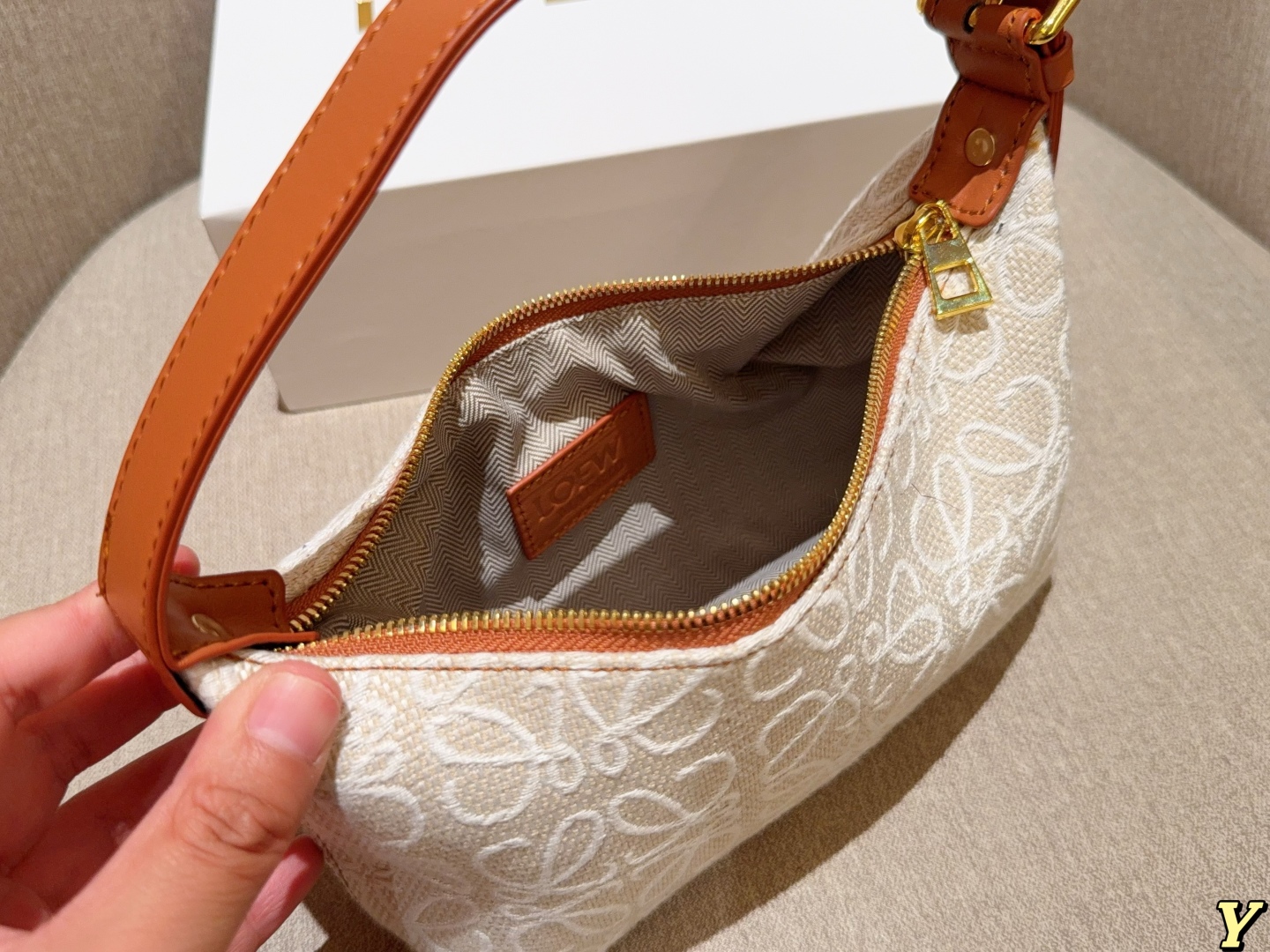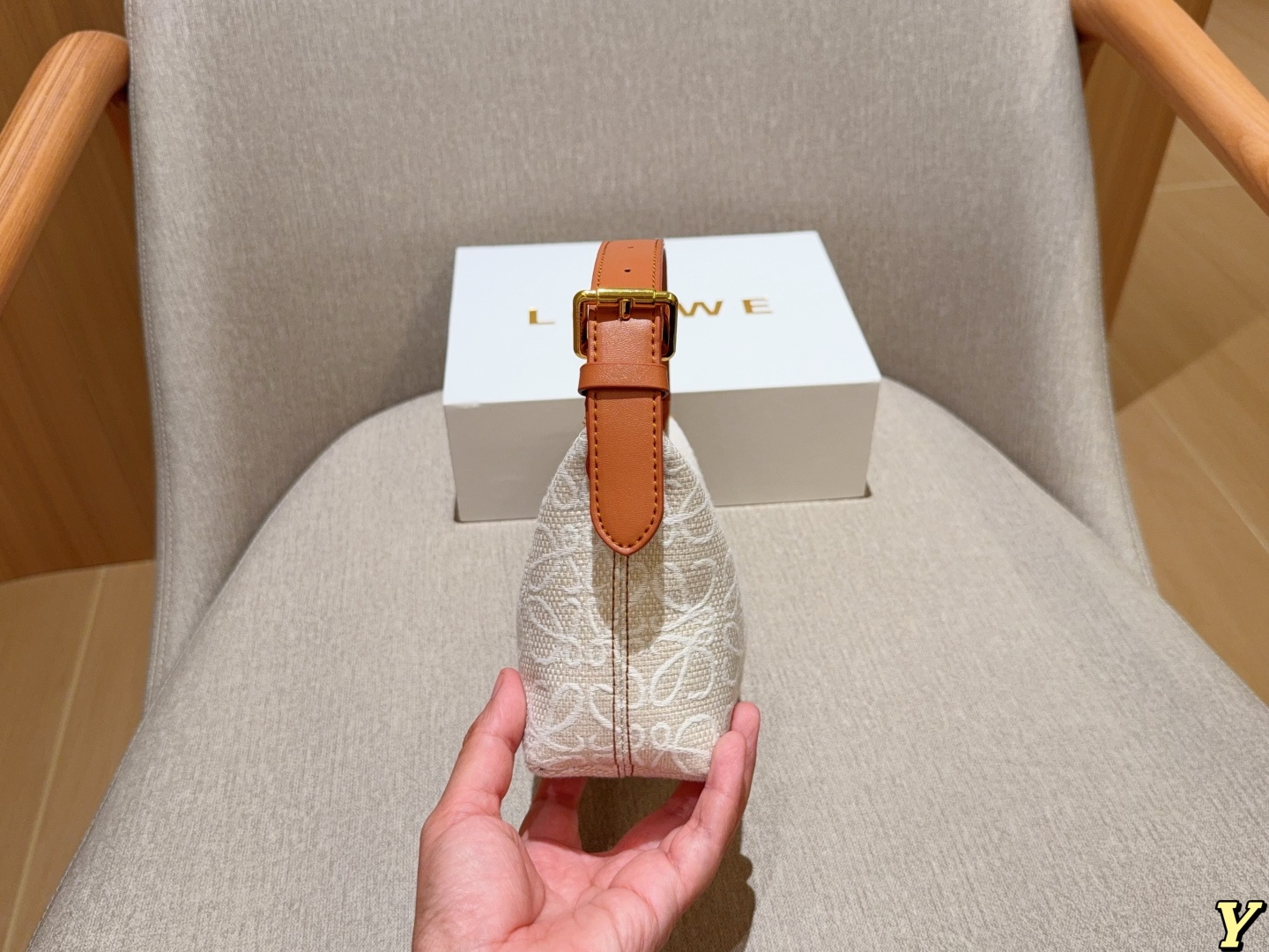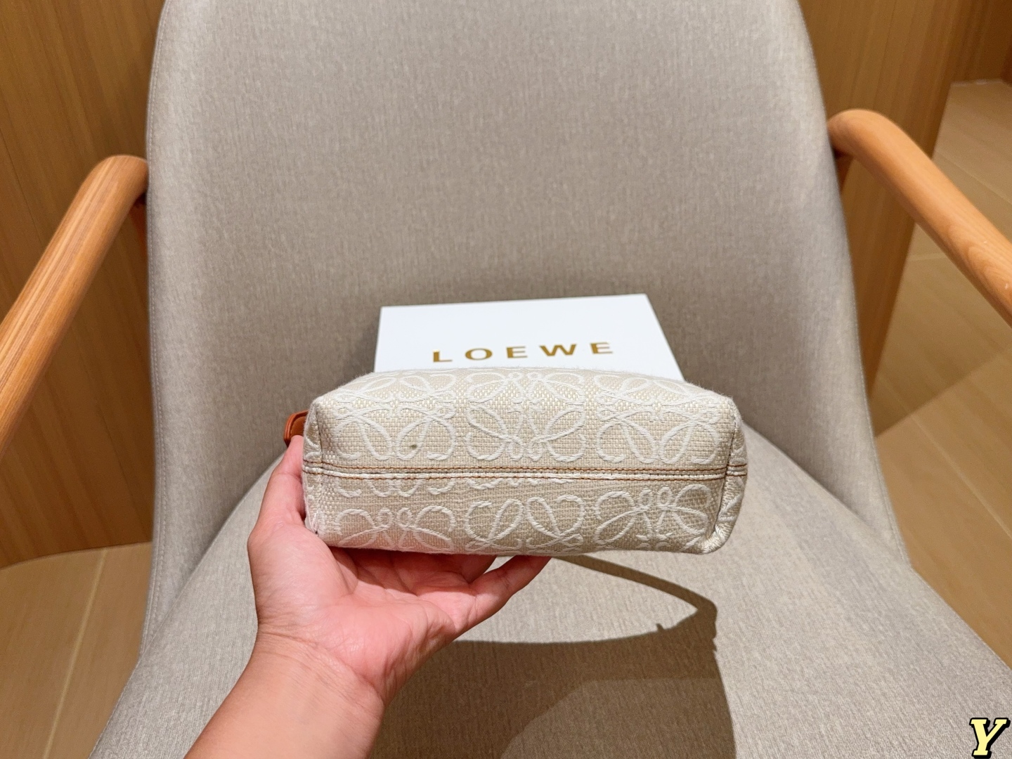 柔らかなホワイトのキャンバス地に、ロエベの象徴的なロゴが繊細にプリントされています。