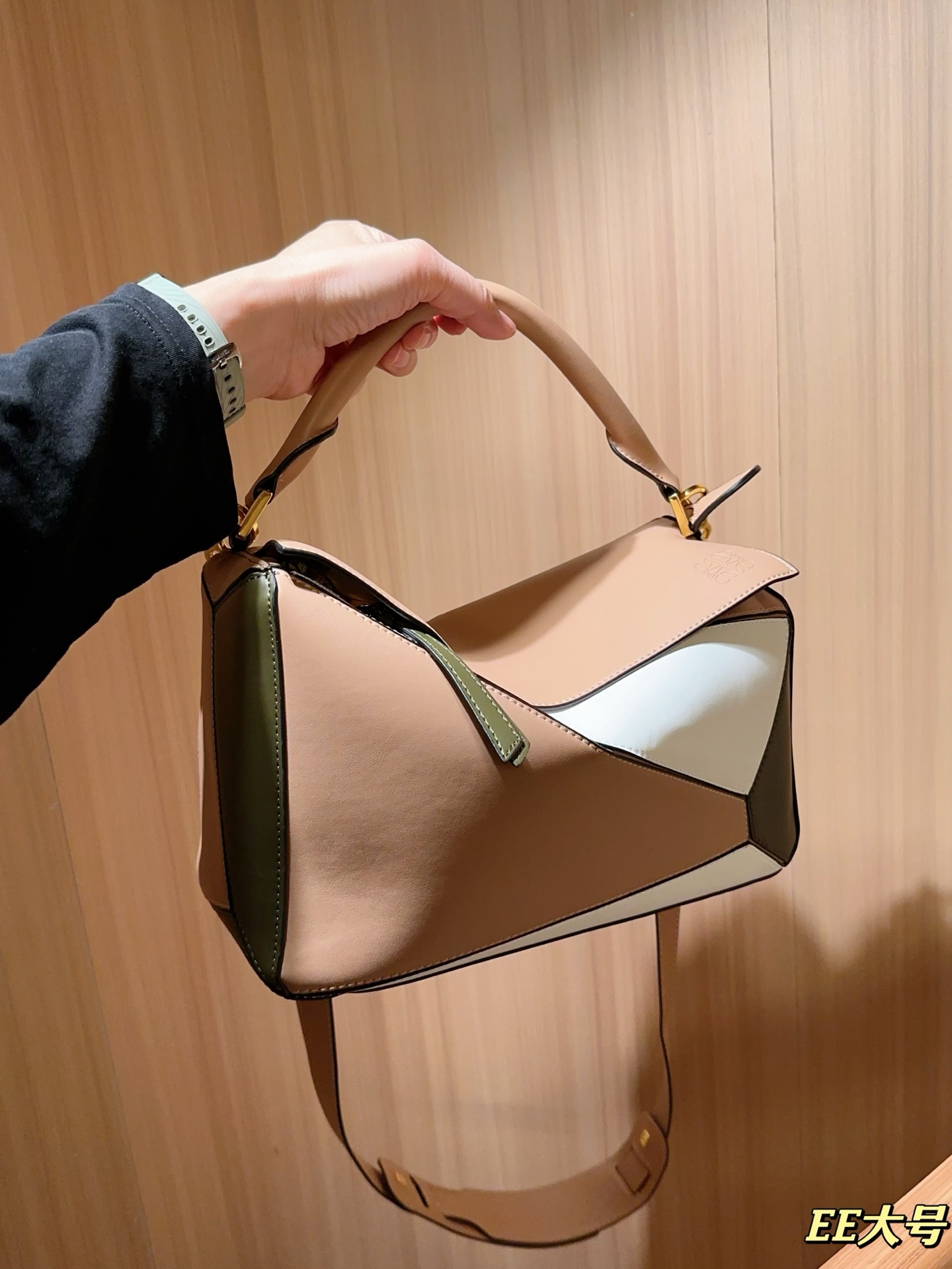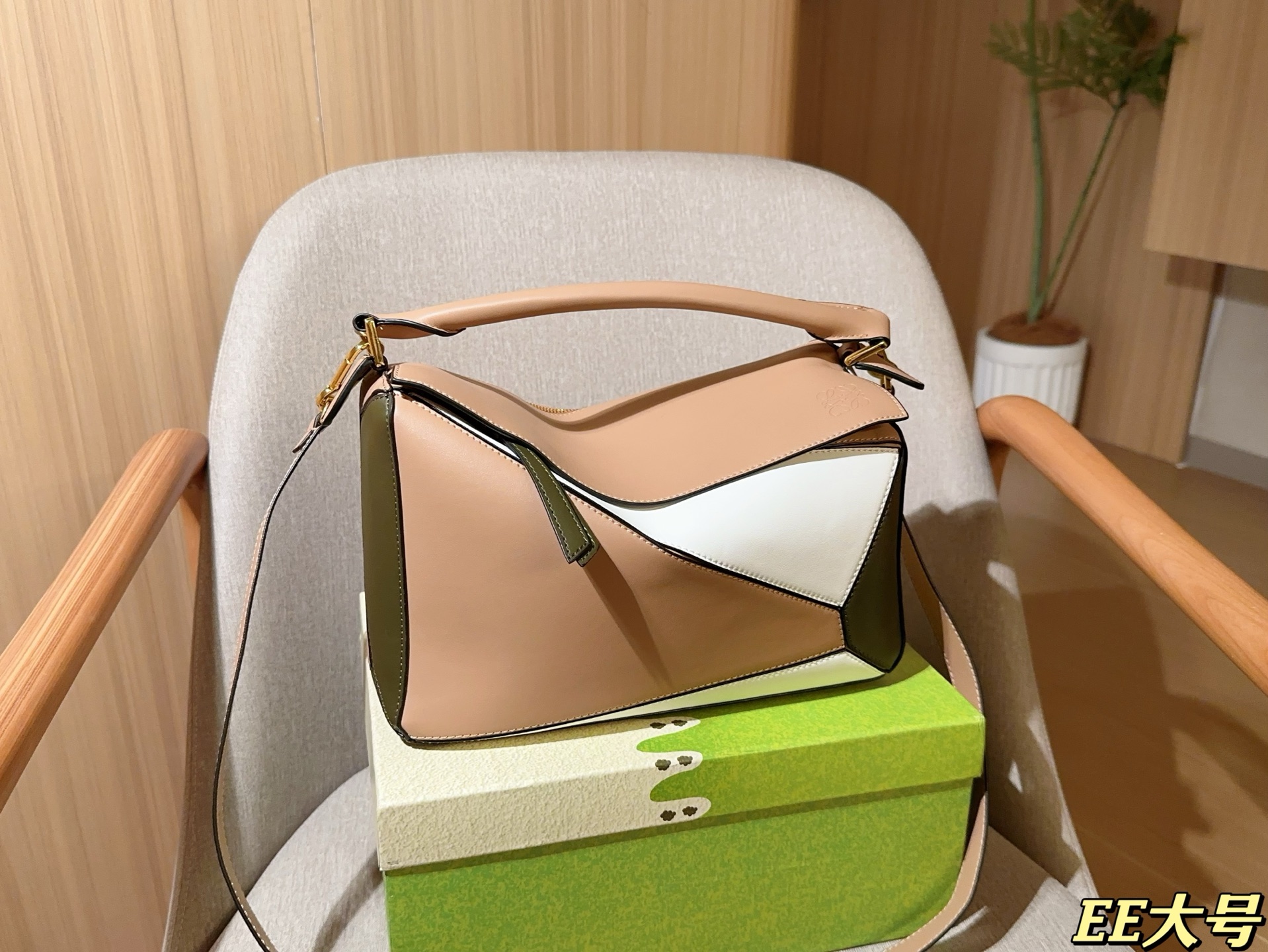 このトートバッグは、ピンクベージュ、ホワイト、オリーブグリーンの3色ブロックデザインが特徴です。高品質なレザーを使用し、光沢感と質感が抜群です。金色の金具がエレガントさを引き立て、洗練された印象を与えます。