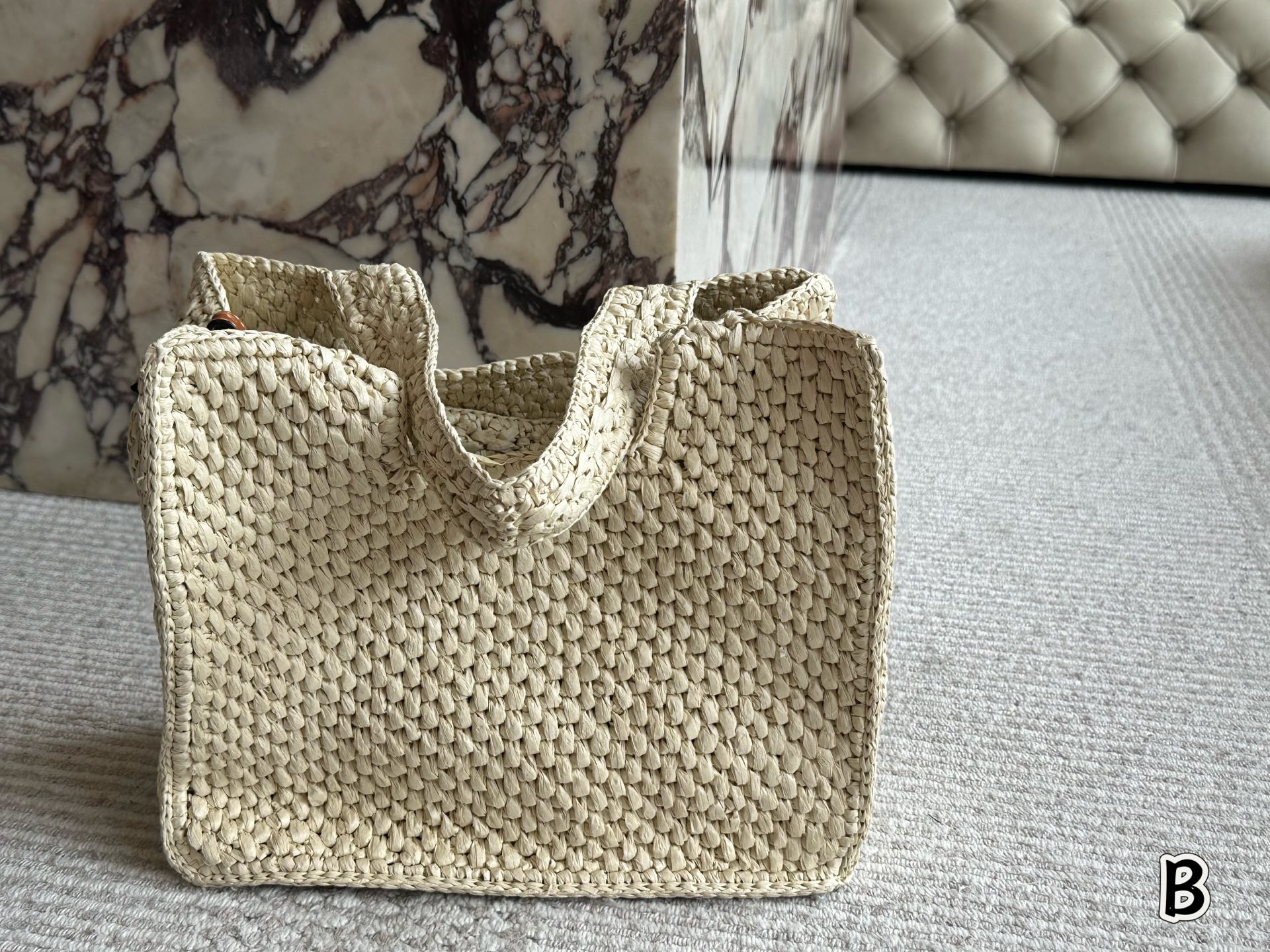 ロエベの草編みトートバッグは、ナチュラルな色合いの編み地と、ブラウンの本革ハンドルが絶妙なコントラストを生み出しています。前面には黒いロゴ刺繍が施され、ブランドのアイデンティティを強調。手に取ると、編み目の質感が心地よく、夏の日差しを浴びてより一層引き立つ一品です。