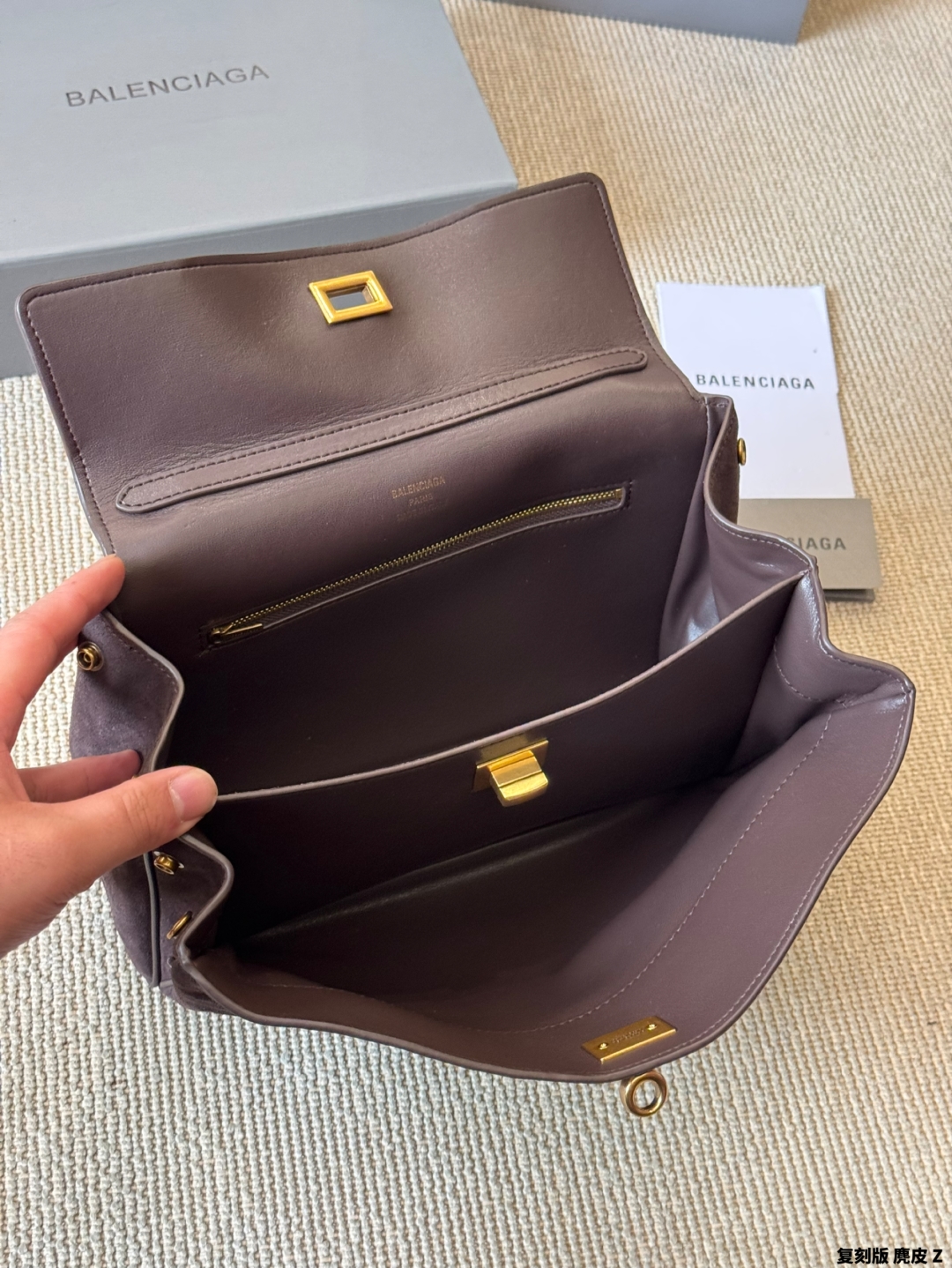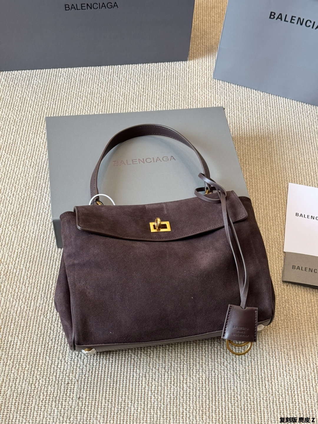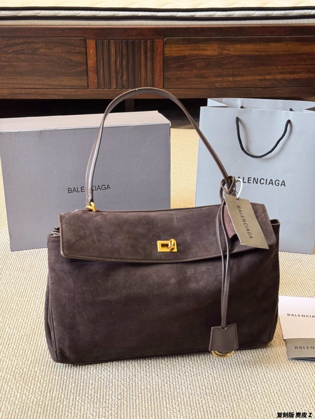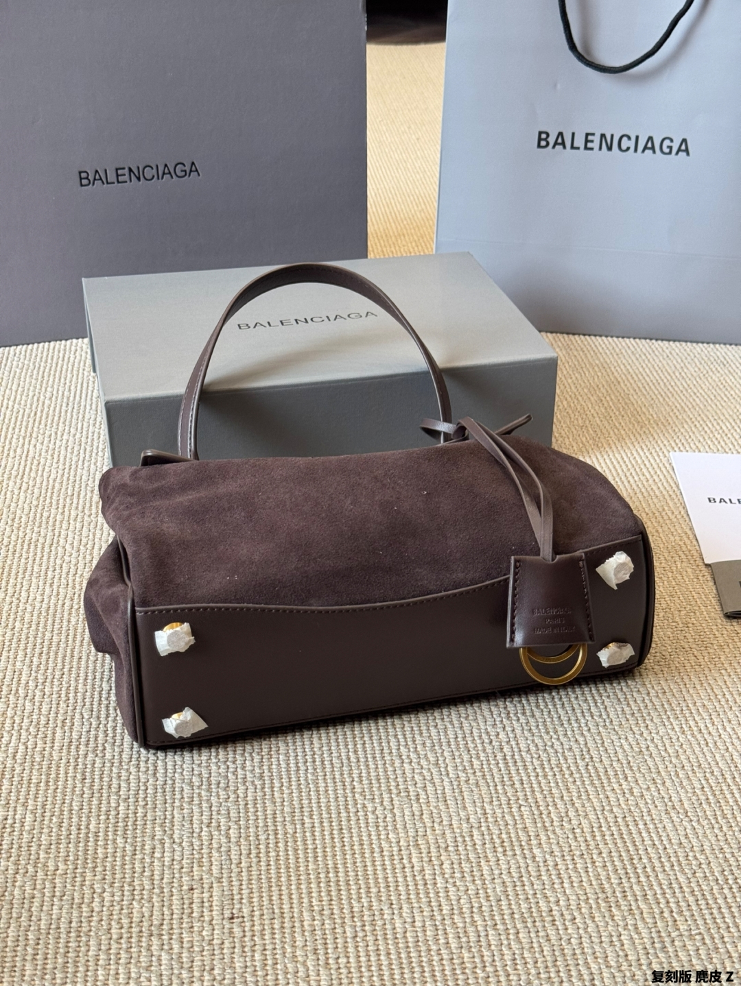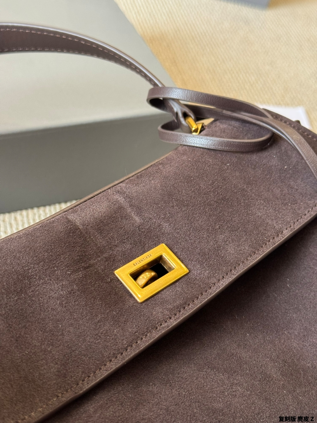 バレンシアガのデイリーバッグ、ブラウン色。スエード素材の質感が上品で、ゴールドの金具がエレガントなアクセントになります