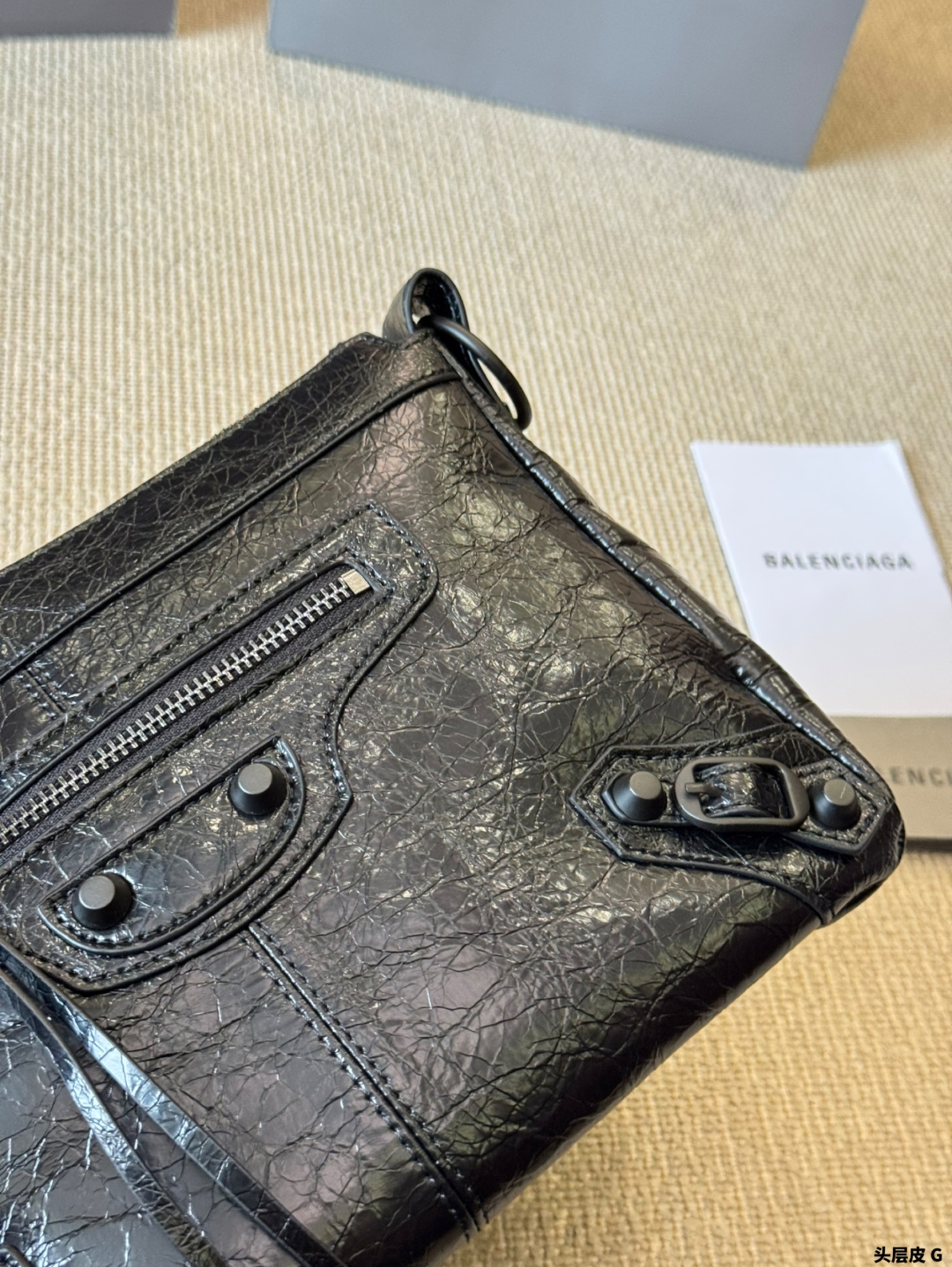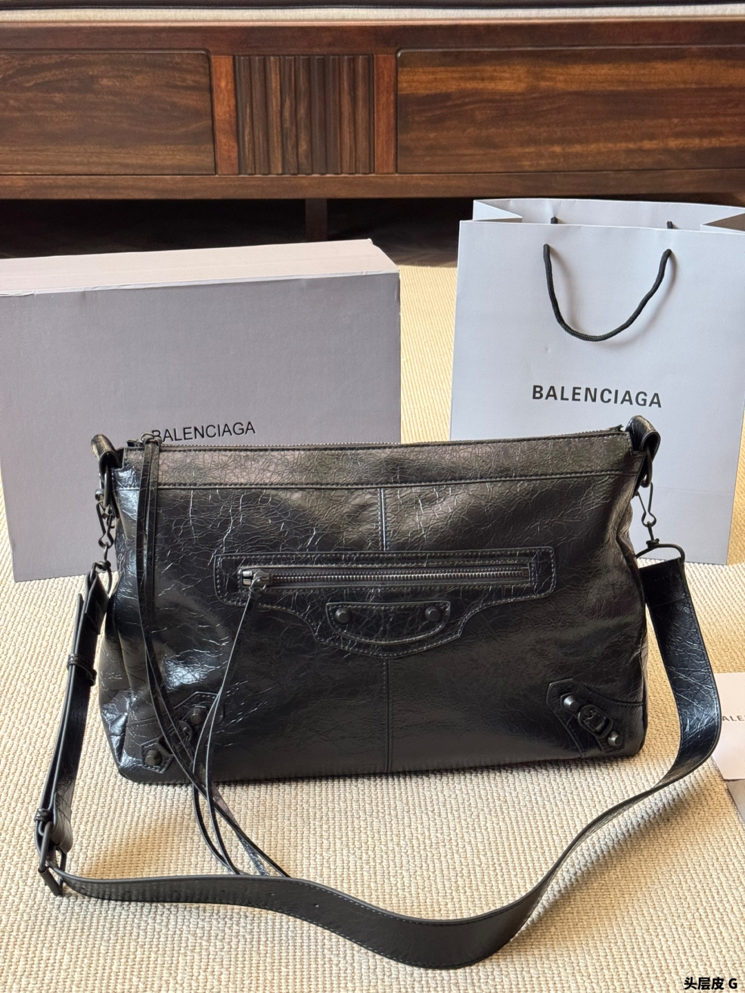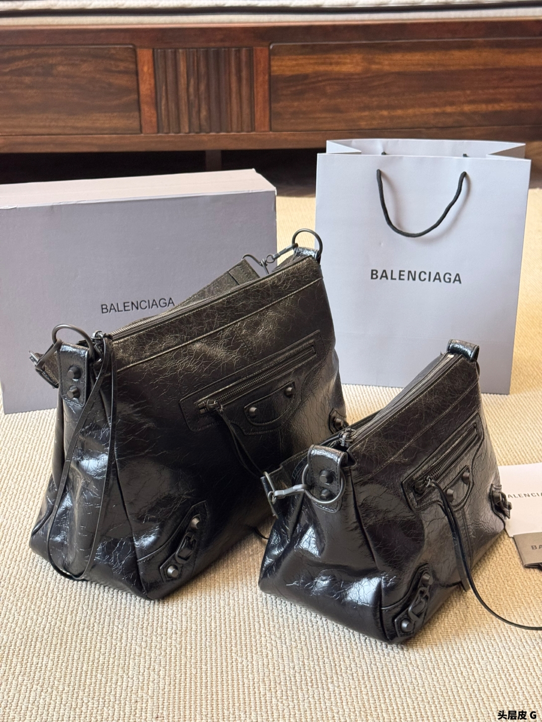 バレンシアガのレディースバッグ、ブラックの2点セットです。 画像を見ると、クラシックなデザインに独特のシワ加工が施されたレザーが特徴的ですね。見た目は洗練されつつも、ちょっとしたカジュアルさも感じさせる、大人の女性にぴったりの1枚です。
