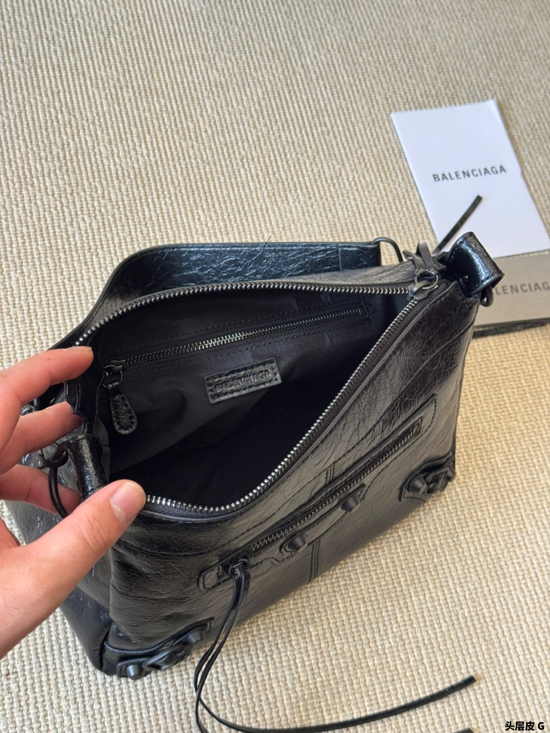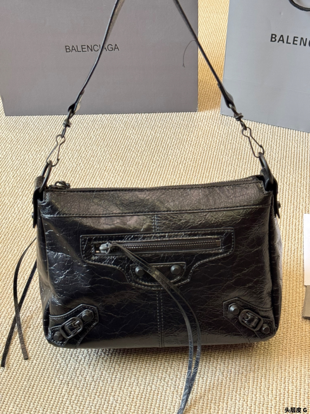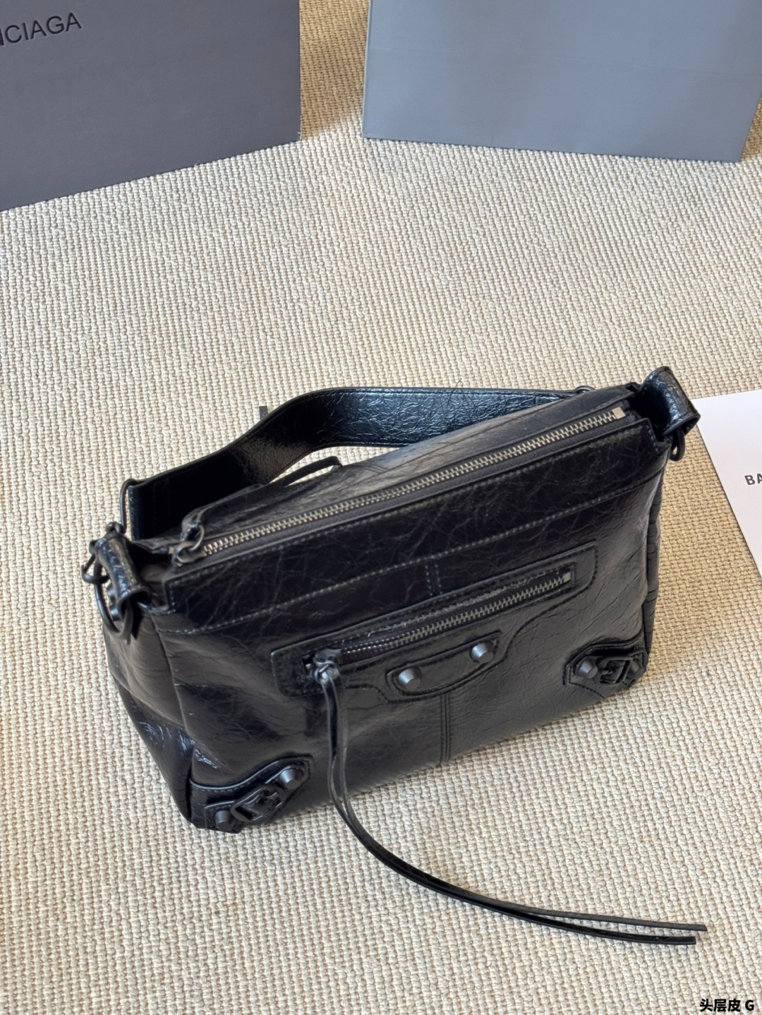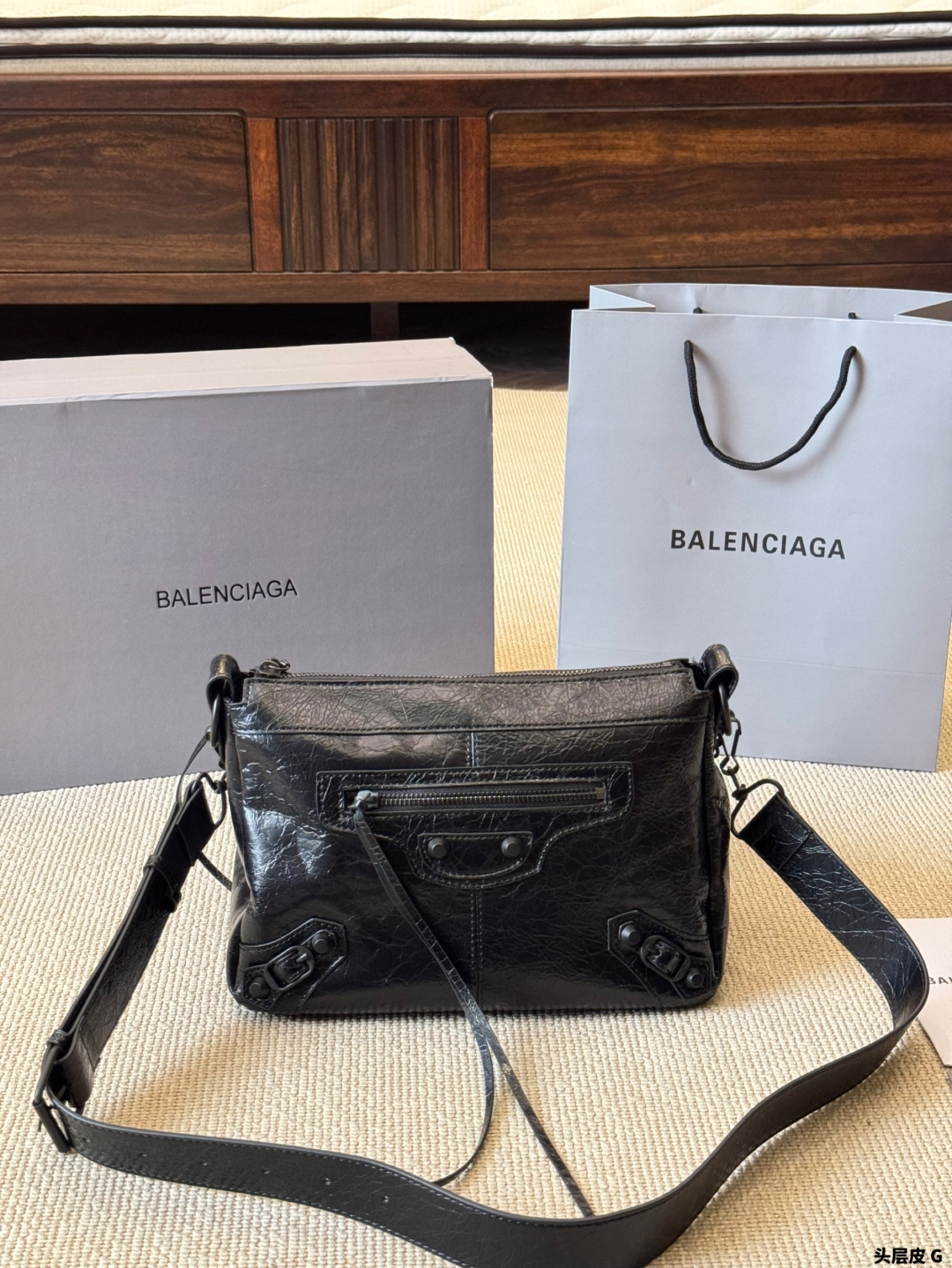 バレンシアガのレディースバッグ、ブラックの2点セットです。 画像を見ると、クラシックなデザインに独特のシワ加工が施されたレザーが特徴的ですね。見た目は洗練されつつも、ちょっとしたカジュアルさも感じさせる、大人の女性にぴったりの1枚です。