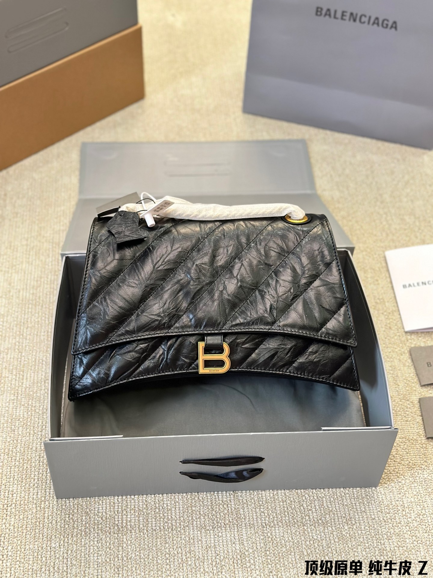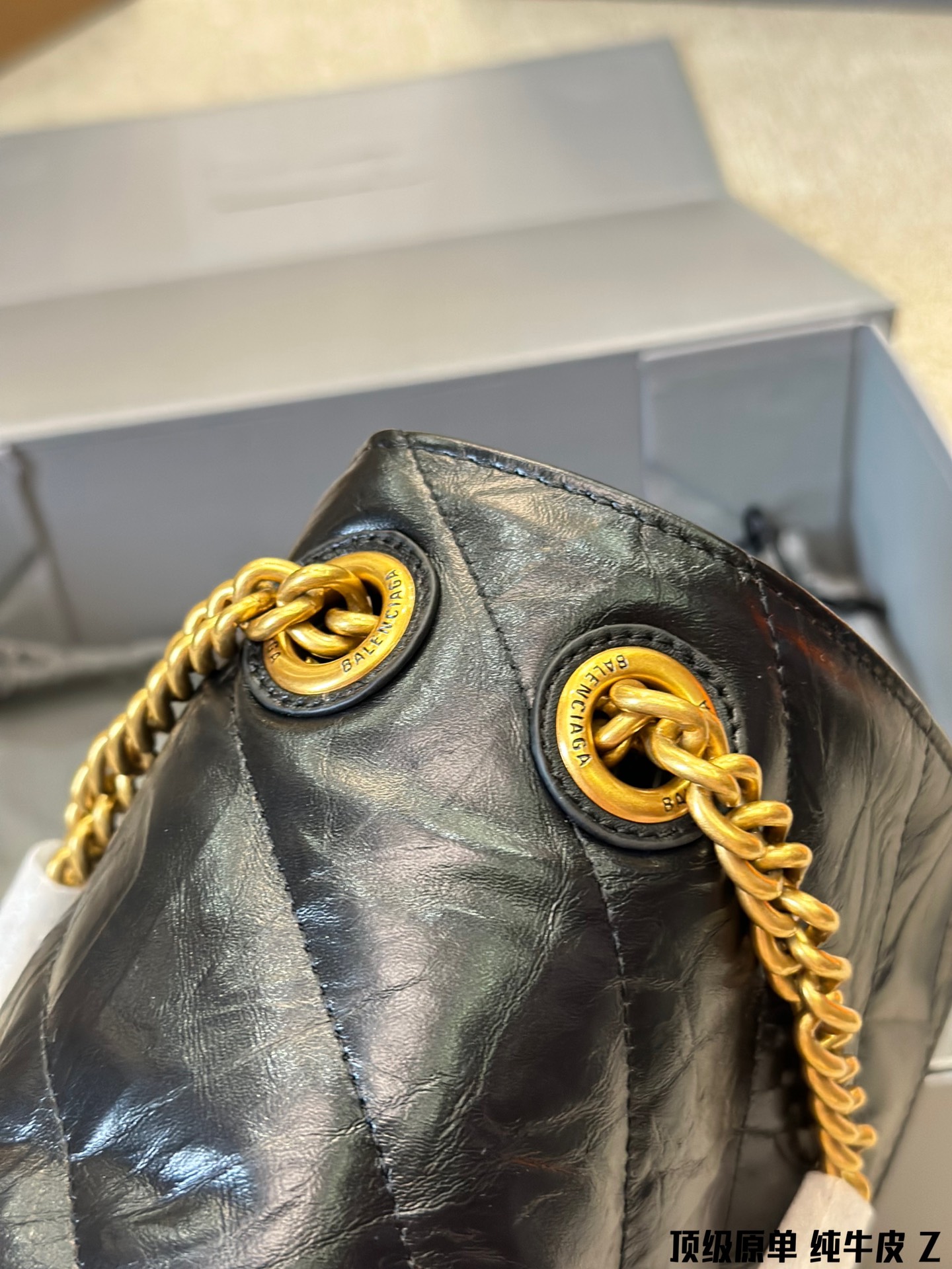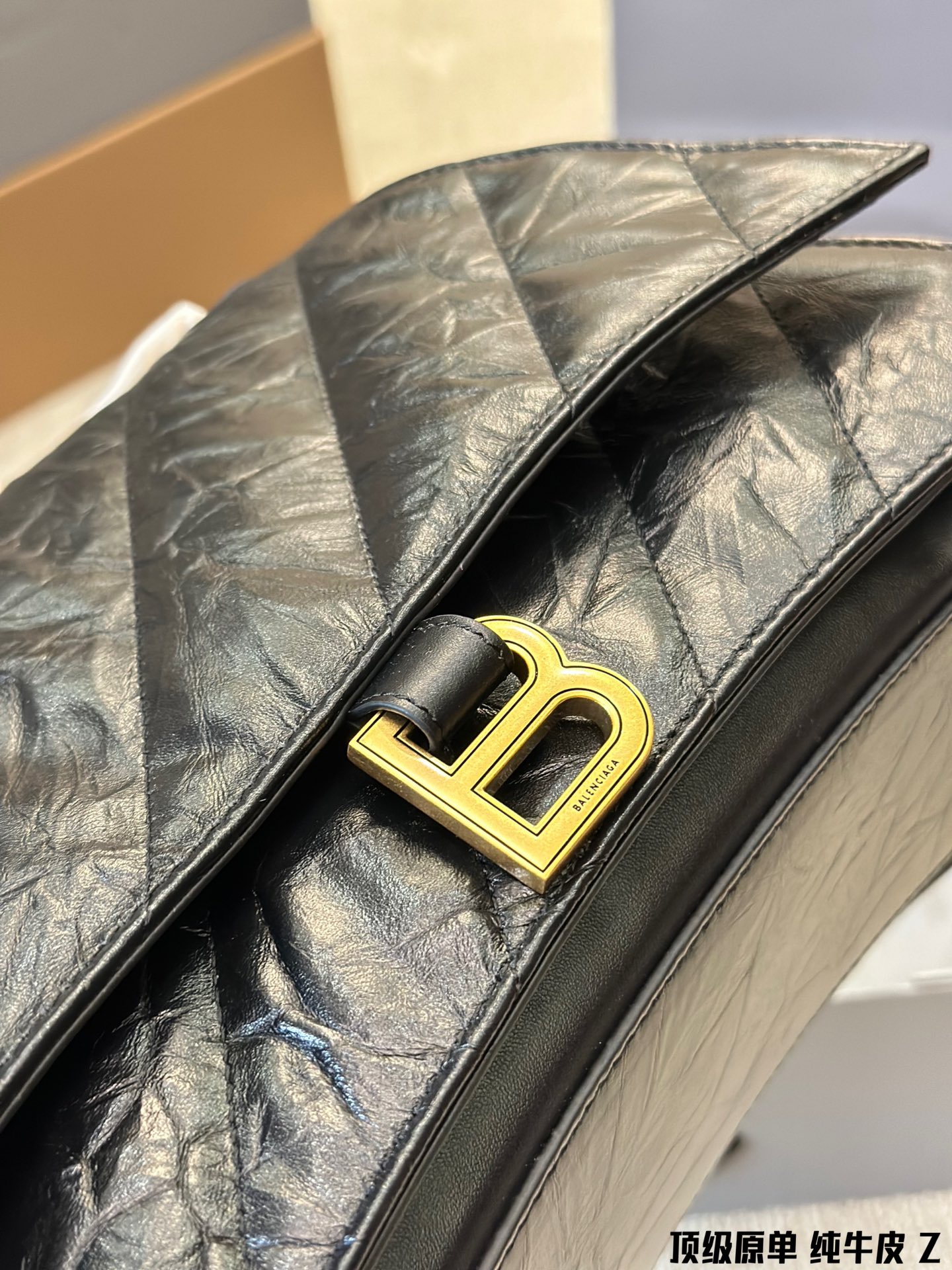 このバレンシアガのバッグは、黒色のクレープ加工を施した本革を使用しており、独特なシワ感が特徴です。