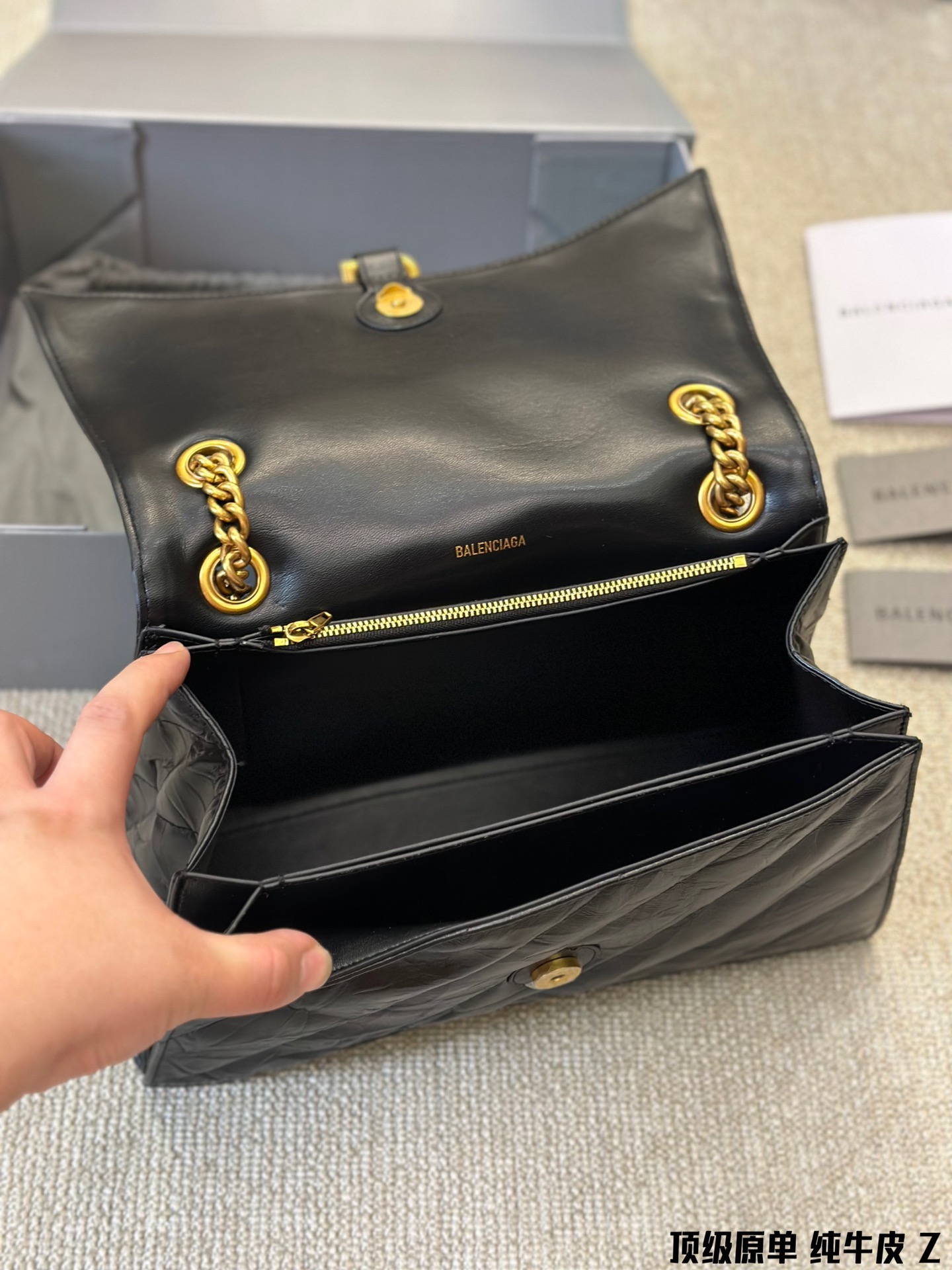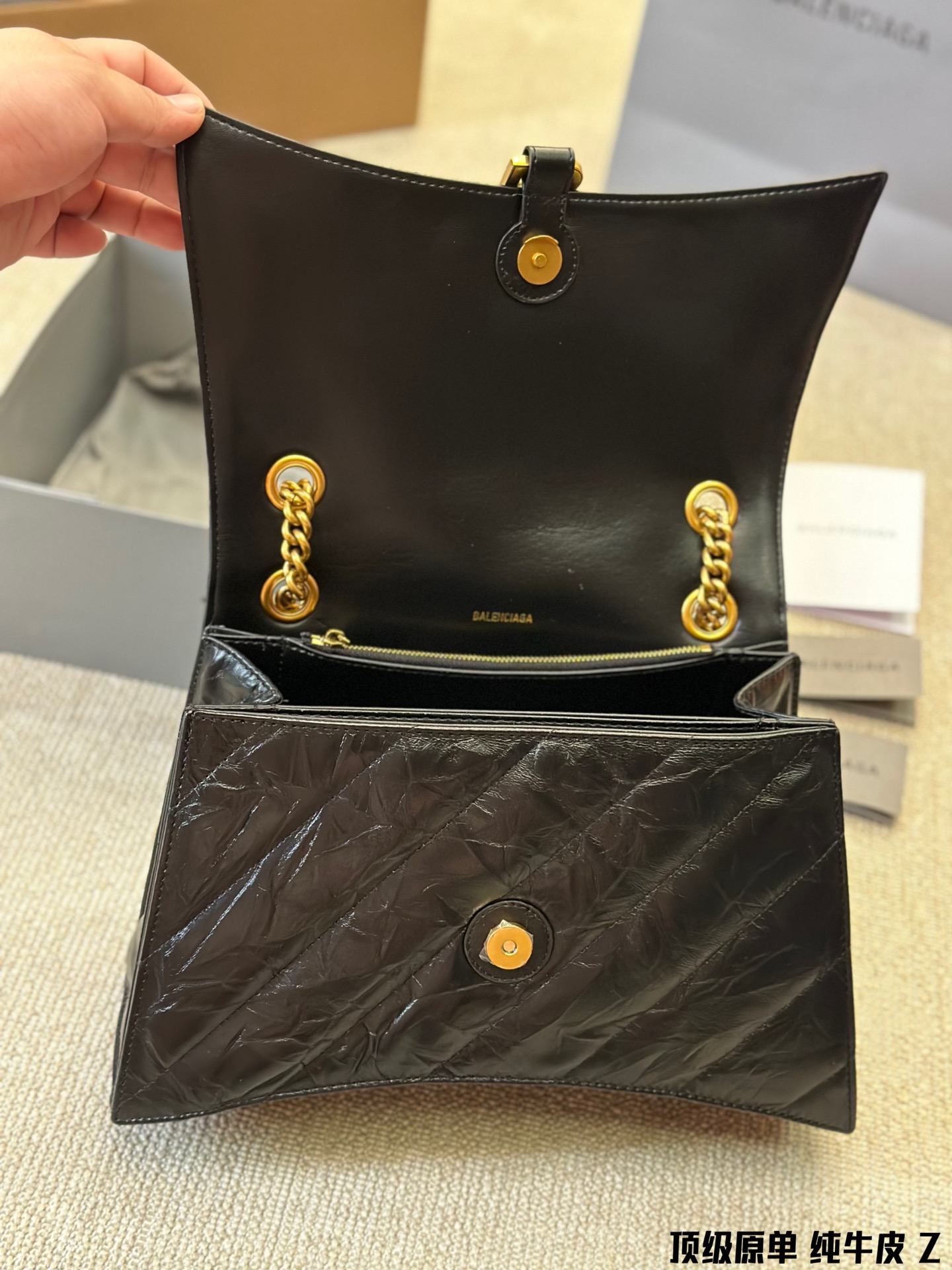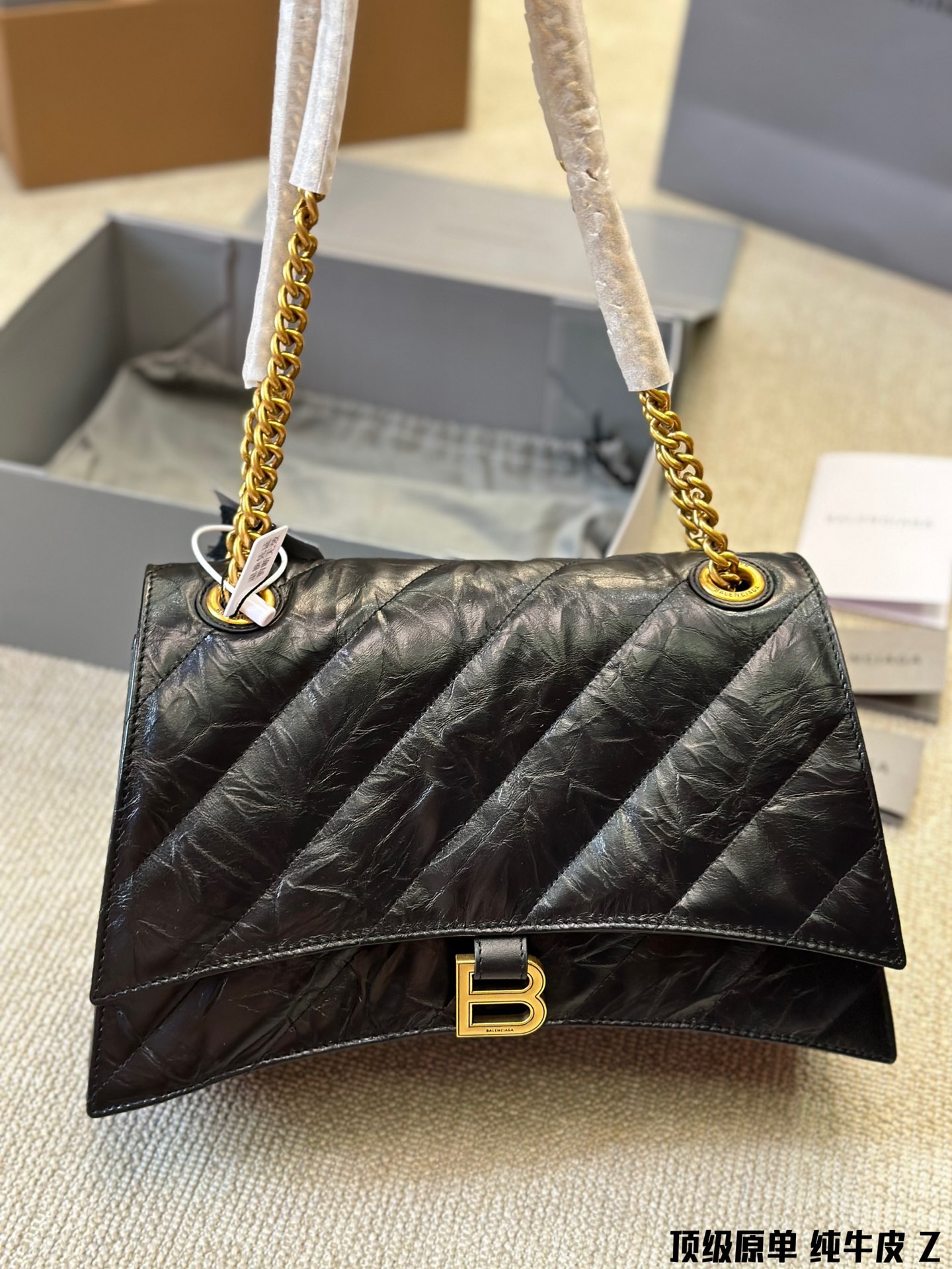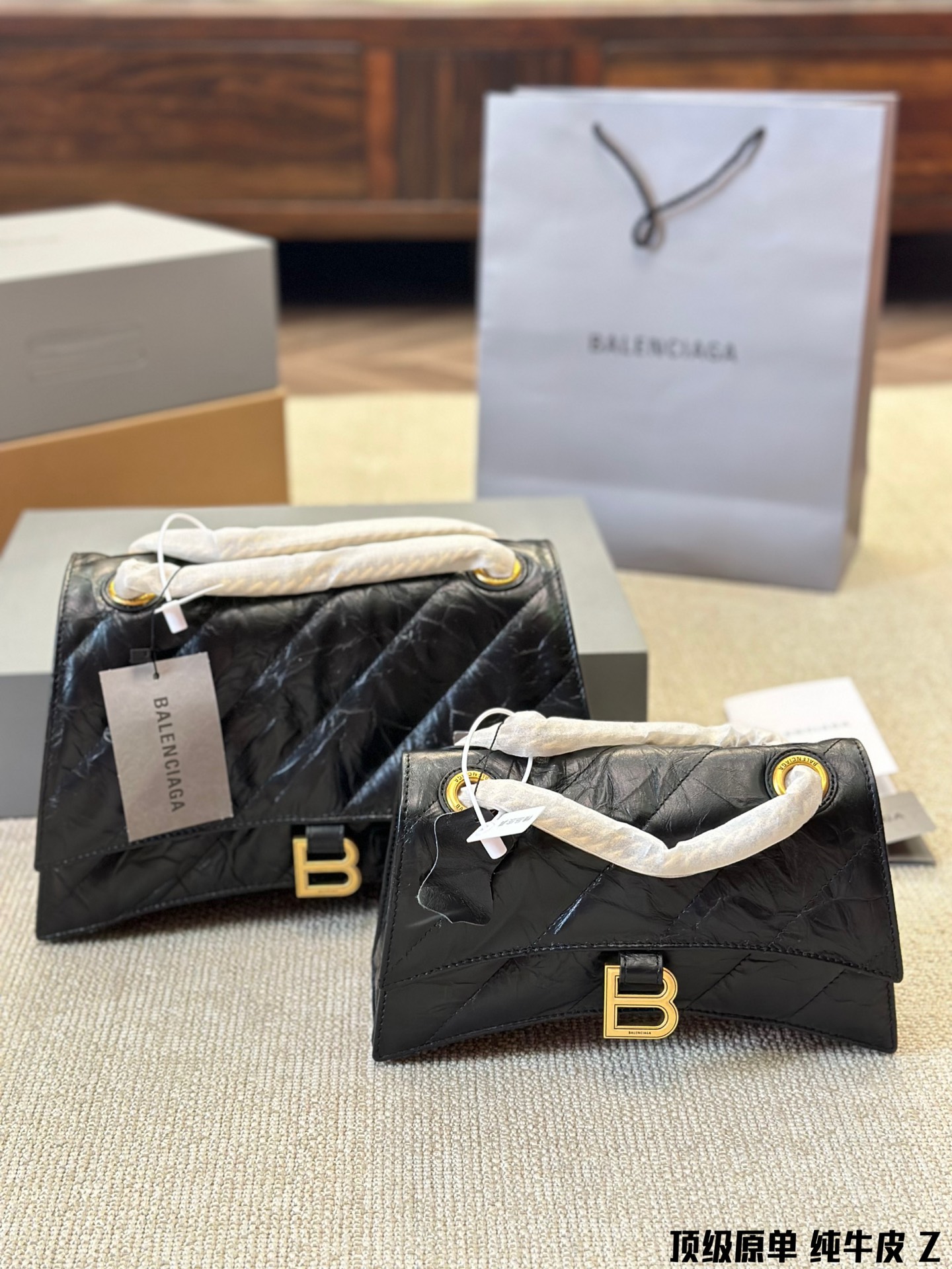 このバレンシアガのバッグは、黒色のクレープ加工を施した本革を使用しており、独特なシワ感が特徴です。